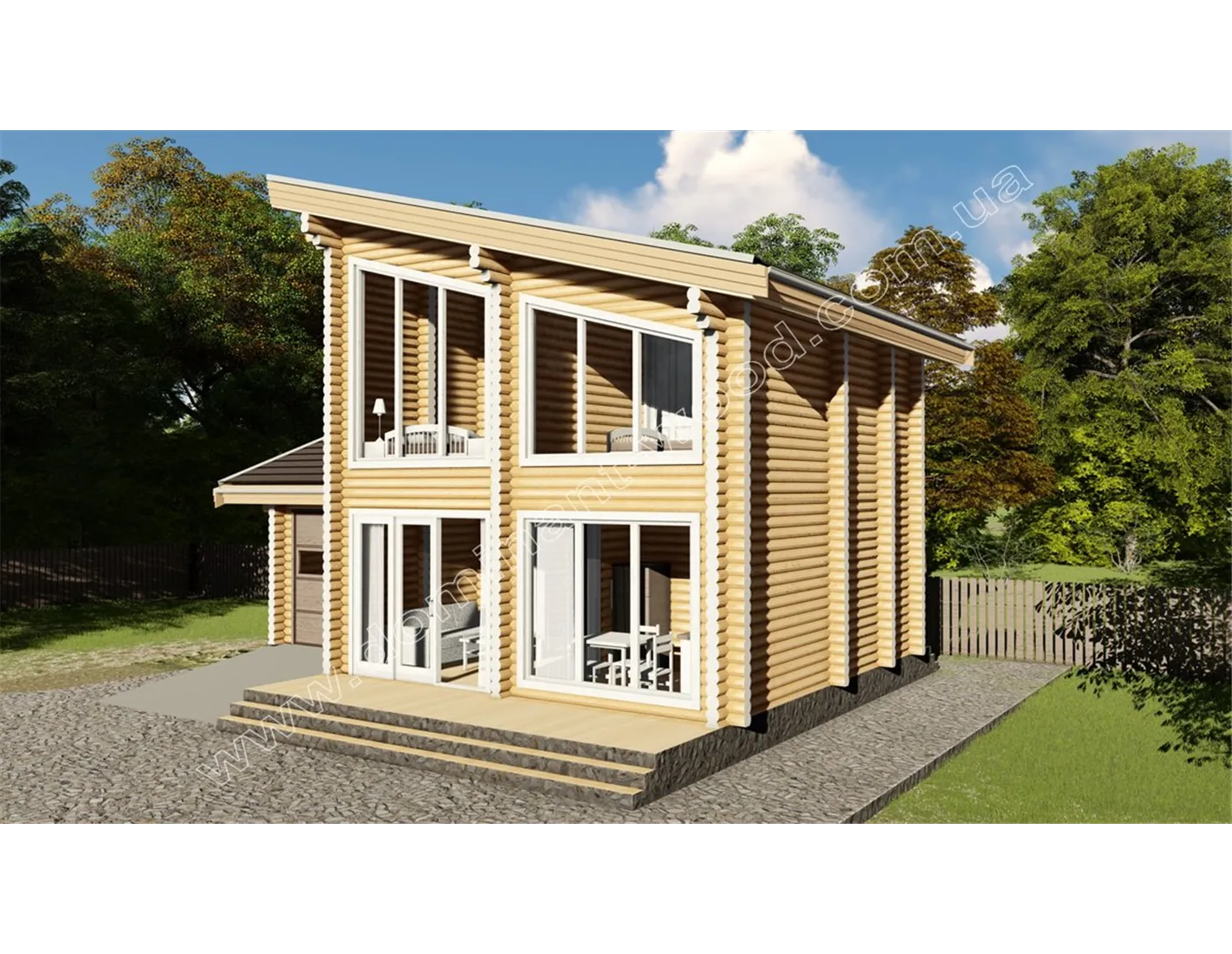 Надзвичайно красивий будинок «Грімар» просто зачаровує з першого погляду. Відкритий для світу і сонця котедж з колод просто випромінює затишок завдяки величезним панорамним вікнам. Вікна займають майже весь головний фасад будівлі. Такий котедж відразу налаштовує на відпочинок і приємне дозвілля, а також обов’язково повинен бути встановлений в мальовничому куточку природи, яку можна буде споглядати з будь-якого куточка котеджу. З особливостей проекту «Грімар» також варто підкреслити односхилий дах, візуально високу висоту поверхів і наявність гаража.
