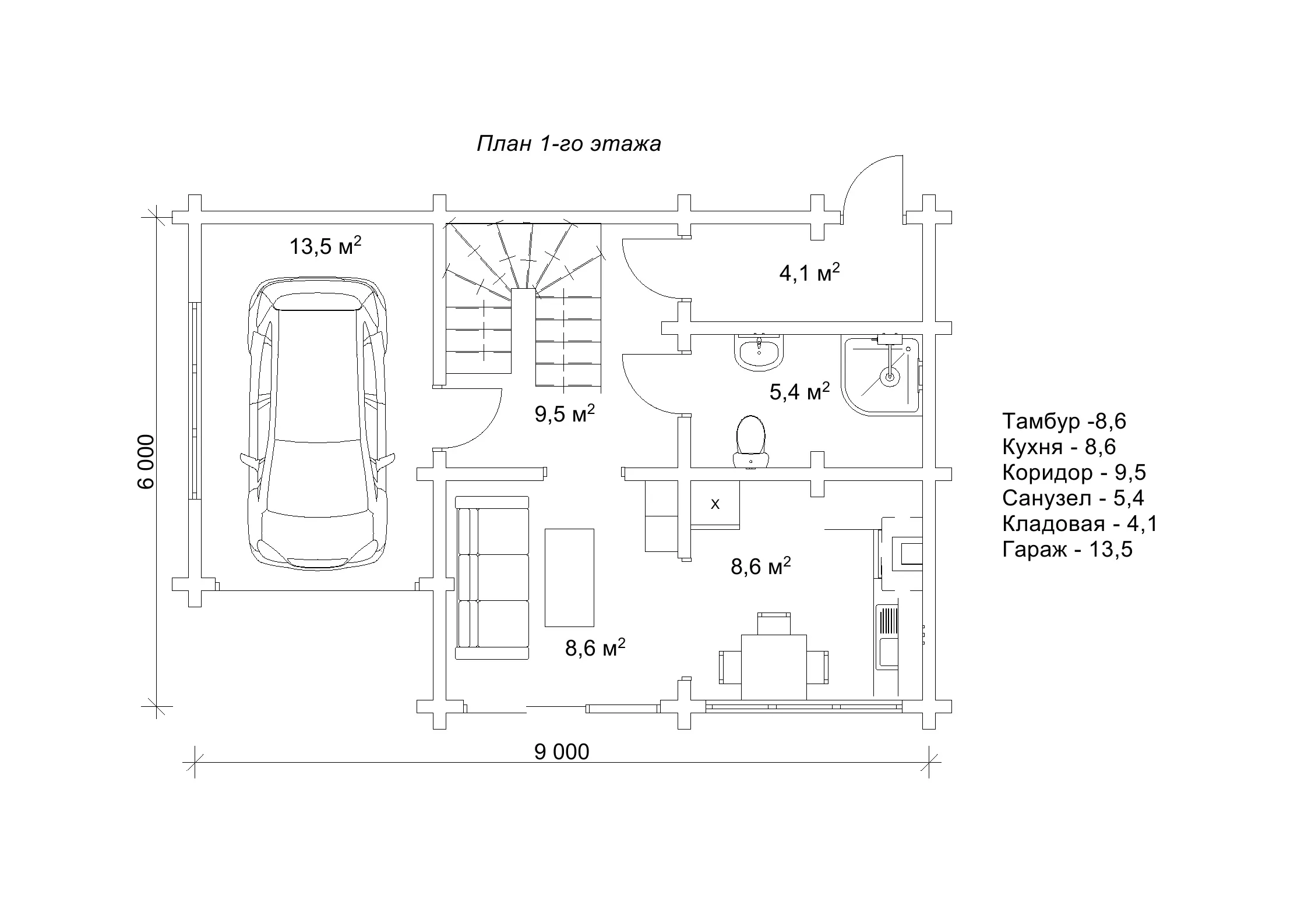 Параметри забудови проекту «Гримар» разом з гаражем складають 6 на 9 м. Загальна площа досить компактна: 79,8 м2. Планування дуже зручне завдяки прибудові гаража з місцем під один автомобіль. Будь-якому власникові авто сподобається, що йому можна проникнути в гараж прямо з дому, не залишаючи теплих приміщень. На першому поверсі спроектовані кухня, передпокій, санвузол і комора. На другому поверсі є дві спальні і зал. Це дуже зручний будиночок для сімейної, літньої резиденції. Велика площа скління і планування кімнат заміської вілли говорять про те, що сюди можна приїжджати у відпустку, спокійно залишати автомобіль в спеціально призначеному місці і насолоджуватися близькістю природи через великі, панорамні вікна.