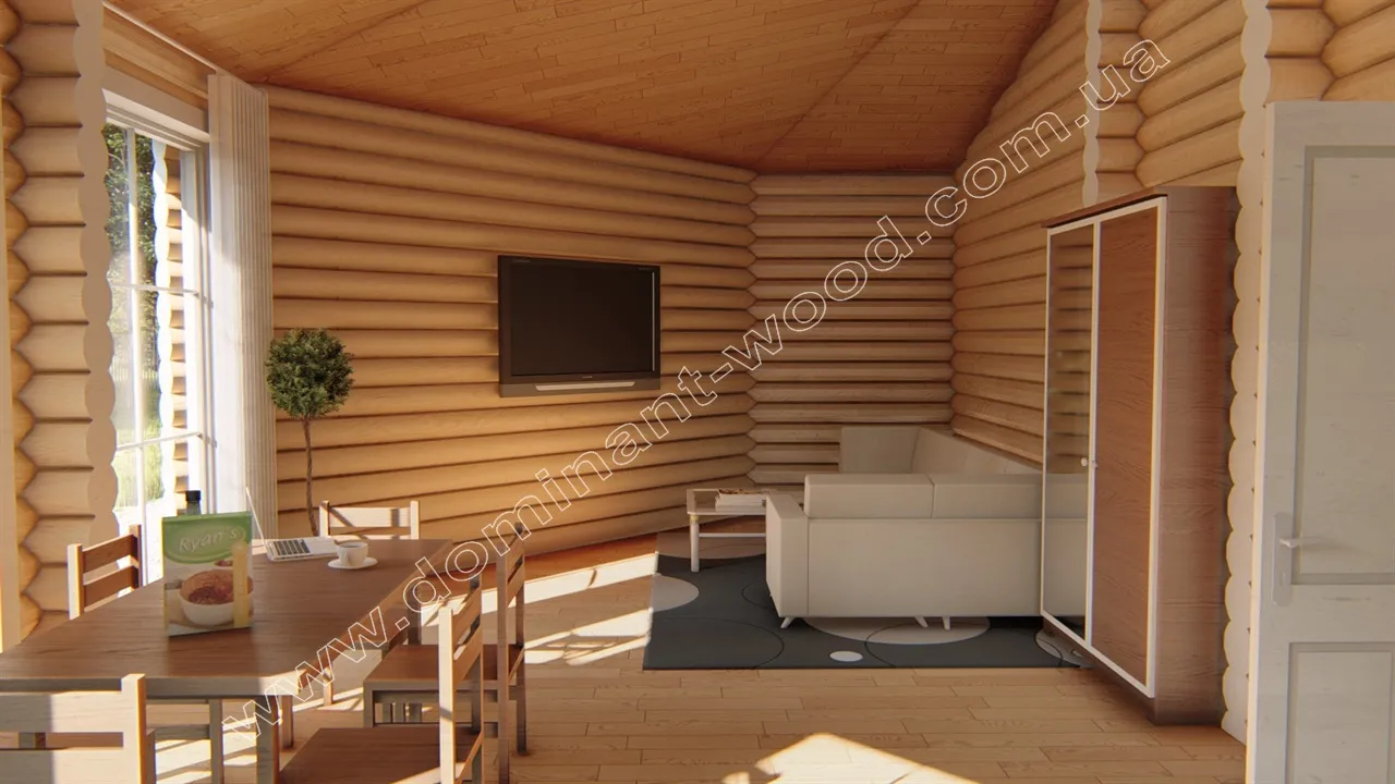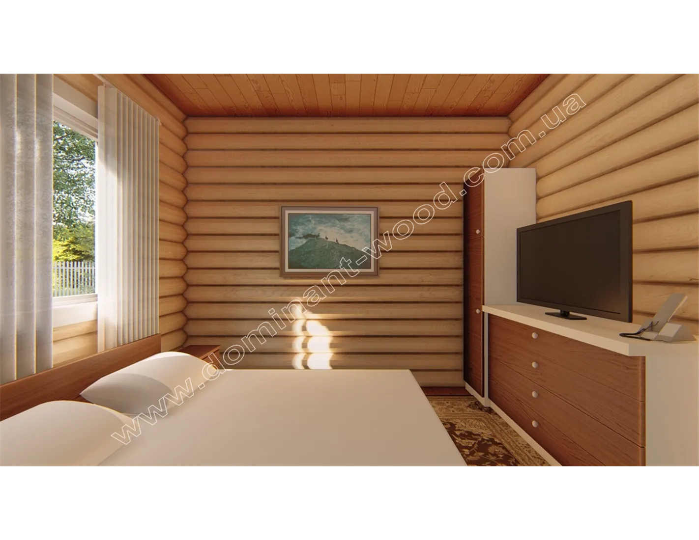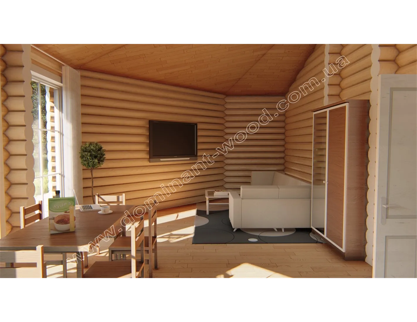 Одноповерховий будинок-зруб «Лоя» з оциліндрованих колод можна було б віднести до типових проектів «Домінант» за рахунок затребуваних розмірів. Площа котеджу складає 97 м2, і, як правило, більшість замовників запитує саме будинок на 100 м2. Але оригінальна форма будівлі все ж таки дозволяє виділити її з типових проектів, як нестандартне та оригінальне проектне рішення. Великі вікна від підлоги до стелі додають особливої чарівності незвичайній, трапецієподібній формі будівлі. Завдяки поєднанню стандартного планування та незвичайного дизайну, цей котедж з оциліндрованих колод можна вигідно використовувати в комерційних цілях як гостьовий котедж або заміську віллу, крім того цей компактний і дуже зручний будиночок буде гарним вибором для постійного проживання.