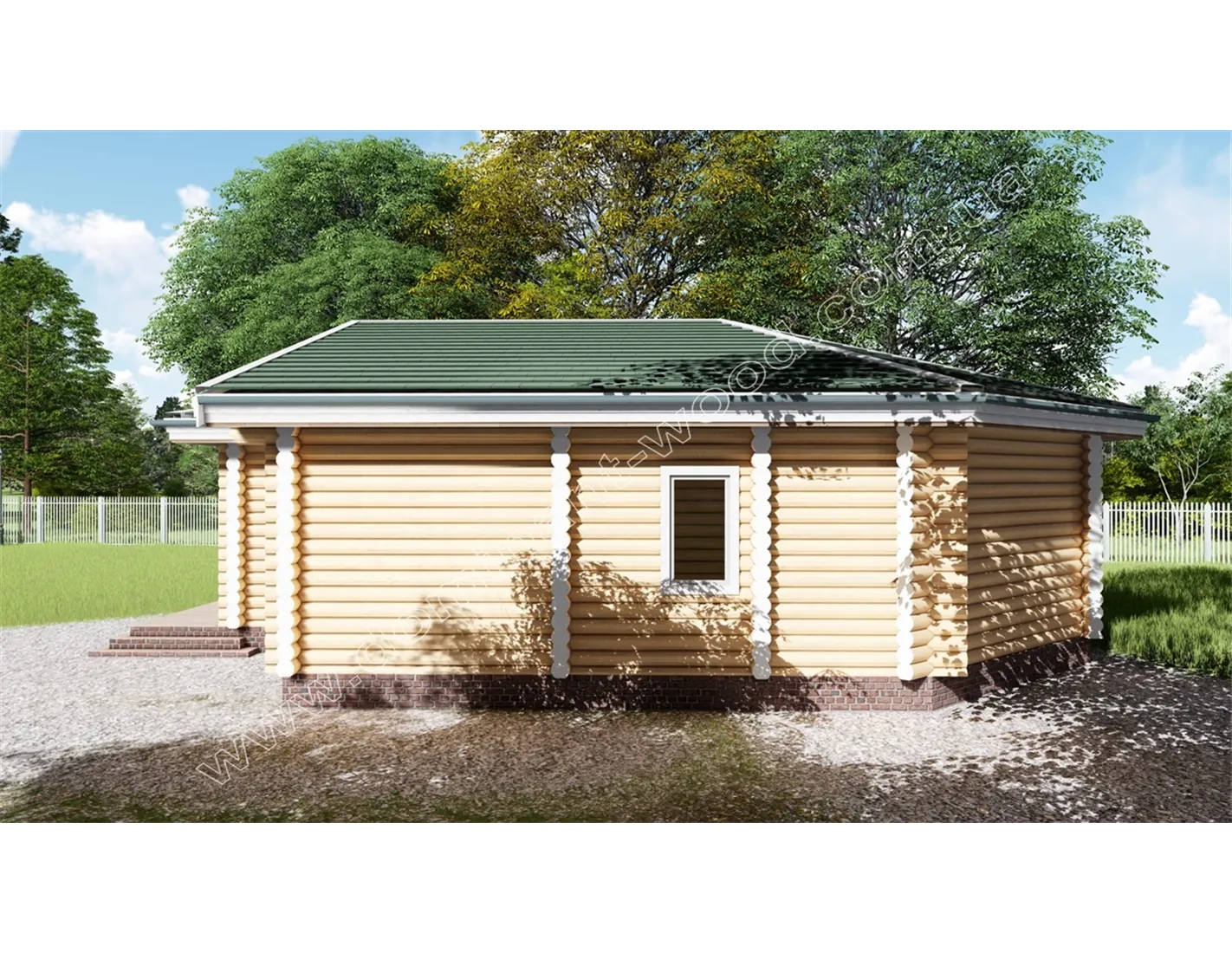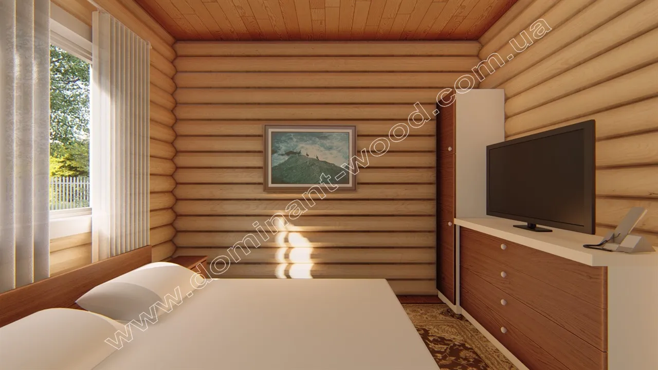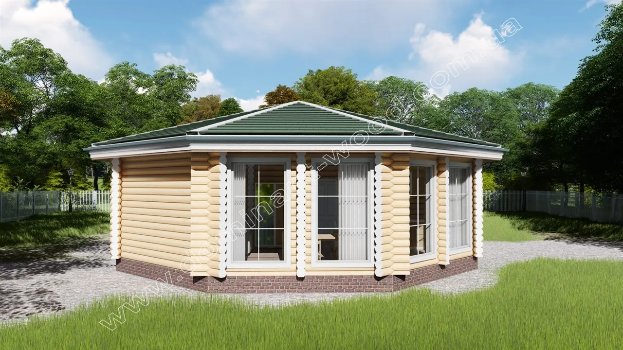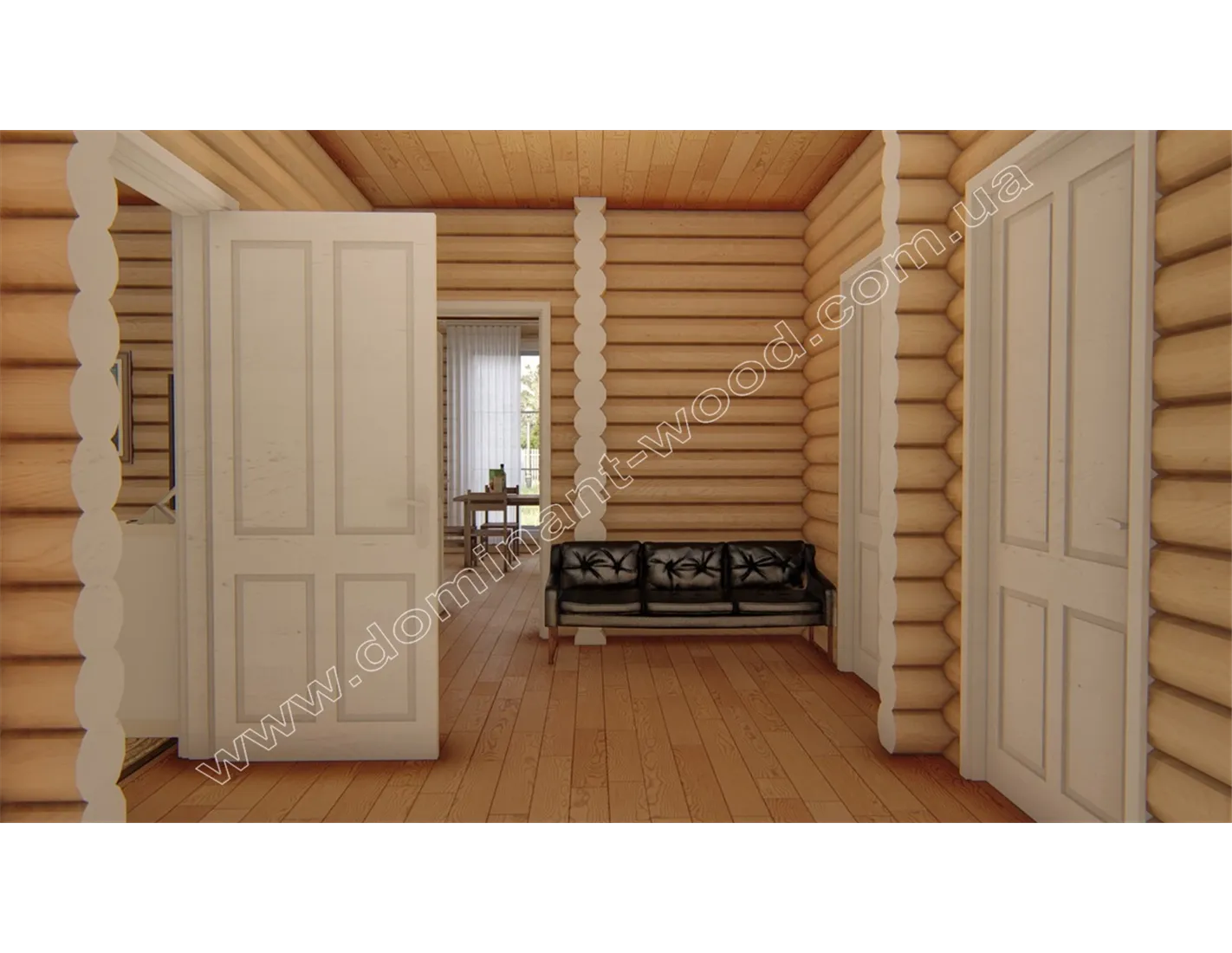 Одноповерховий будинок-зруб «Лоя» з оциліндрованих колод можна було б віднести до типових проектів «Домінант» за рахунок затребуваних розмірів. Площа котеджу складає 97 м2, і, як правило, більшість замовників запитує саме будинок на 100 м2. Але оригінальна форма будівлі все ж таки дозволяє виділити її з типових проектів, як нестандартне та оригінальне проектне рішення. Великі вікна від підлоги до стелі додають особливої чарівності незвичайній, трапецієподібній формі будівлі. Завдяки поєднанню стандартного планування та незвичайного дизайну, цей котедж з оциліндрованих колод можна вигідно використовувати в комерційних цілях як гостьовий котедж або заміську віллу, крім того цей компактний і дуже зручний будиночок буде гарним вибором для постійного проживання.