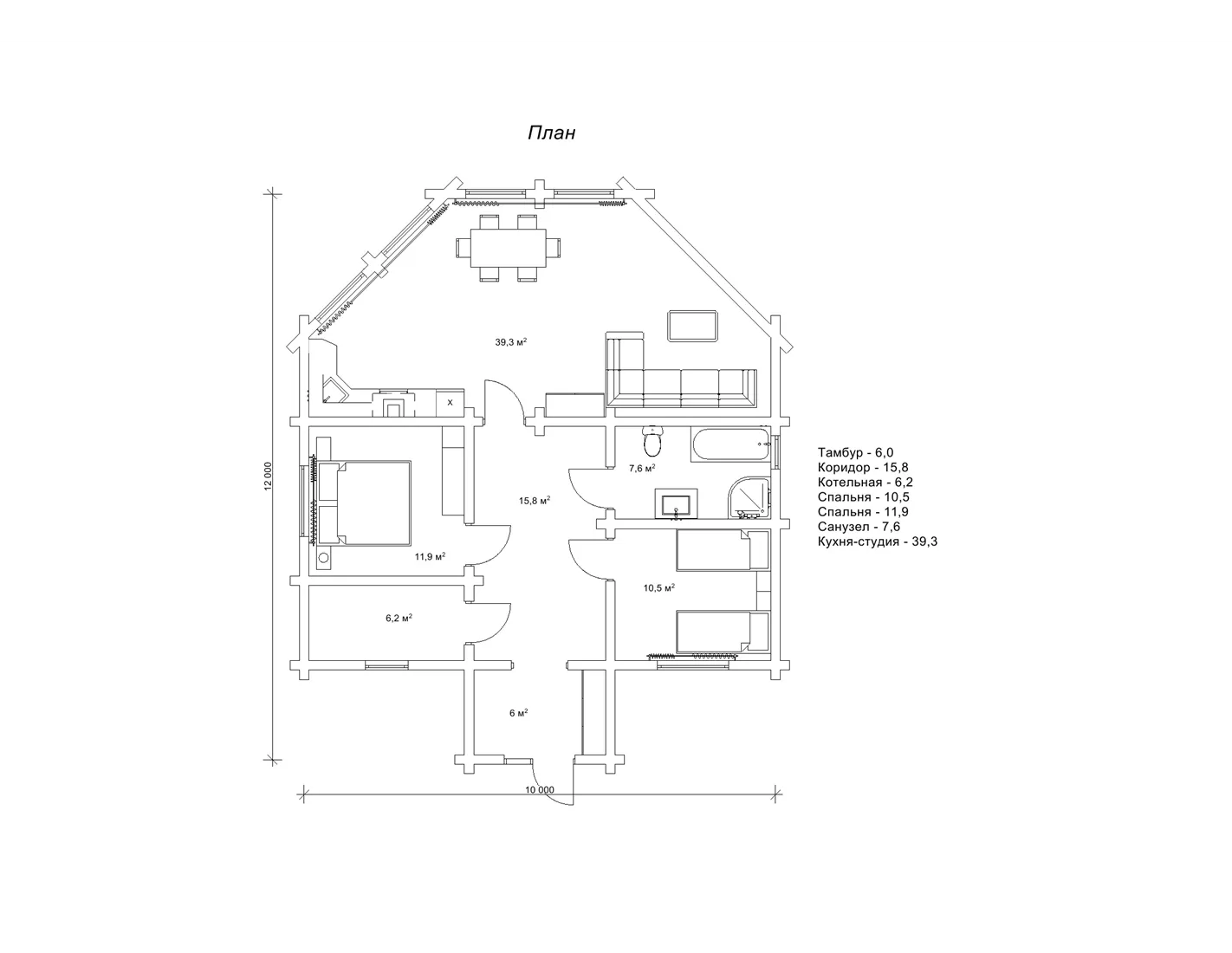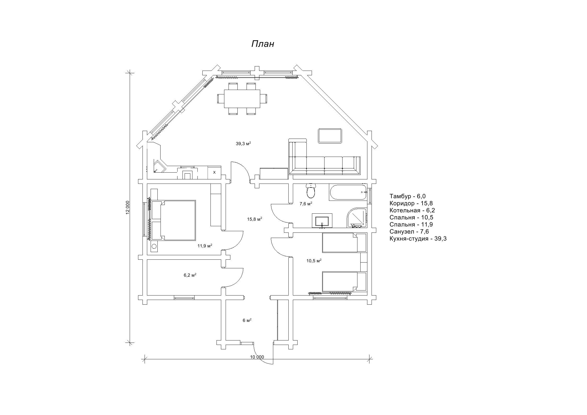 Параметри будівлі проекту «Лоя» становлять 10 на 12 м. План котеджу включає лише один поверх. Вхід у будиночок починається із тамбуру розміром 6 м2. У такому передпокої зручно вміщується шафа для верхнього одягу та вуличного взуття. Поради щодо меблювання передпокою ви знайдете в блозі нашого інтернет-магазину «Мідеро». Далі за планом котеджу йде коридор, з якого можна потрапити у дві спальні кімнати, котельню та санвузол, а найголовніше – у розкішну вітальню з кухнею та величезними вікнами, через які та приємно милуватися красою навколишньої природи. Будиночок «Лоя» на сто квадратів стане мудрим вибором для приватної території, комерційного використання та прикрасить собою будь-який ландшафт!