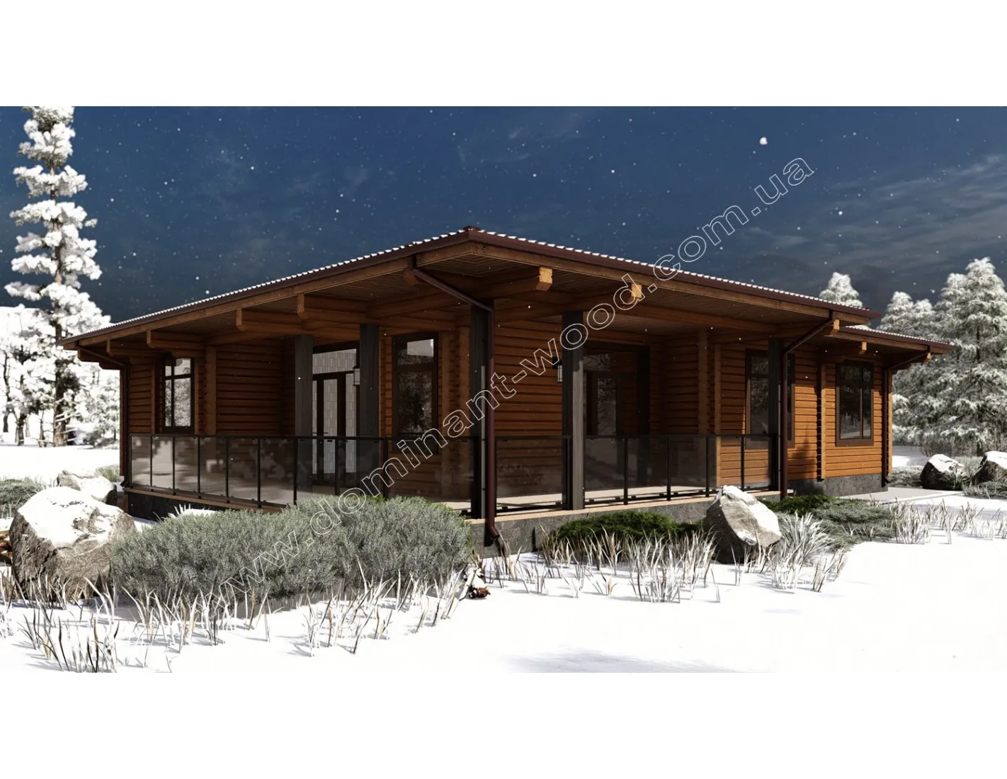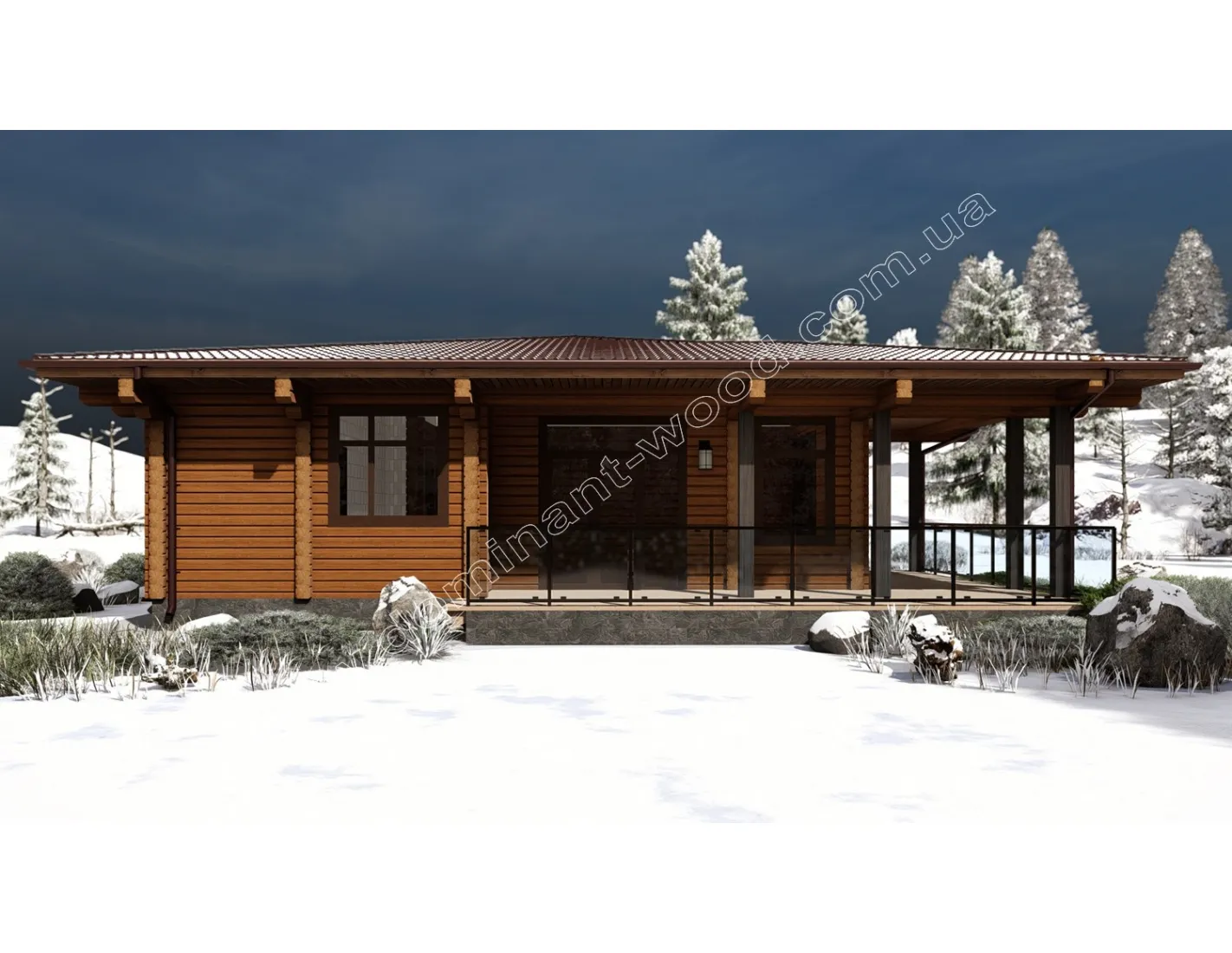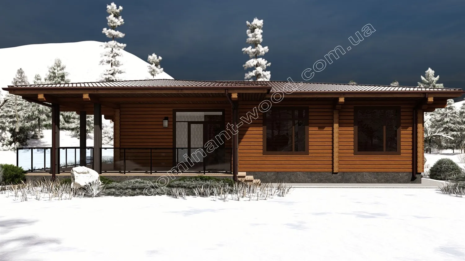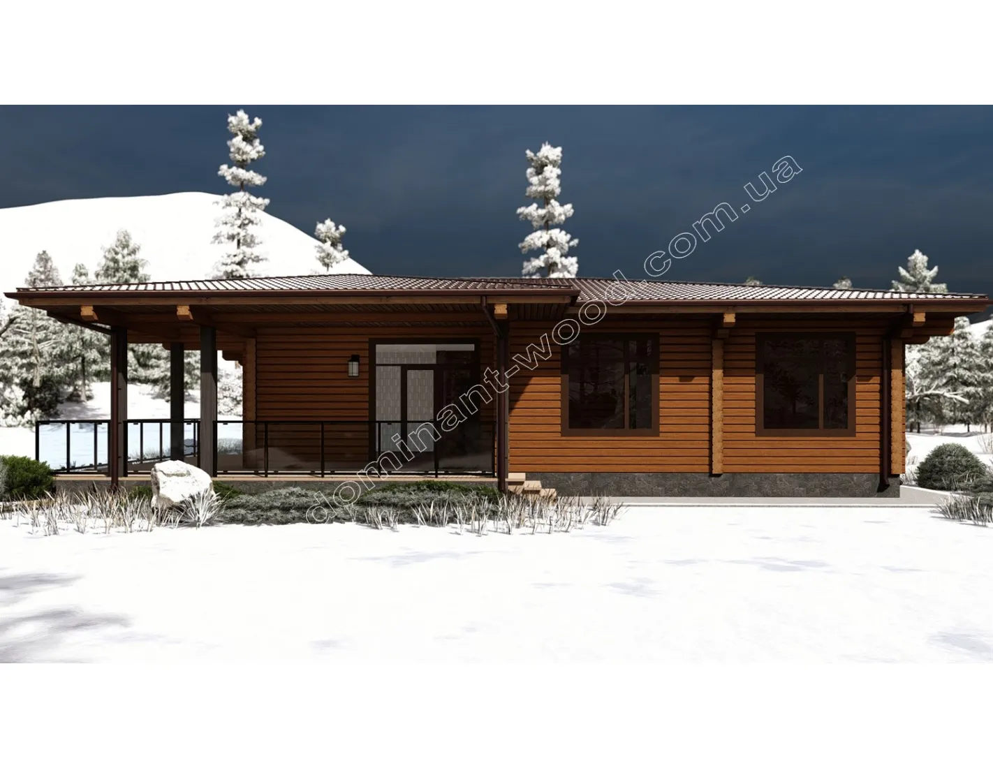 Проект житлового котеджу «Камелія» приваблює своїм сучасним, лаконічним дизайном. Великі вікна, добротні стіни з натурального сухого бруса та масивний чотирьохсхилий дах створюють привабливий вигляд і гарне перше враження. Якщо вам подобаються натуральні матеріали та елегантний, сучасний дизайн - ідея такого одноповерхового котеджу точно припаде вам до смаку. Крім зовнішнього стильного вигляду, всередині будови пропонується максимум комфорту.