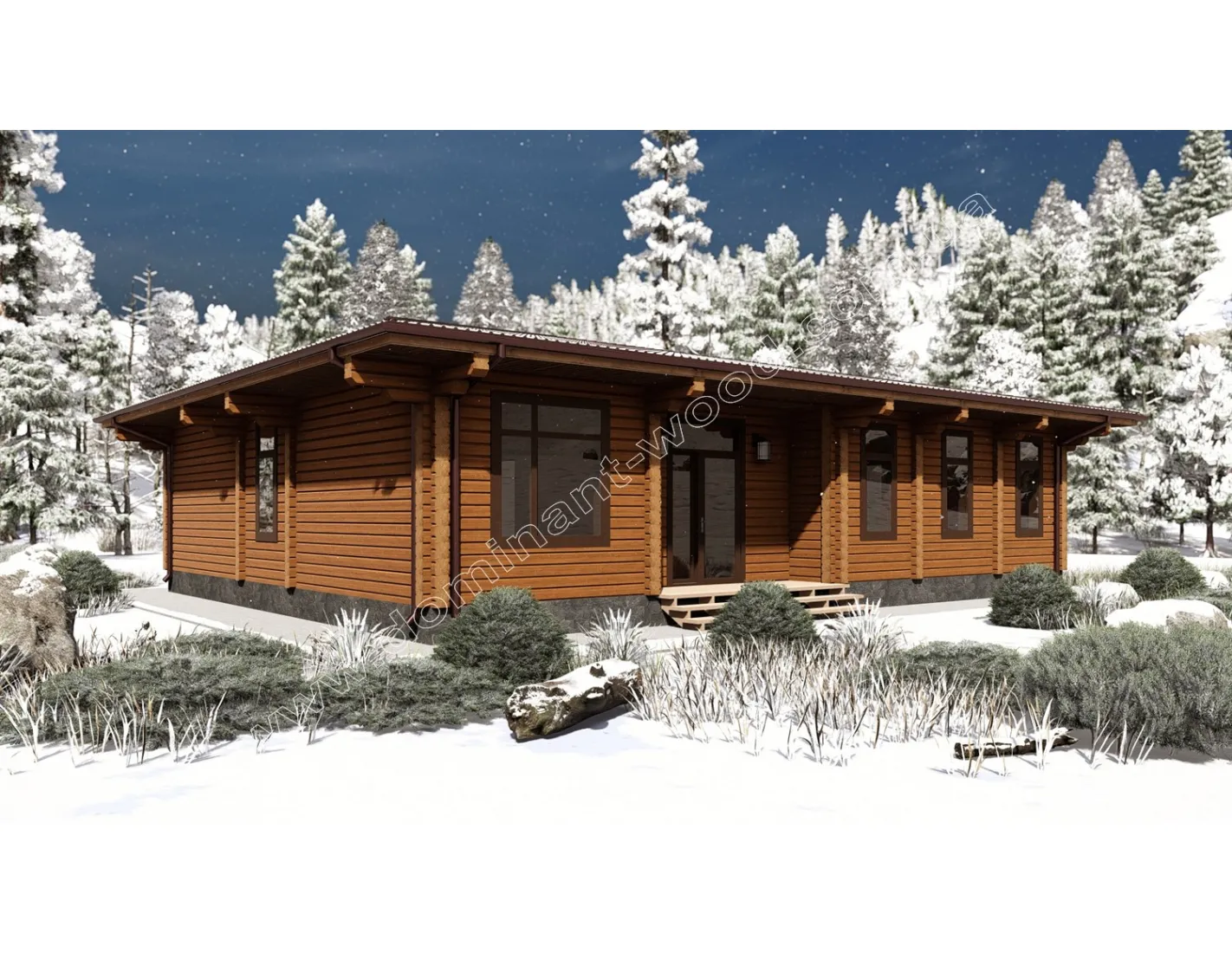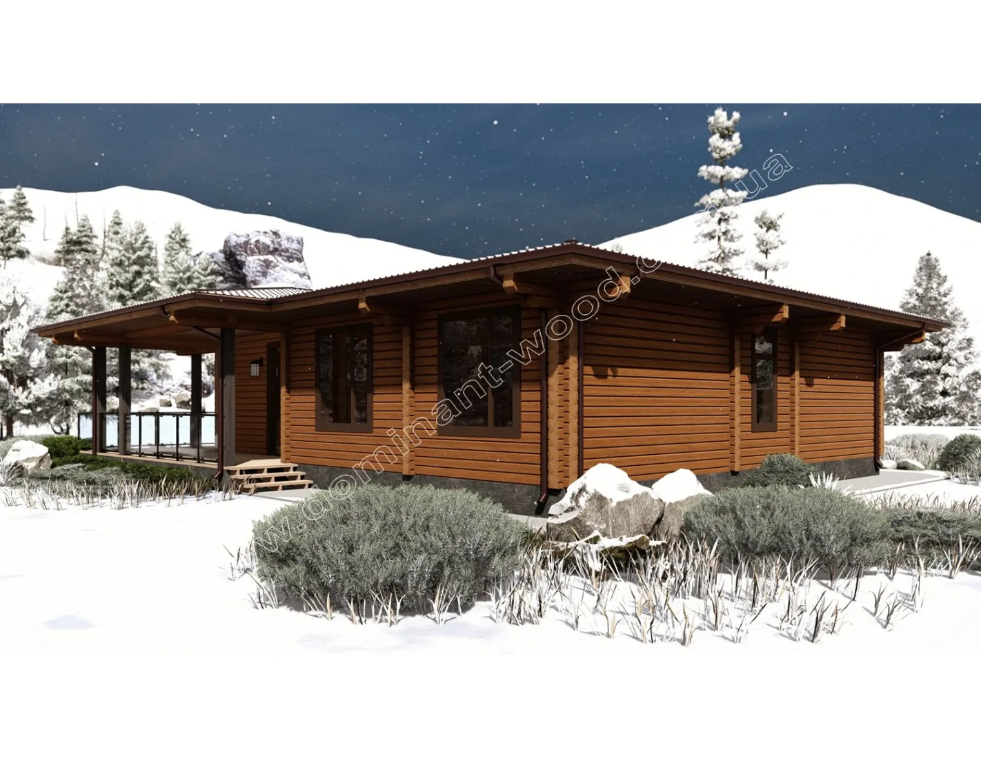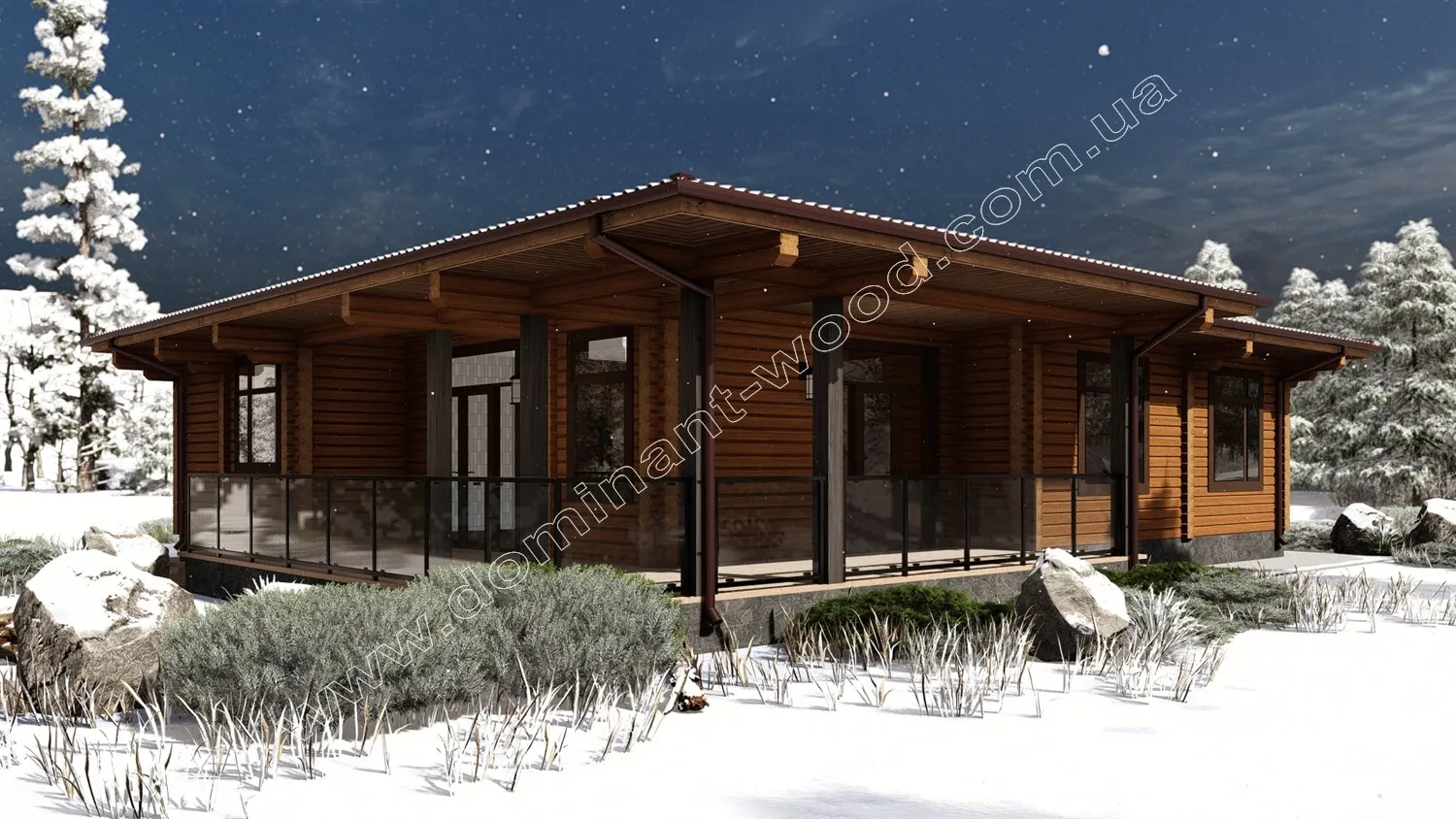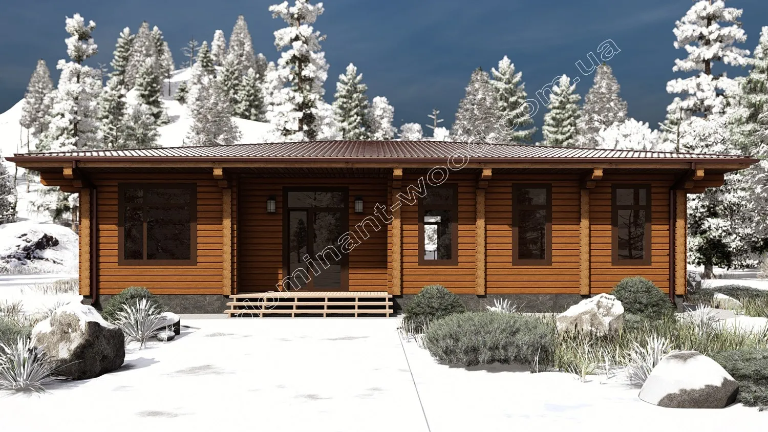 Проект житлового котеджу «Камелія» приваблює своїм сучасним, лаконічним дизайном. Великі вікна, добротні стіни з натурального сухого бруса та масивний чотирьохсхилий дах створюють привабливий вигляд і гарне перше враження. Якщо вам подобаються натуральні матеріали та елегантний, сучасний дизайн - ідея такого одноповерхового котеджу точно припаде вам до смаку. Крім зовнішнього стильного вигляду, всередині будови пропонується максимум комфорту.