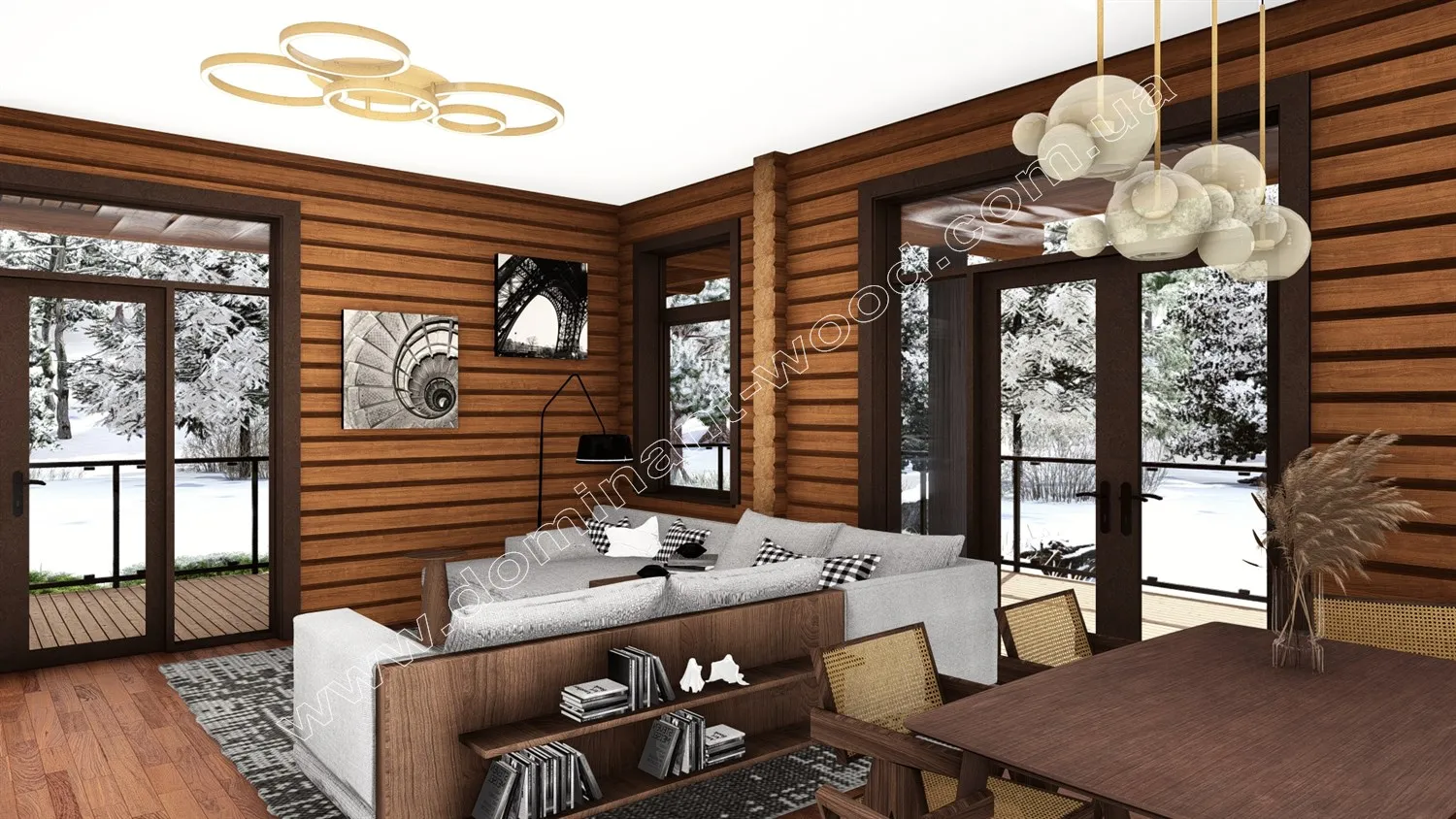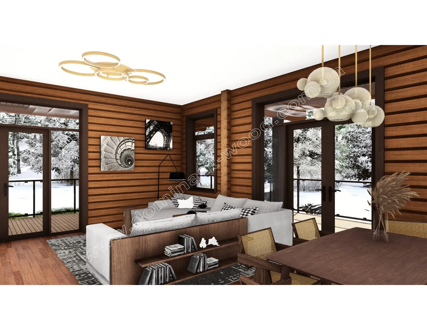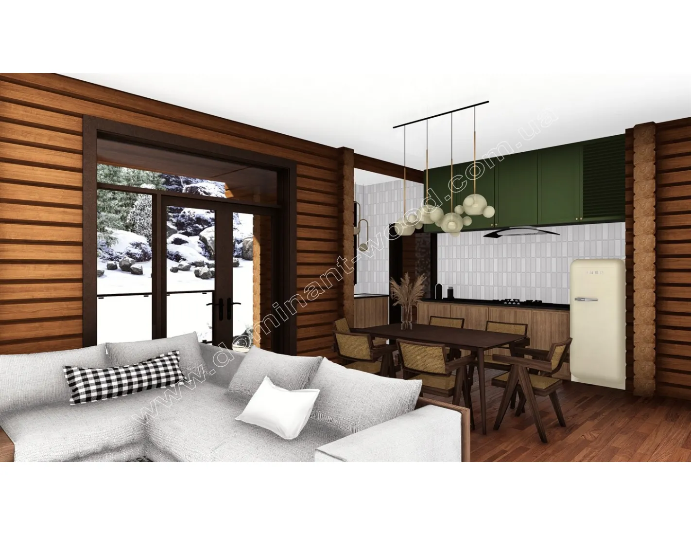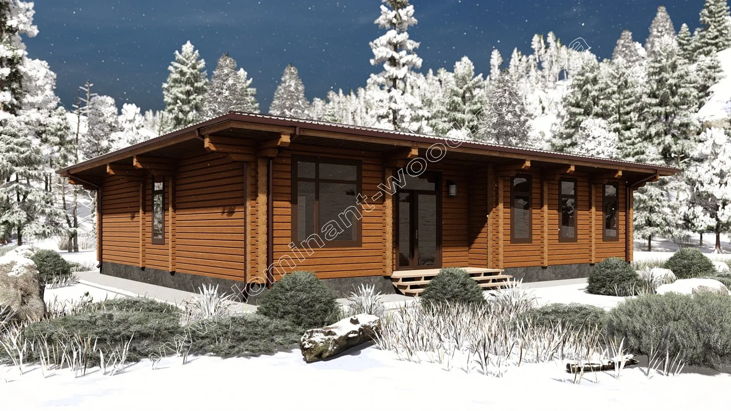Проект житлового котеджу «Камелія» приваблює своїм сучасним, лаконічним дизайном. Великі вікна, добротні стіни з натурального сухого бруса та масивний чотирьохсхилий дах створюють привабливий вигляд і гарне перше враження. Якщо вам подобаються натуральні матеріали та елегантний, сучасний дизайн - ідея такого одноповерхового котеджу точно припаде вам до смаку. Крім зовнішнього стильного вигляду, всередині будови пропонується максимум комфорту.