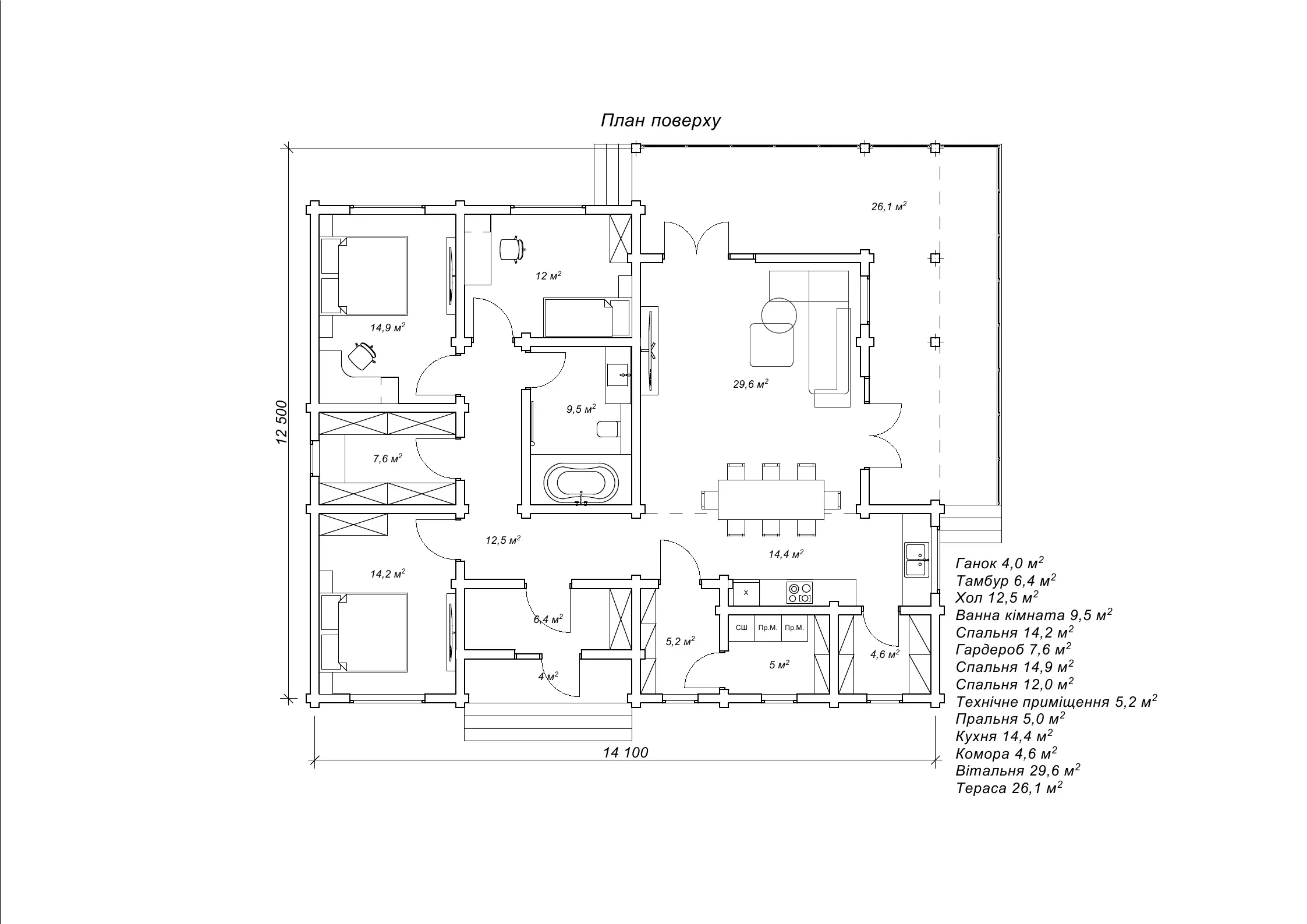 Житловий котедж 12,5х14,1 м, три спальні – «Камелія»