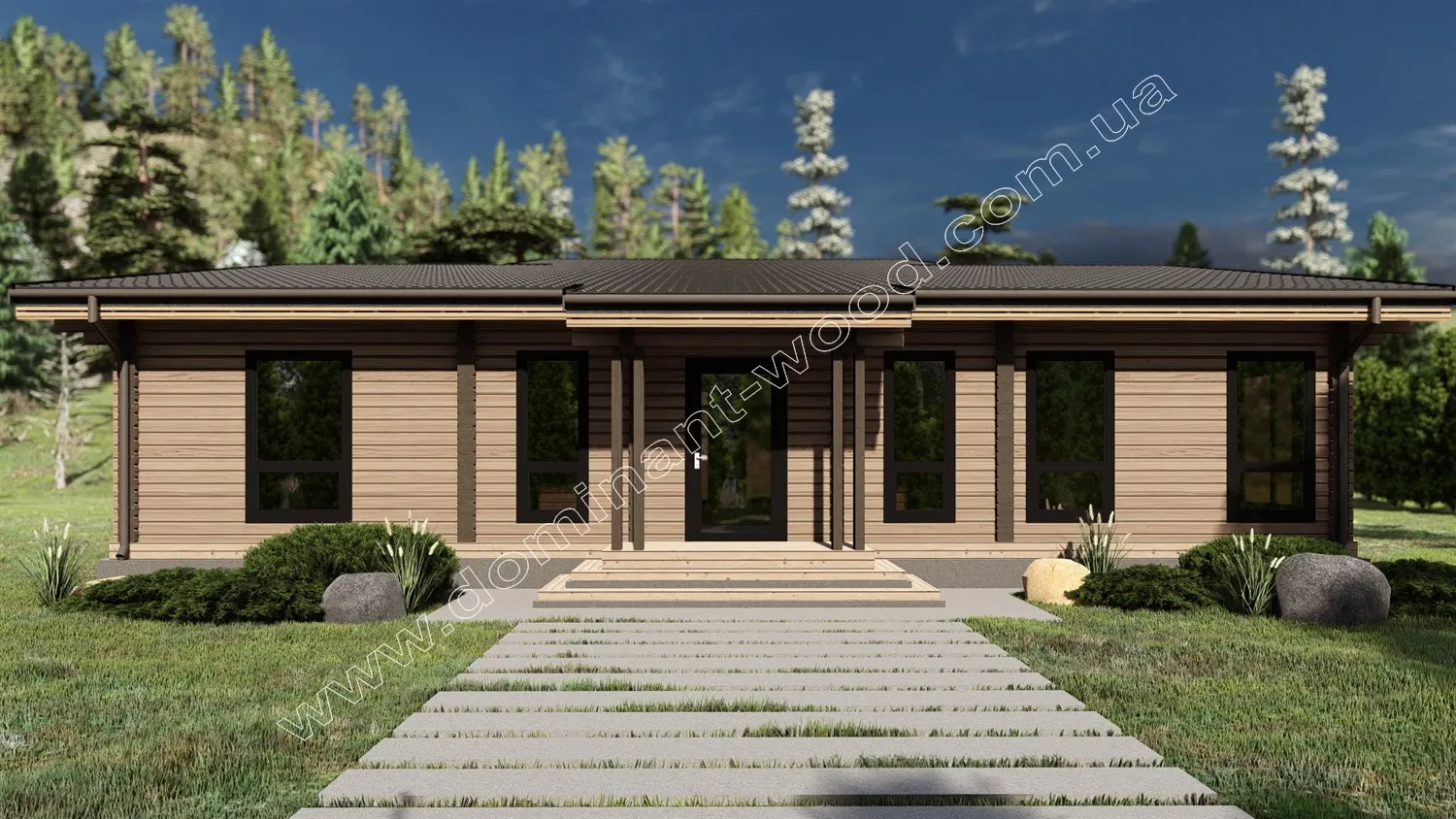 Проект вілли «Наві» з сухого брусу вражає своїм екстраординарним дизайном з великими панорамними вікнами й терасами, що в поєднанні утворюють неймовірну гру світла й тіні. Розкішна вілла з ідеально струганого і просушеного брусу, ефектно прикрасить будь який ландшафт, роблячи його ультрасучасним і стильним, не порушуючи гармонії природи. Адже всі матеріали виконання вілли суто природні. Зовнішній стиль будови нагадує тропічні вілли на узбережжі Мексиканської затоки для елітного відпочинку. Цікаво, що велика висота панорамних вікон створює враження двоповерхового будинку, але проект «Наві» - це одноповерхова вілла з високими стелями, дизайн якої залишає масу простору для креативних рішень по оформленню інтер’єру.