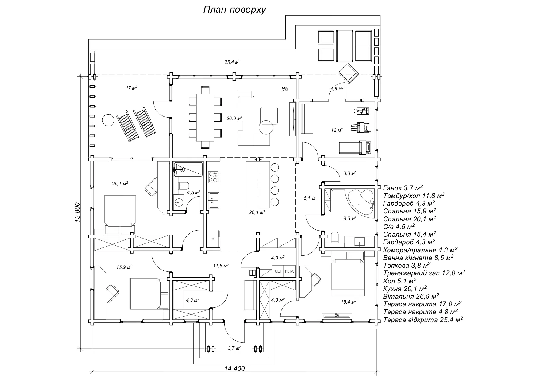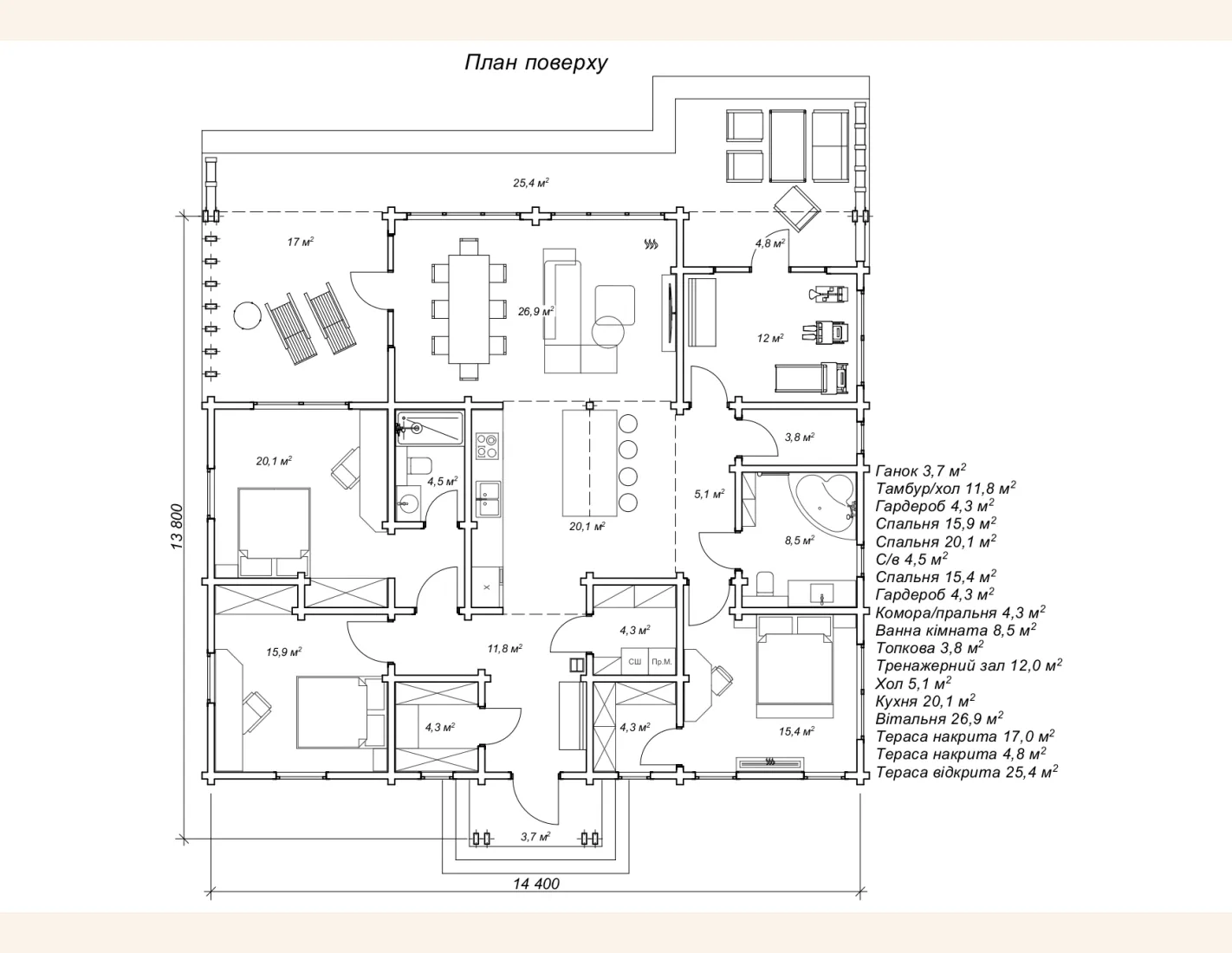 Вілла з сухого брусу 13,8х14,4 м зі спортивною залою - «Наві»