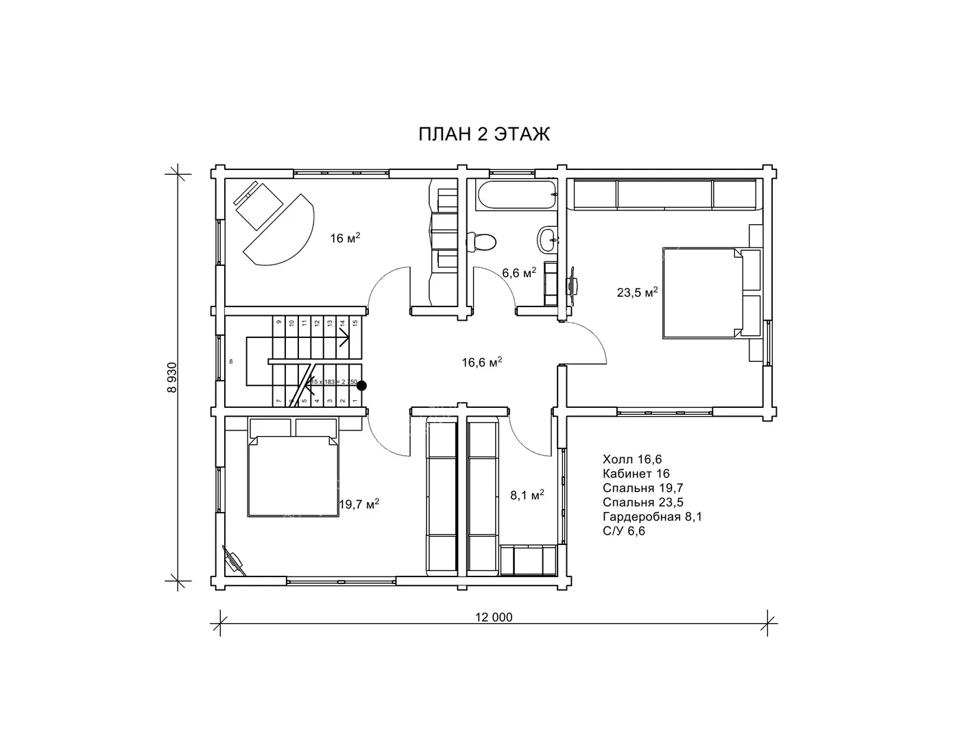 На другому поверсі архітектори пропонують влаштувати робочий кабінет, дві спальні, санвузол і гардероб. Таке зручне планування кімнат дозволить комфортно проводити дозвілля в будинку і дорослим, і дітям. Для кожного в садибі знайдеться улюблений куточок для відпочинку, роботи або усамітнення. У той же час все сімейство може збиратися разом в просторій вітальні або на літній терасі і влаштовувати душевні посиденьки.