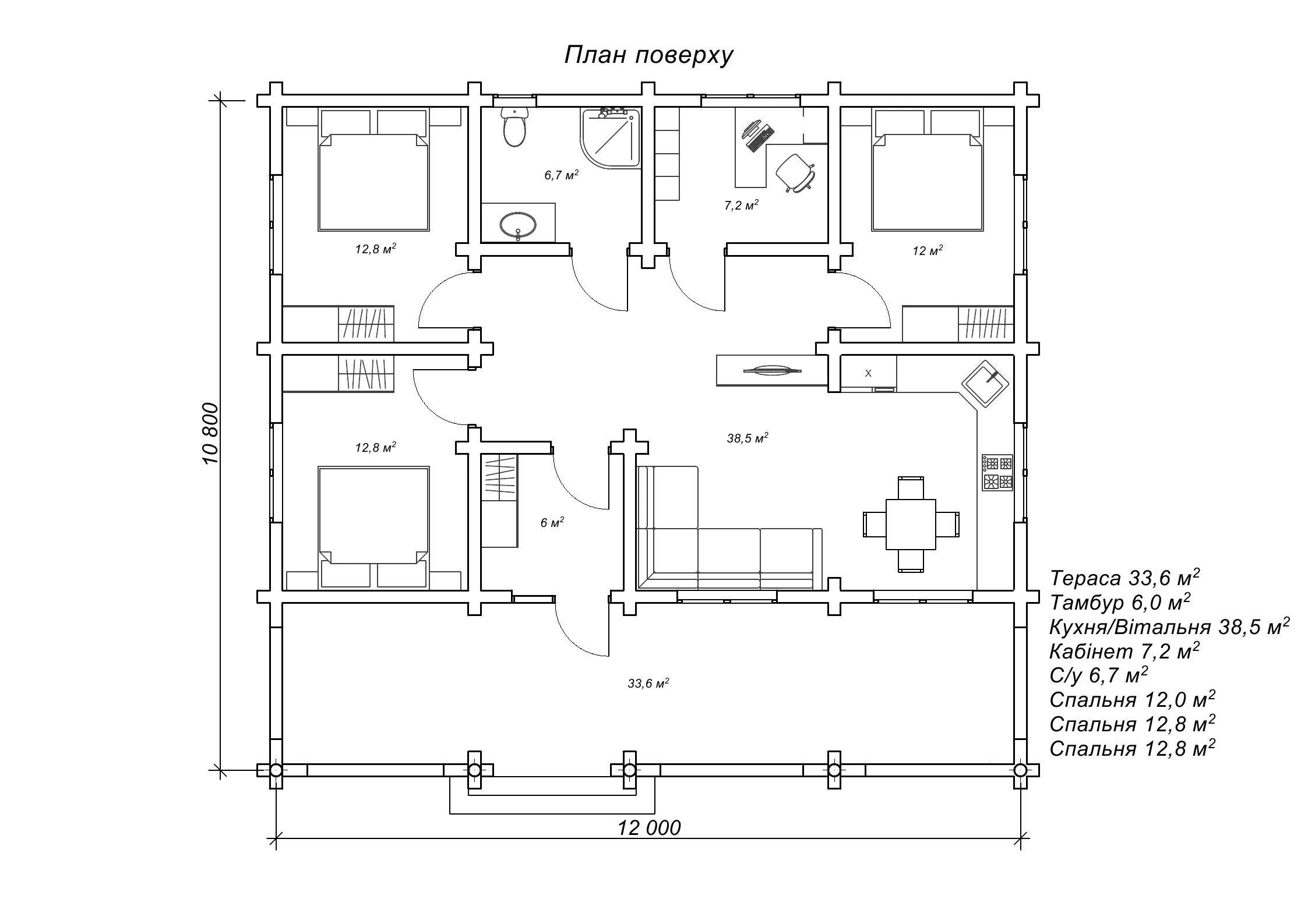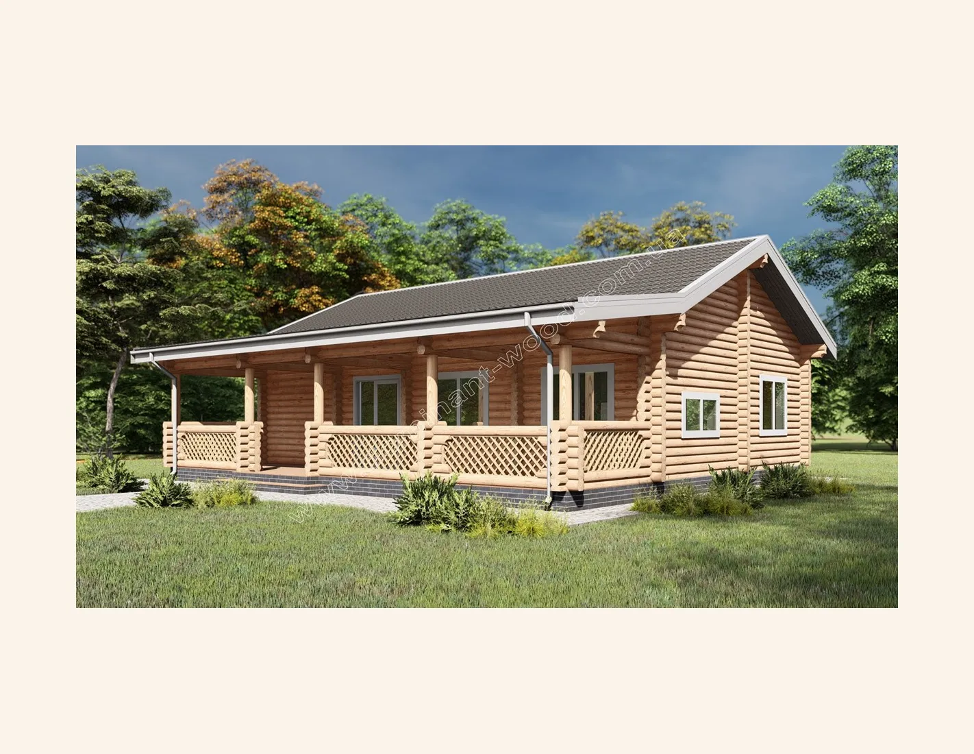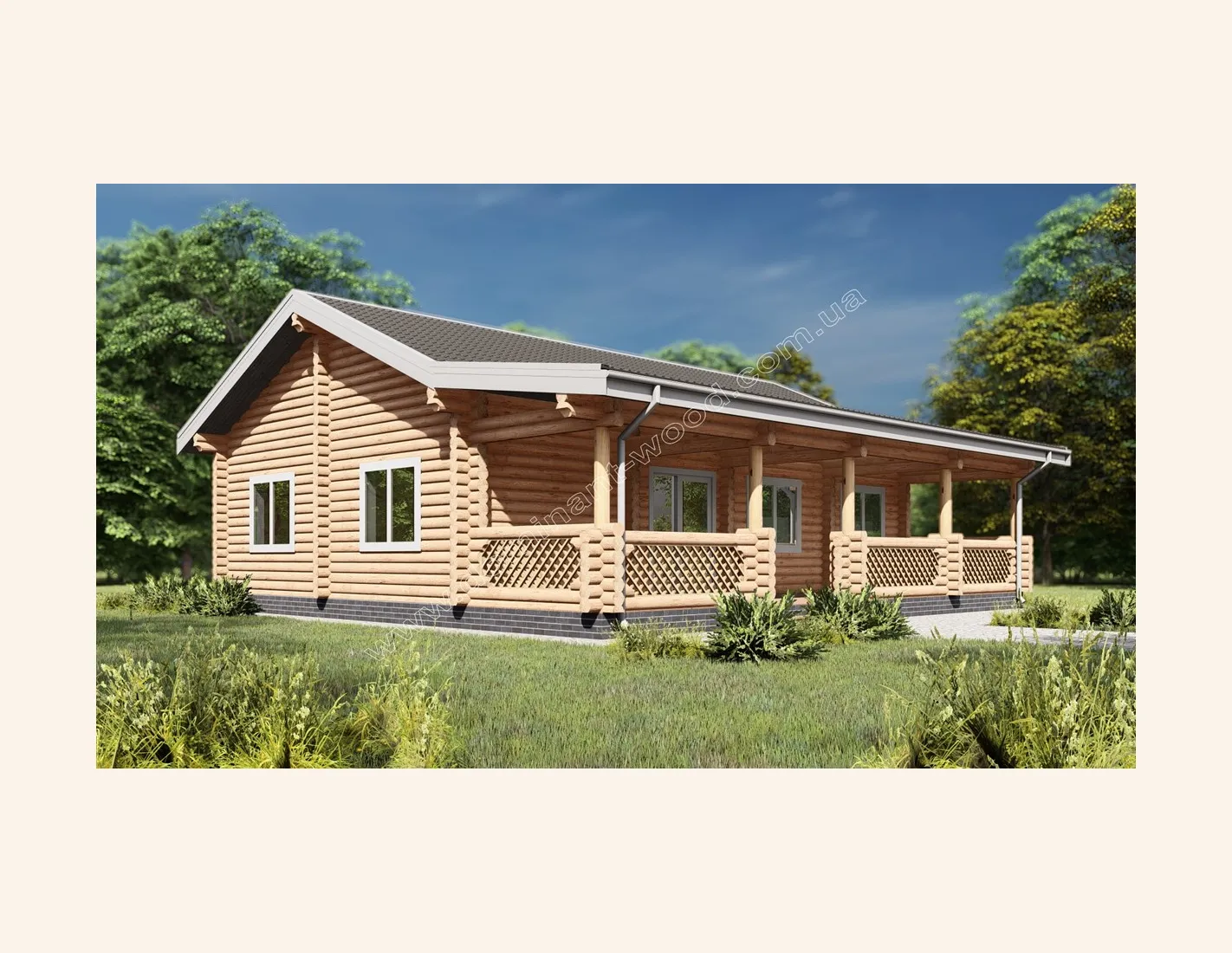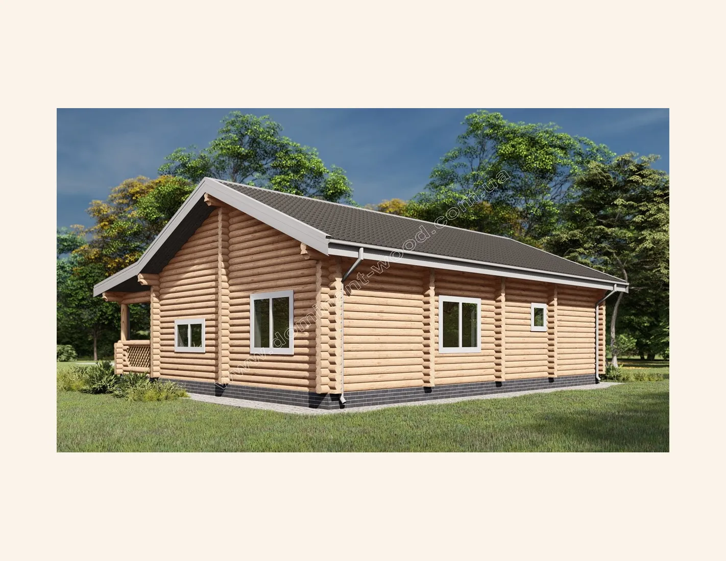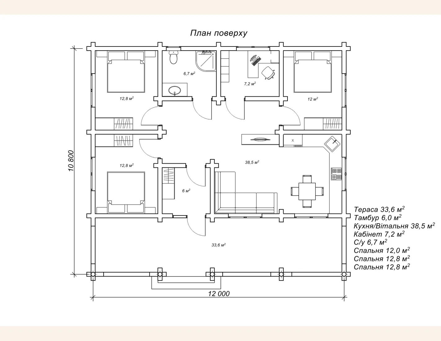 Проект будинку «Тресет» з оциліндрованих колод пропонує ідеальне рішення для тих, хто прагне забезпечити собі і своїй родині максимальний комфорт у заміському просторі. Цей гарний дерев'яний будинок, розроблений з урахуванням потреб сім'ї 4-5 мешканців. Проект включає три спальні по 12 м2, тамбур, хол, велику вітальню з кухнею більше тридцяти квадратів, ще й окремий, невеличкий кабінет на 8 м2. Тобто план будинку 10х12 м передбачає всі необхідні зони для комфортного проживання з врахуванням сучасних реалій, а також додаткові приміщення. Одноповерхове планування особливо актуальне для тих, хто бажає облаштувати житловий простір на одному рівні без зайвих переміщень по сходах.