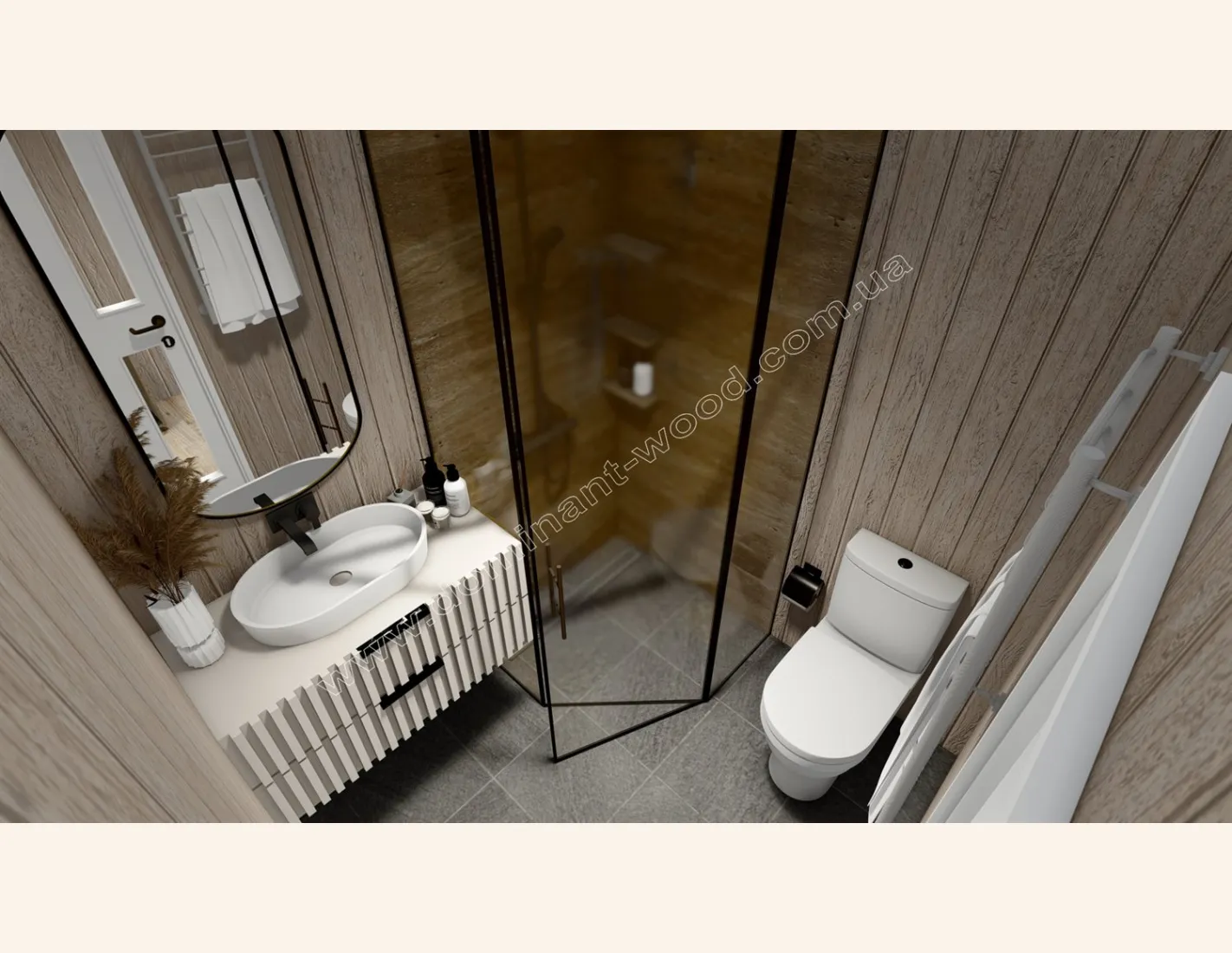 Керамічна плитка на стінах та підлозі, дерев’яна вагонка фарбована. Умивальник, змішувач, унітаз, бойлер, душова кабіна