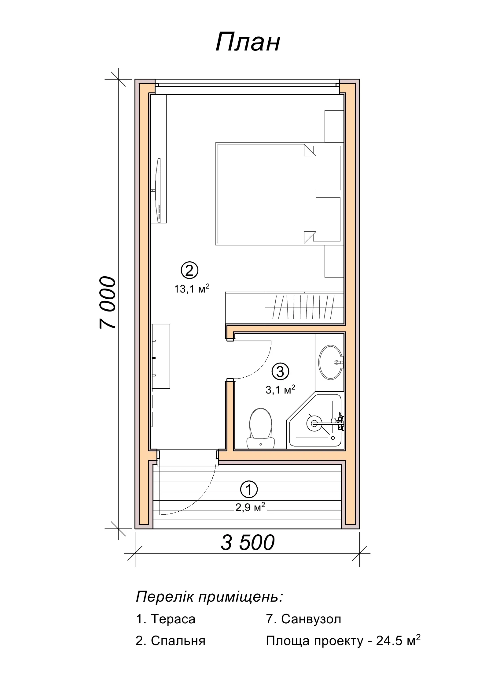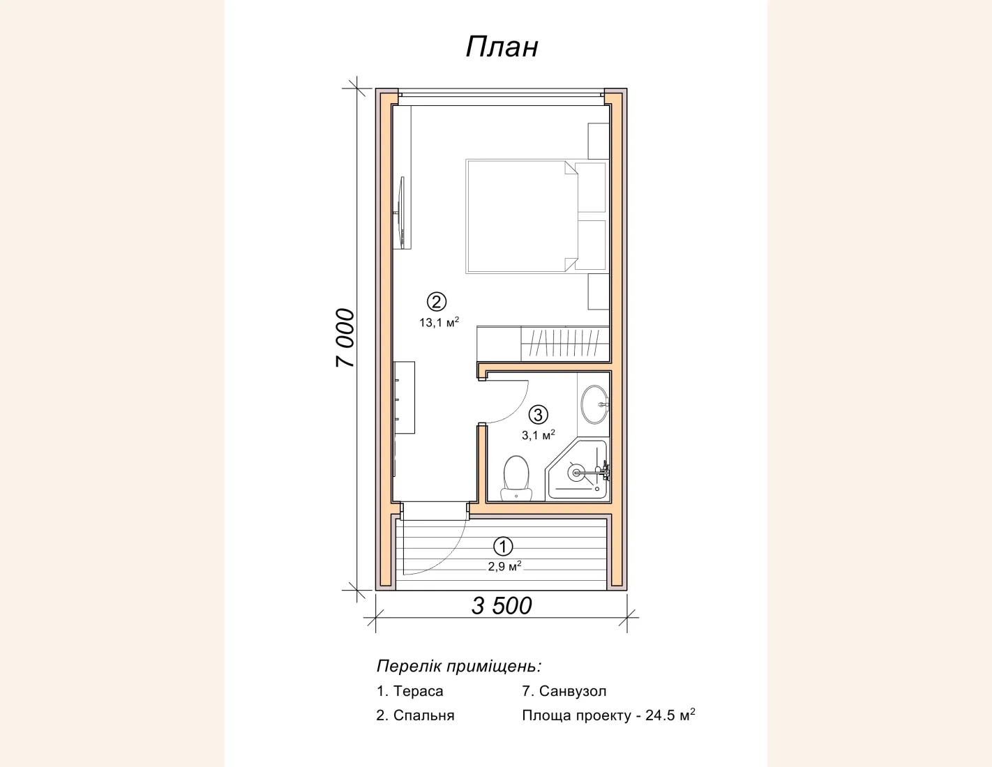 Планування однокімнатного котеджу 7 на 3,5 м в готельний комплекс