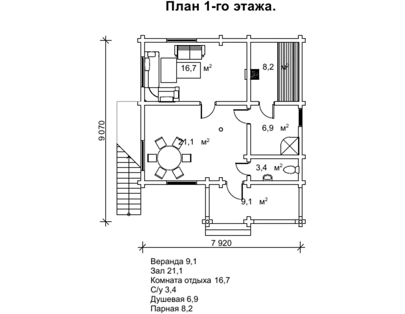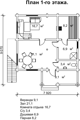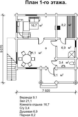 Якщо ж ви вирішите, що для розваги недостатньо однієї лазні, в кімнатах на другому поверсі ви зможете поставити більярдний стіл. Терасу можна обставити настільним тенісом і настільним футболом. Тоді ви дійсно перетворите це приміщення в розважальний комплекс для веселого і активного проведення вільного часу. Варто відзначити, що найчастіше споруди такого типу втрачають важливі приміщення, з метою економії. На плануванні даного проекту ви можете побачити, що перший поверх має всі приміщеннями для повноцінних банних процедур. Такими як парилка, душова, санвузол, гостьова, кімната і веранда.
