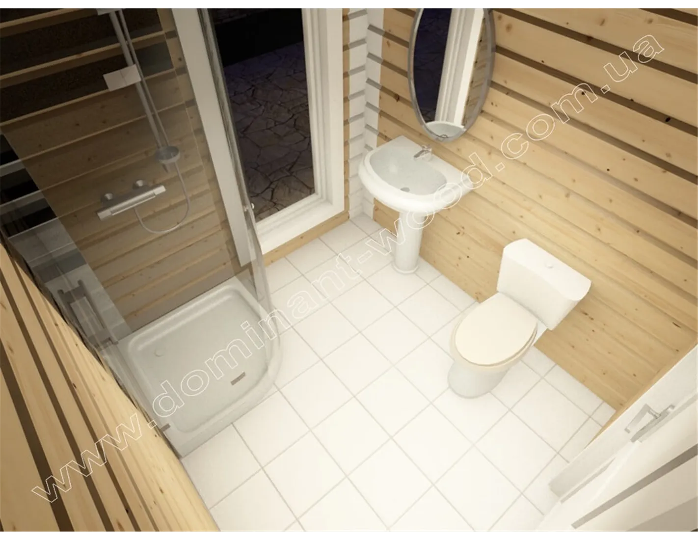 Дерев'яний будинок з сухого, профільованого бруса «Шайна» виглядає добротно і компактно. Прямолінійні стіни з соснового брусу утворюють надійний моноліт дерев'яного масиву, який прослужить господарям справно протягом десятків років. Дизайн котеджу максимально простий. Що дійсно привертає увагу, так це великі вікна різної форми, які надають проекту особливого шарму. А масивний, чотирьохскатний дах додає солідності проекту «Шайна». З першого погляду, здається, що це одноповерховий будиночок. Насправді під дахом котеджу «Шайна» спроектована житлова мансарда. Давайте докладніше розглянемо планування цього будинку з бруса.