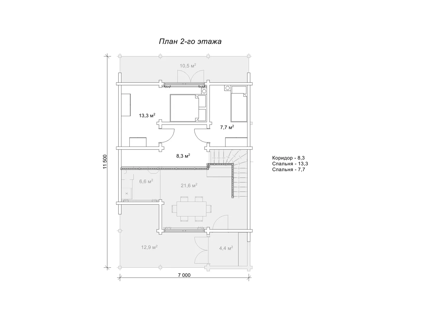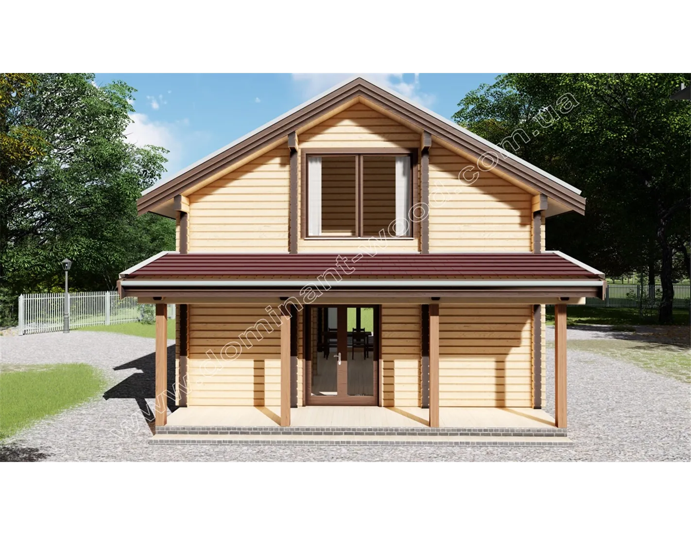 Дерев’яний маєток із сухого, профільованого брусу «Фостін» з трьома спальнями – це вибір людини, яка бажає підвищити якість життя та облаштувати життєвий простір максимально комфортно. Габарити споруди складають 11,5 на 7 м з огляду на виступи терас. Їх дві, і розташовані вони на протилежних фасадах. Одна тераса має площу 12,9 м2, друга – 10,5 м2. На першій можна розмістити комплект садових меблів і влаштувати літню їдальню, а на другій можна поставити парочку шезлонгів і розслаблятися на свіжому повітрі, не полишаючи комфорту особняка. Усередині першого поверху сплановані приміщення тамбуру, кухні-студії, об’єднаної з простором їдальні, спальня та санвузол. На другому поверсі є ще дві спальні та коридор. Завдяки раціональному плануванню, ми отримали велику кількість спалень і кілька терас на площі трохи більше ста квадратів. Проект «Фостін» продуманий до дрібниць, тому господарям та їхнім гостям завжди буде затишно у цьому чудовому маєтку із сухого брусу.
