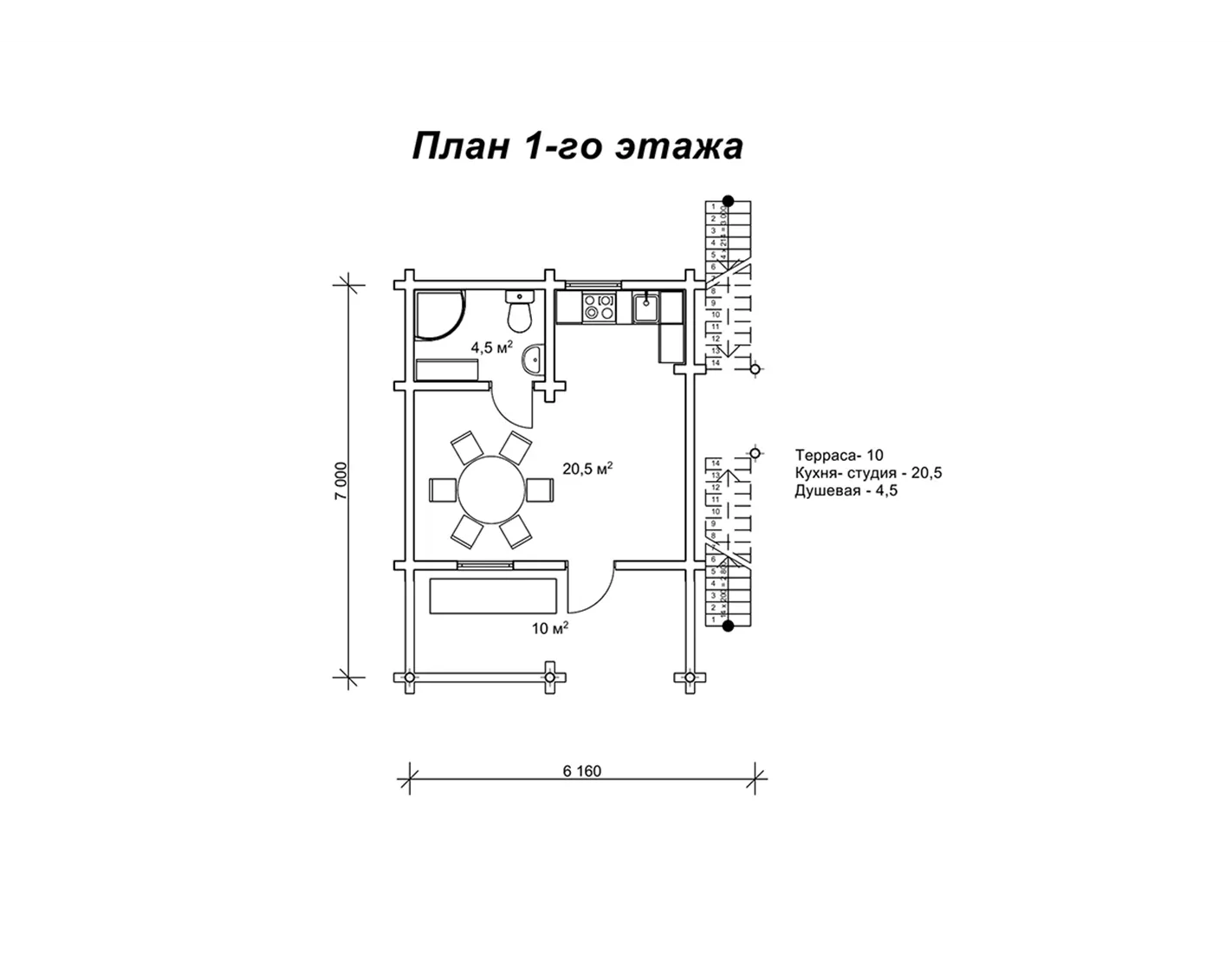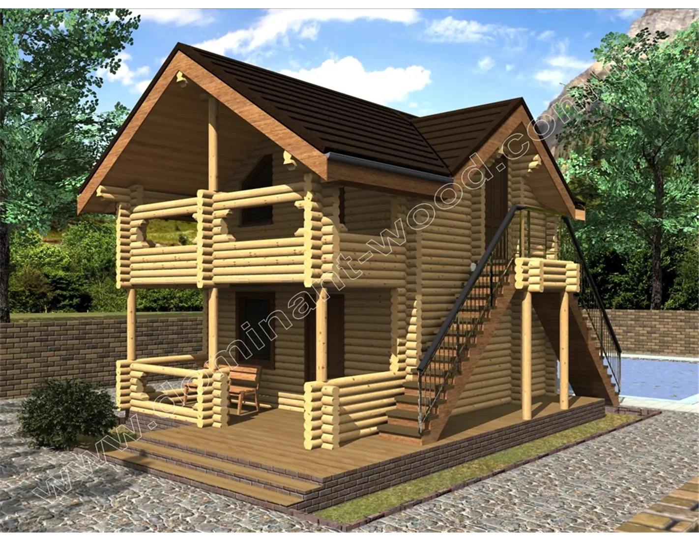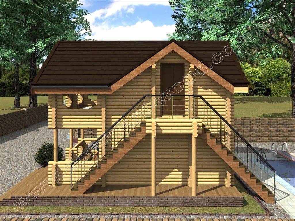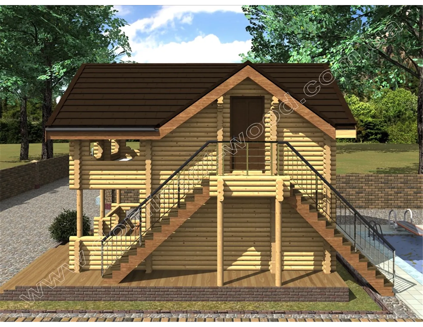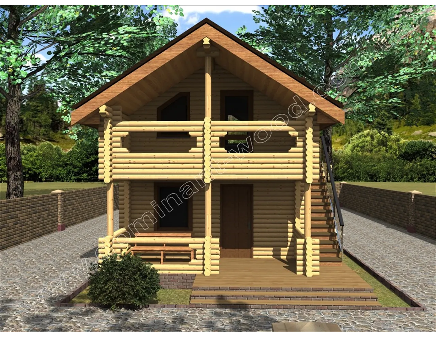 Симпатичний оциліндрований котедж «Майлана» з першого погляду налаштовує на відпочинок і приємне дозвілля. Місце на балкончику і терасі дає можливість більше часу проводити на відкритому повітрі. Особливо це буде приємно десь на узбережжі моря. Тільки уявіть, як солоний морський запах, змішуючись з теплим вітром, наповнює свіжістю будиночок «Майлана». Відпочинок в цьому дерев’яному зрубі воістину може стати просто райським! На головній картинці з проектом ми бачимо, що в будівлі передбачено два входи -з боку тераси і сходи на другий поверх. Погодьтеся, дуже незвичайне рішення - винести сходи за межі будівлі. Але це значно економить простір усередині котеджу і прекрасно підходить для гостьових будинків.