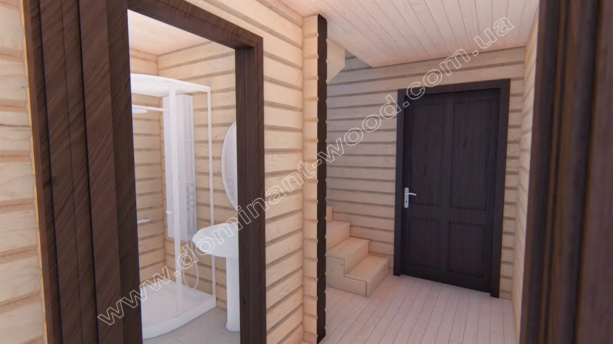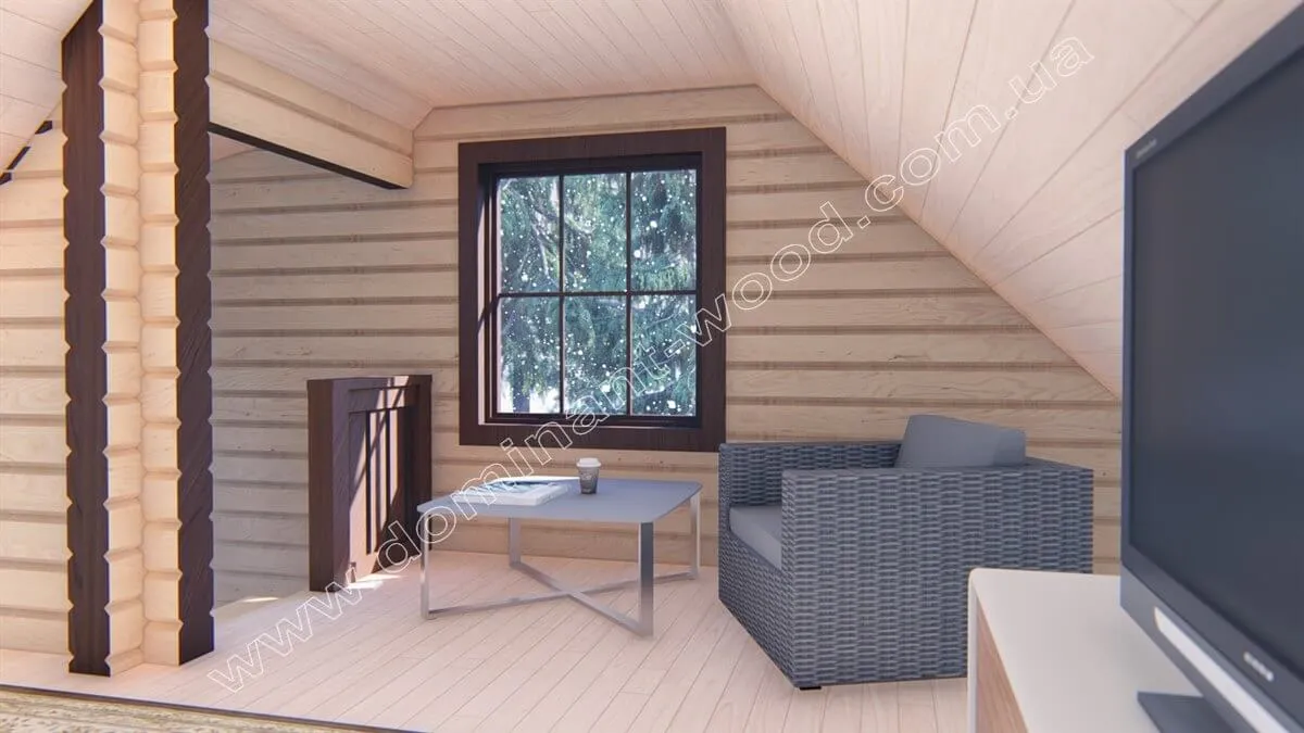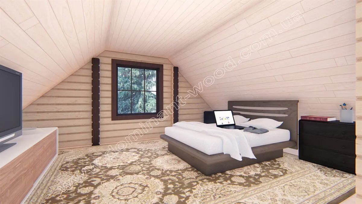 Котедж «Діслава» виконаний з сухого профільованого бруса. Виключно надійний, стабілізований по вологості в прес-вакуумній сушці, масив дерева виглядає презентабельно і монолітно. Міцне з’єднання брусів шипами в пази повністю виключає промерзання і продування стін. До того ж між кожним брусом прокладається міжвінцевий утеплювач синтепон. Акуратний, гарний котедж «Діслава» відразу привертає до себе увагу незвичайною формою споруди з виступом для вікна на покрівлі мансарди. А планування приваблює зручним розташуванням кімнат і хорошою функціональністю.