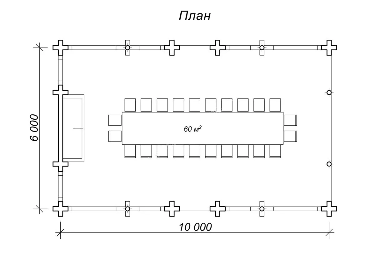 Спланована альтанка «Поляна» в розмірах 6 на 10 м, загальна площа павільйону становить 60 м2. Як видно за ескізами планування, тут можна розмістити один великий стіл на безліч посадочних місць, а можна поставити кілька столиків, використовуючи проект «Поляна» в якості літньої альтанки з мангалом для кафе. Максимум функціональності проекту і мінімум вхідного матеріалу роблять альтанку-павільйон «Поляна» просто ідеальним вибором для бізнесу. Будівництво павільйону зі зрубу не понесе занадто великих витрат, при цьому воно виконується в мінімальні терміни і вигідно окупається своєму господареві.