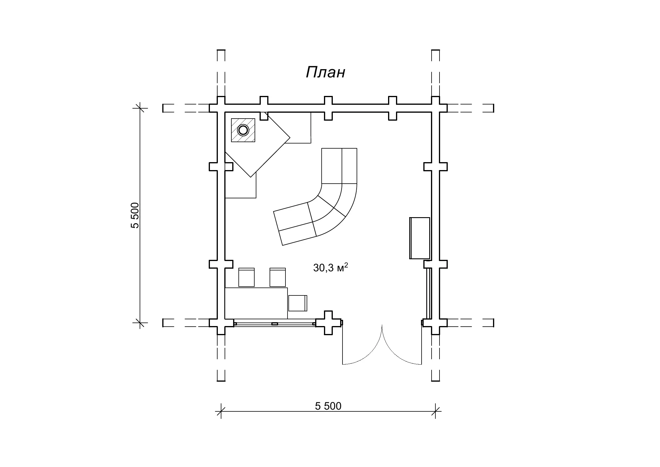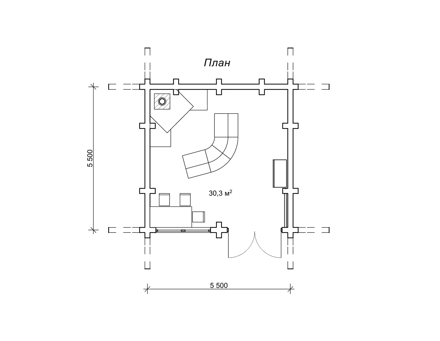 Проект «Драгут» являє собою квадратну будову з параметрами забудови 5,5 на 5,5 м2 і площею 30,3 м2. Компактне і практичне приміщення може стати повноцінним місцем для відпочинку після продуктивного дня. Як бачите, за запропонованою нашим архітектором схемою планування, всередині будиночка облаштований камін. Такий будиночок з каміном прикрасить ваше дозвілля або стане затишним гостьовим котеджем на базі відпочинку . Величезна перевага будиночка-студії «Драгут» полягає в тому, що ви можете використовувати його так, як вам буде зручно, при цьому за максимально справедливу вартість від українського виробника «Домінант».