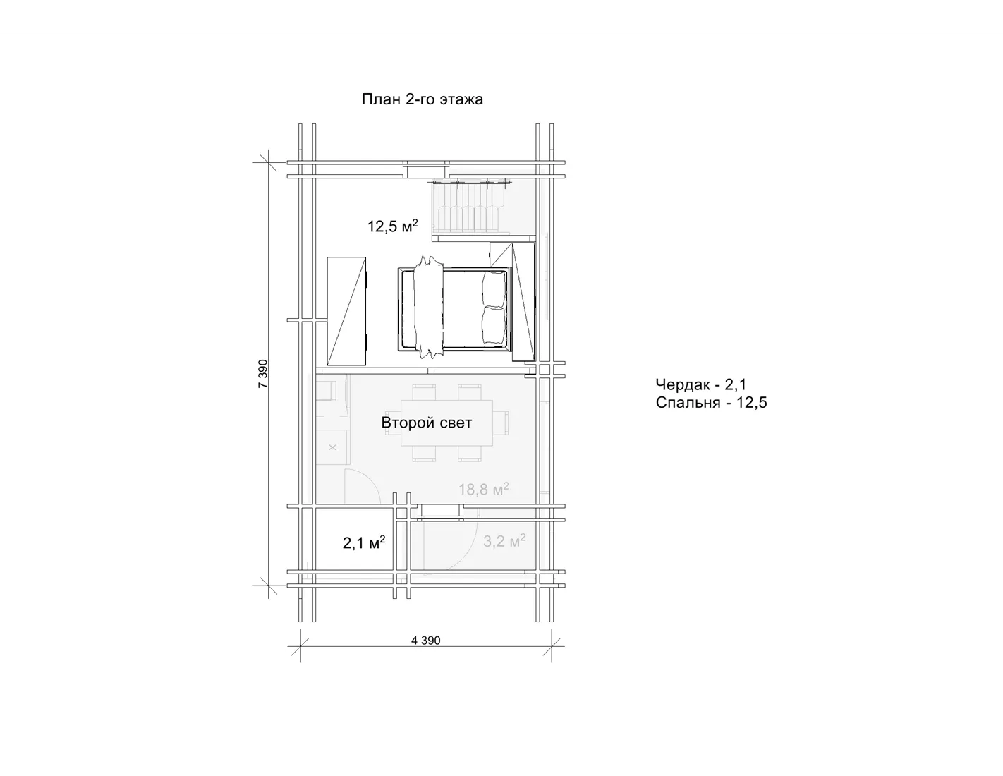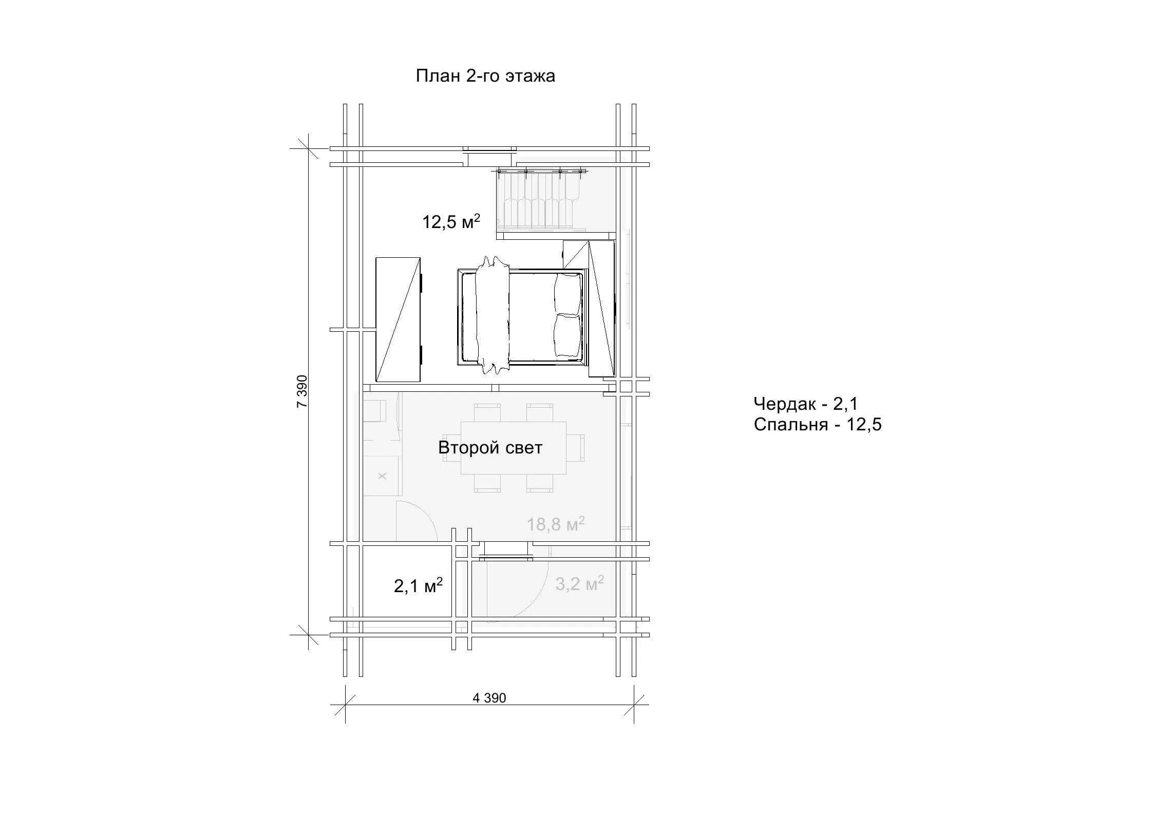 Проект утепленого будиночка «Сільва2» створений, як варіація літньої моделі «Сільва». Площа споруди залишилася практично без змін, а ось розміщення кімнат було підкориговано. Зал на першому поверсі спроектований на площі 18,8 м2. Близько залу є маленька комора розміром 2,1 м2. Розмір санвузла 5,6 м2 дозволяє помістити в ньому комфортну ванну. Мансарда в проекті «Сільва2» набагато вища, ніж у вихідній моделі, а площа спального місця трохи збільшена і містить 12,5 квадратів. Це дуже комфортний антресольний поверх з оптимальним використанням житлового простору.