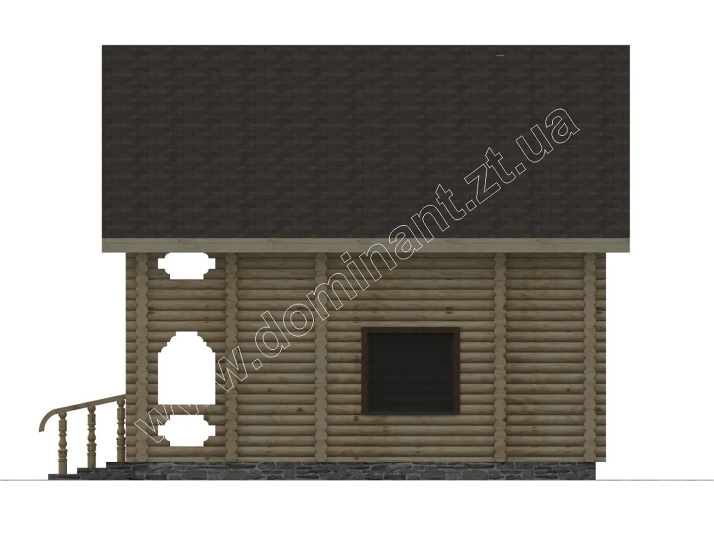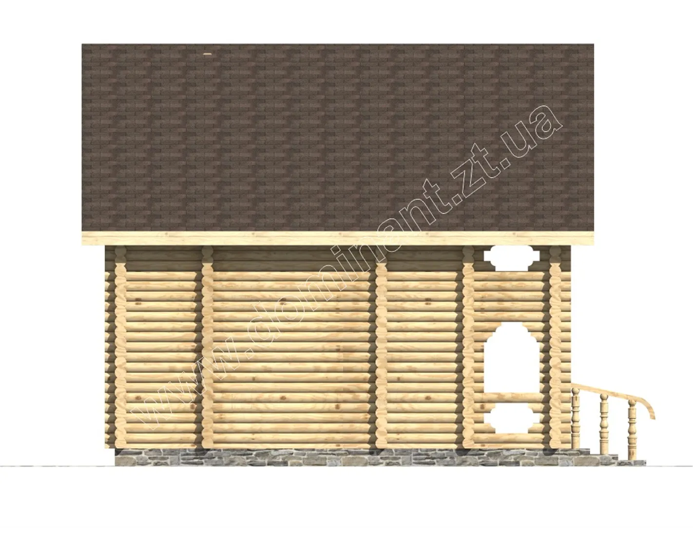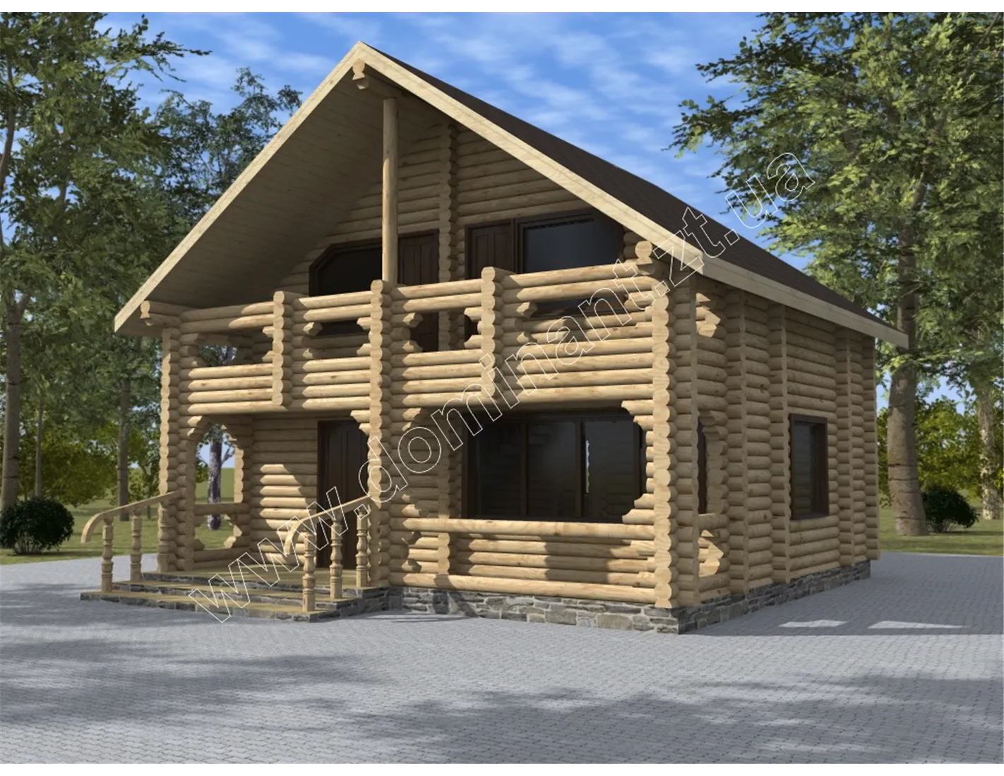 Відмінний котедж для відпочинку на лоні природи з друзями. Про це свідчить структура всього будинку. Широкі пологі щаблі не обмежать вас при вході в будинок і обрамлені красивими поручнями. Тераса і балкон, за рахунок типу укладання бруса і його форми, виглядають святково і створюють картинку фасаду. Прорізи їхніх боків роблять їх більш ажурними і розкішними. Двосхилий дах якомога краще підходить до цієї будівлі, особливо в тонах, представлених на попередньому плані.