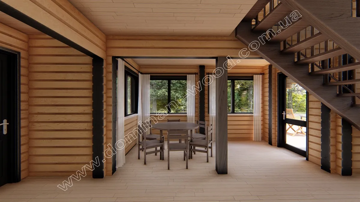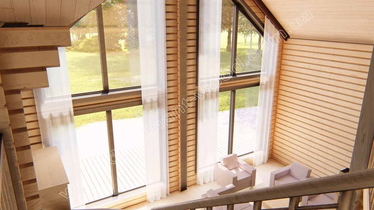 У стильному зовні особняку «Аполлон2» такий самий екстравагантний інтер’єр. Ось, наприклад, де ви ще бачили трикутний антресольний поверх? Така оригінальна обстановка та своєрідний стиль будівлі даруватиме господарям радість від дозвілля в таких умовах і щодня надихатиме на нові звершення. На першому поверсі особняка є камінний зал, спальня, тераса, санвузол, а на другому поверсі три просторі спальні та великий простір антресольного поверху. Окрім іншого, у будинку передбачені підсобні приміщення, тераси та балкончики. А на візуалізації інтер’єру можна повністю поринути у чудову атмосферу маєтку та відчути себе господарем цієї мрії. Якщо ви розглядаєте престижний варіант житла, і вас цікавить будівництво комфортабельного будинку з бруса з великою кількістю житлових кімнат, обов’язково зверніть увагу на проект «Апполон2» – ексклюзивний будинок із цільного, просушеного бруса, який довго та надійно слугуватиме багатьом поколінням вашої родини.
