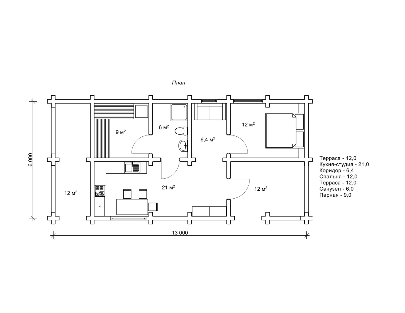 Планування лазні 6х13 м з кімнатою відпочинку
