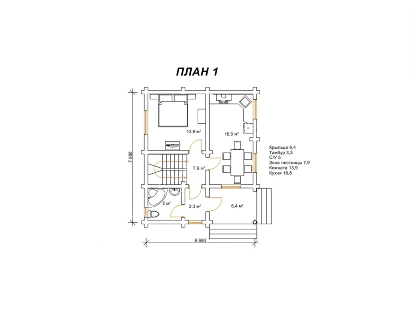Проект Доміно являє собою незрівнянний двоповерховий дачний будинок з максимально комфортним плануванням і солідним екстер’єром. Це котедж довжиною 6,6 м і шириною 7,9 м. Загальна площа становить 100,6 м². Затишний ганок і балкон пожвавлюють лаконічні лінії фасаду. Внутрішнє планування першого поверху передбачає наявність тамбура, санвузла, кімнати та кухні. Кімната площею 13,9 м², кухня - 16,8 м², санвузол - 5 м², тамбур - 6,4 м². Ганок площею 6,4 м² дозволить насладжаться свіжим повітрям всією родиною в будь-яку погоду. Там можна сховатися і від літнього спекотного сонця, і від раптового дощу. На другому поверсі знаходиться робочий кабінет, спальня і балкон. Кабінет площею 13,9 м², кімната - 16,8 м², балкон розташований над ганком і площа його становить - 6,4 м².