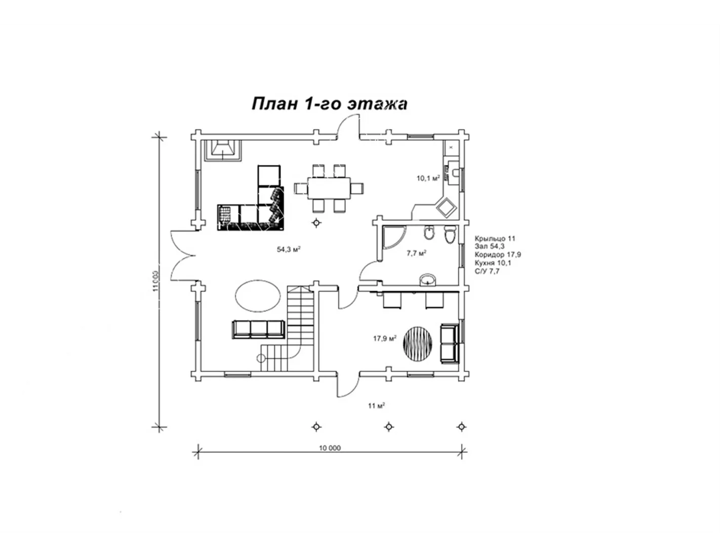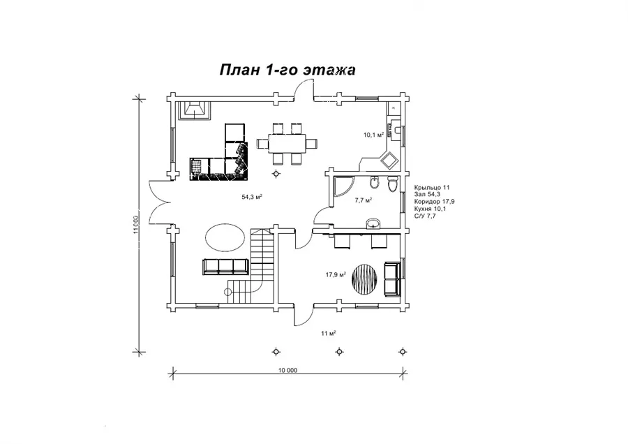 Знатний будинок з оциліндрованих колод Модест спроектований в габаритах 11 на 10 м. Його загальна площа менша за 200 м², але зовні будинок виглядає монументально і презентабельно. Великі вікна другого світла виступають найзначнішою деталлю всього проекту і відразу звертають на себе увагу. На першому поверсі котеджу спроектований величезний зал, що включає три функціональні зони: вітальня, кухня і їдальня. Також на першому поверсі спроектований місткий санвузол, де можна поставити простору ванну. Досить великий коридор цілком може виконувати функцію передпокою. На другому поверсі дві просторі спальні: спальня господарів і дитяча, а також санвузол. Зручно, що в спальнях немає суміжних стін, вони знаходяться в різних куточках поверху, а значить ніхто з домочадців не заважатиме один одному, проводячи час у своє задоволення.