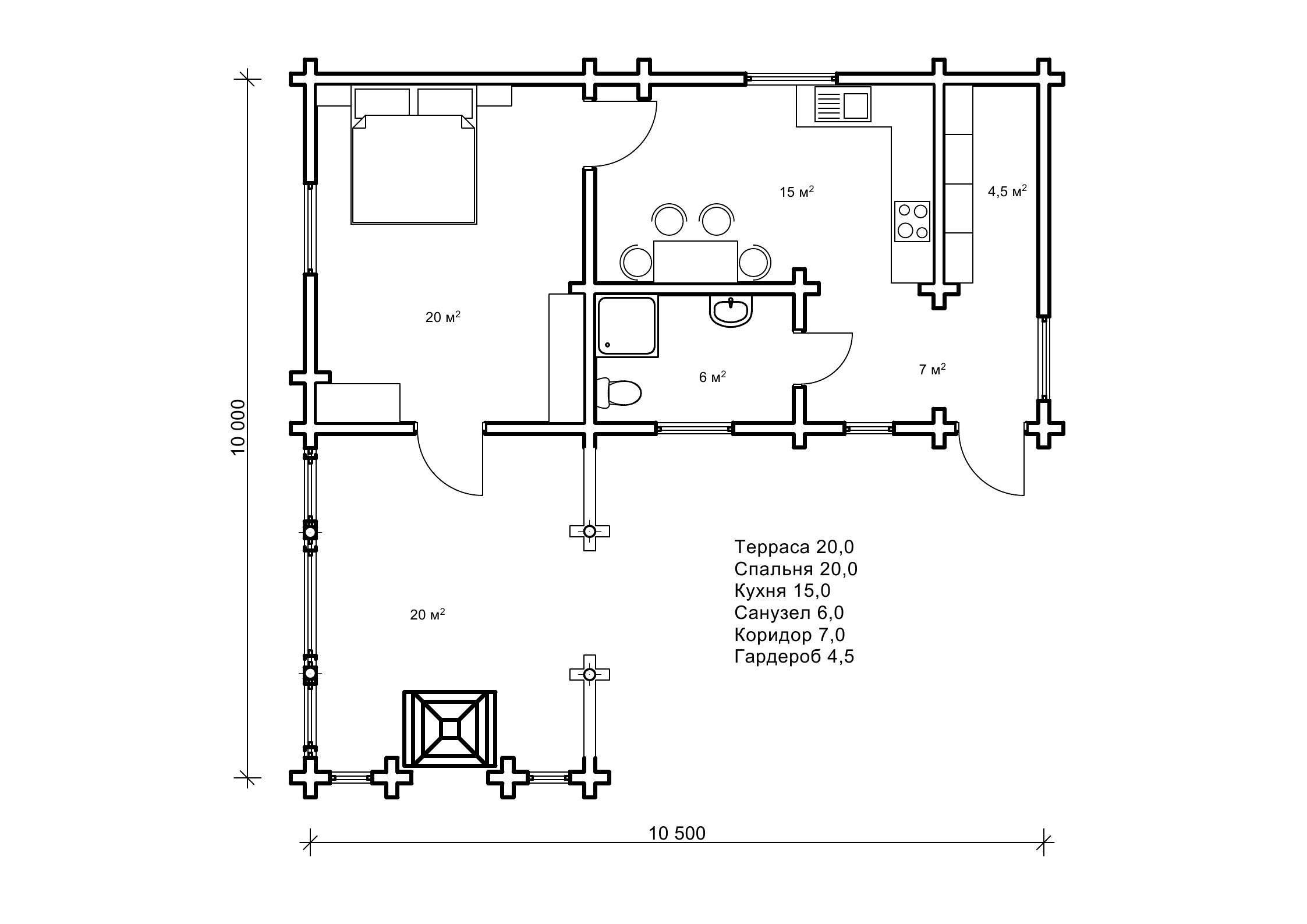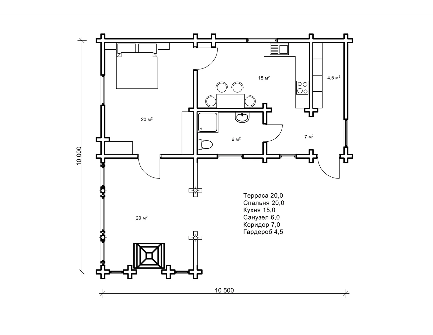 Внутрішнє наповнення проекту «Брас» заслуговує на найвищу похвалу. Тут створені всі умови не тільки для комфортного побуту, а й справжньої насолоди життям. Одноповерховий будиночок складається з таких приміщень: тераса з каміном, спальня, кухня, санвузол, коридор і гардероб. Причому, всі приміщення досить просторі за площею, наприклад, спальня має площу 20 м2, так само, як і тераса. Габарити будівлі 10 на 10,5 м, що дуже зручно для установки на стандартній земельній ділянці. Загальна площа проекту «Браса» становить 72,5 м2, в ньому ми досягли оптимального співвідношення ціна/якість. Будинок з бруса «Браса» оснащений всім, щоб стати чудовим будиночком на дачі. А якщо ви виберете більшу товщину колод для будівництва, то вийде теплий будинок з дерева, в якому можна проживати цілий рік.