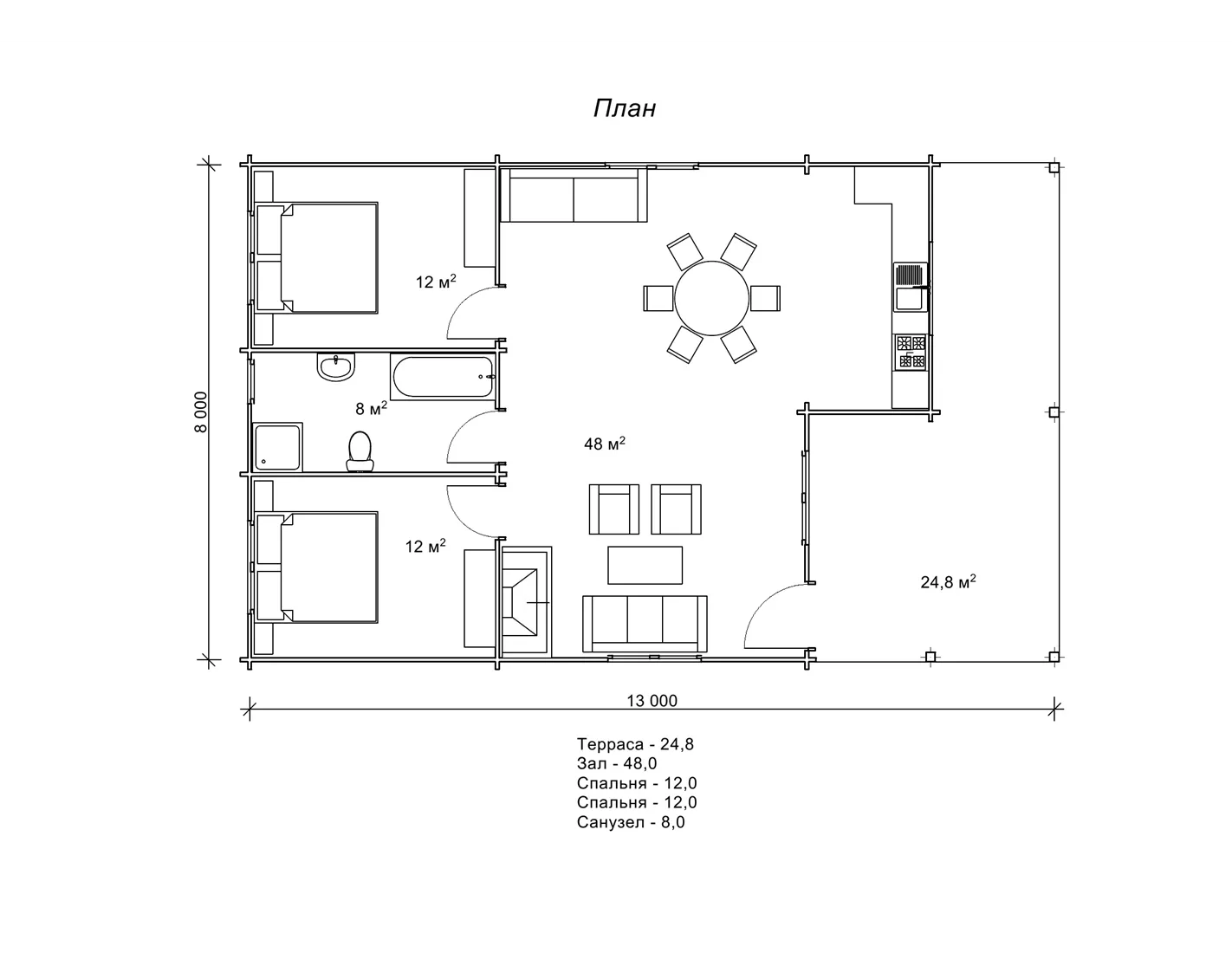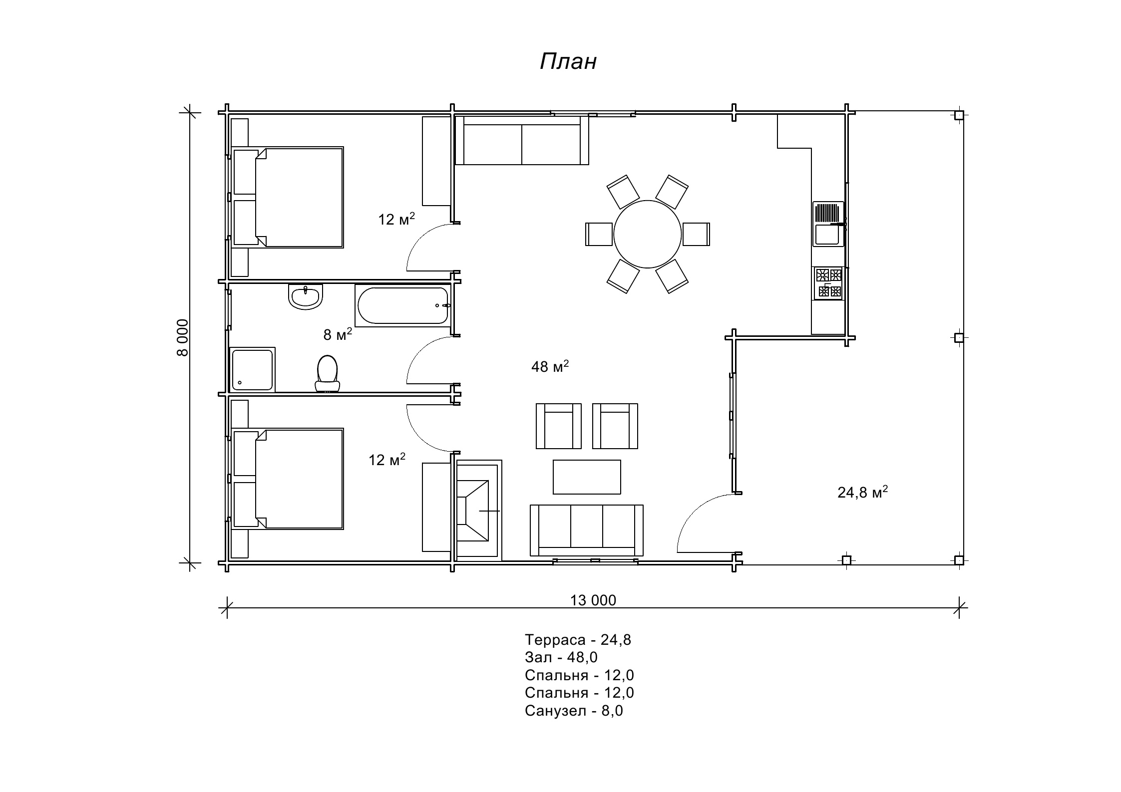 План літнього котеджу з сухого брусу 8 на 13 м, площа 104 м2