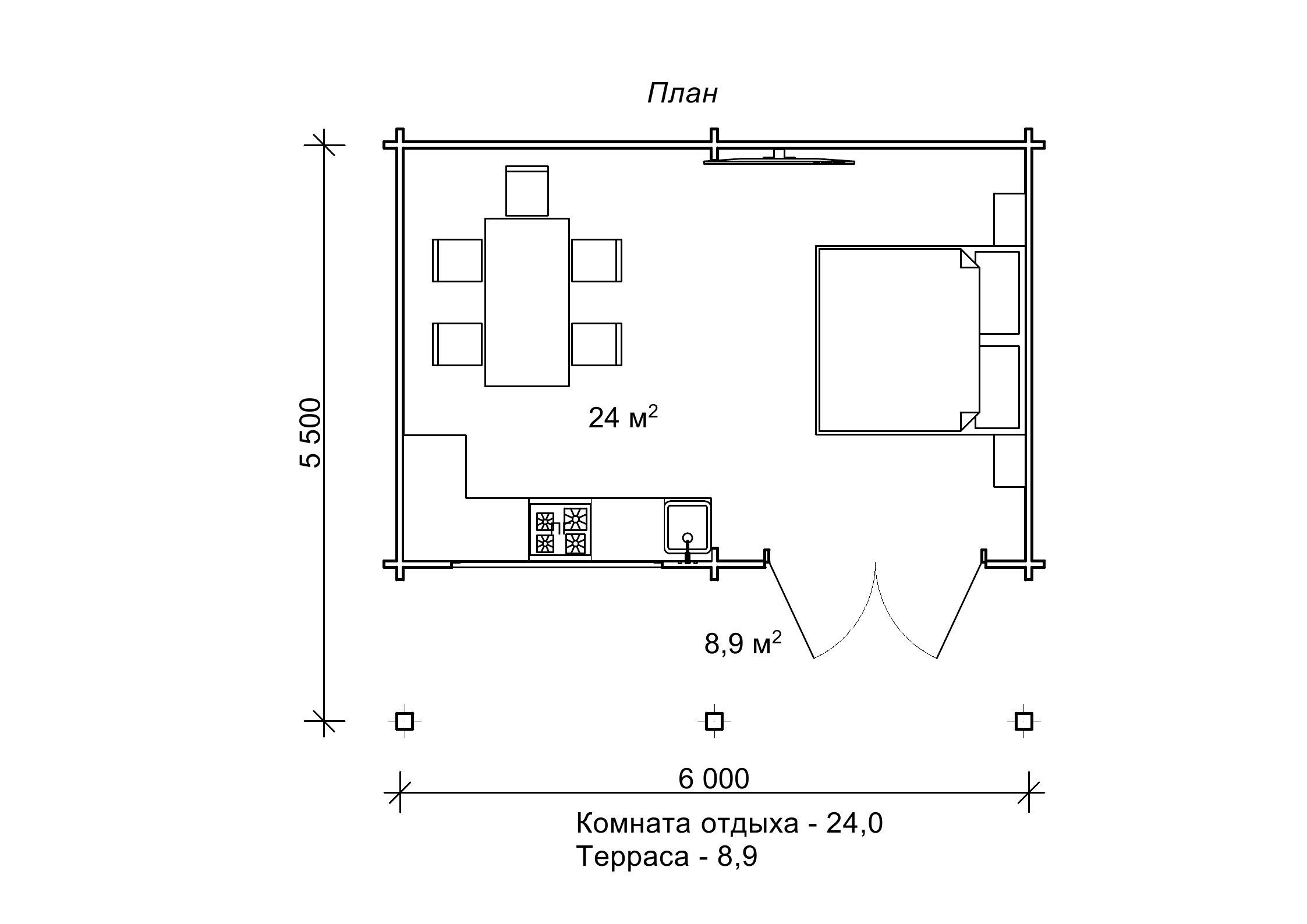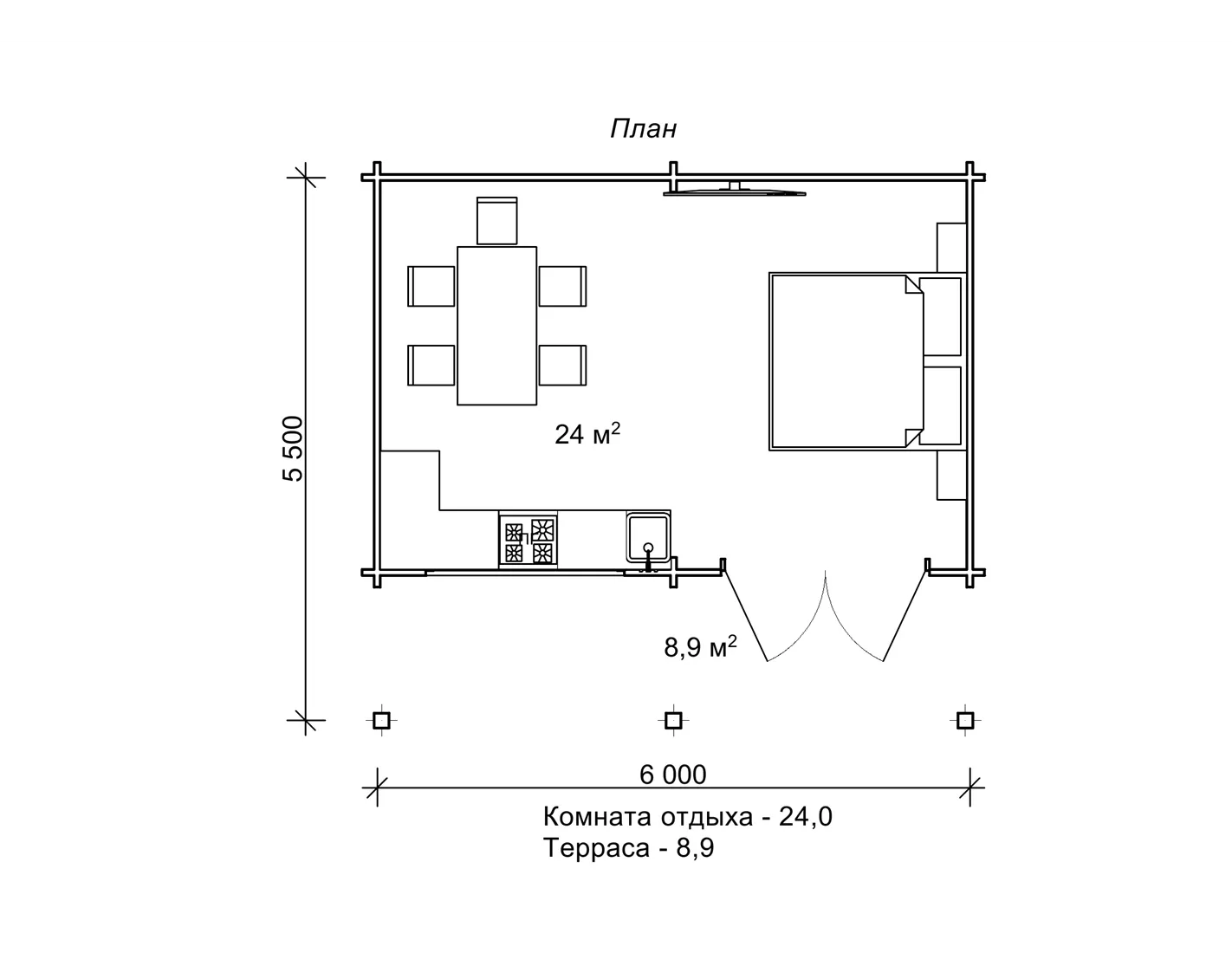 Планування дачі з бруса з однією кімнатою, 33 м2