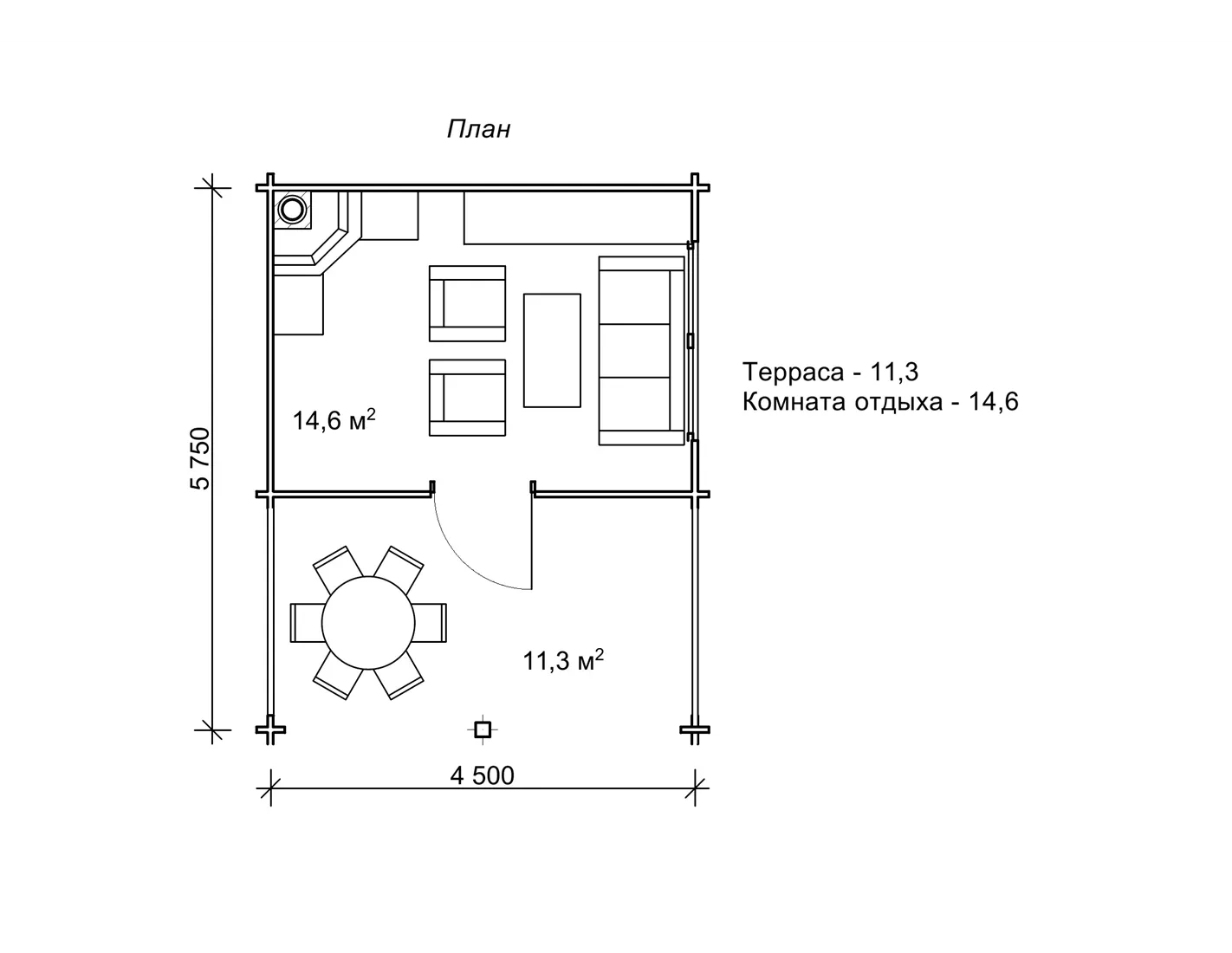 Планування будиночка 5,7 на 4,5 м з терасою