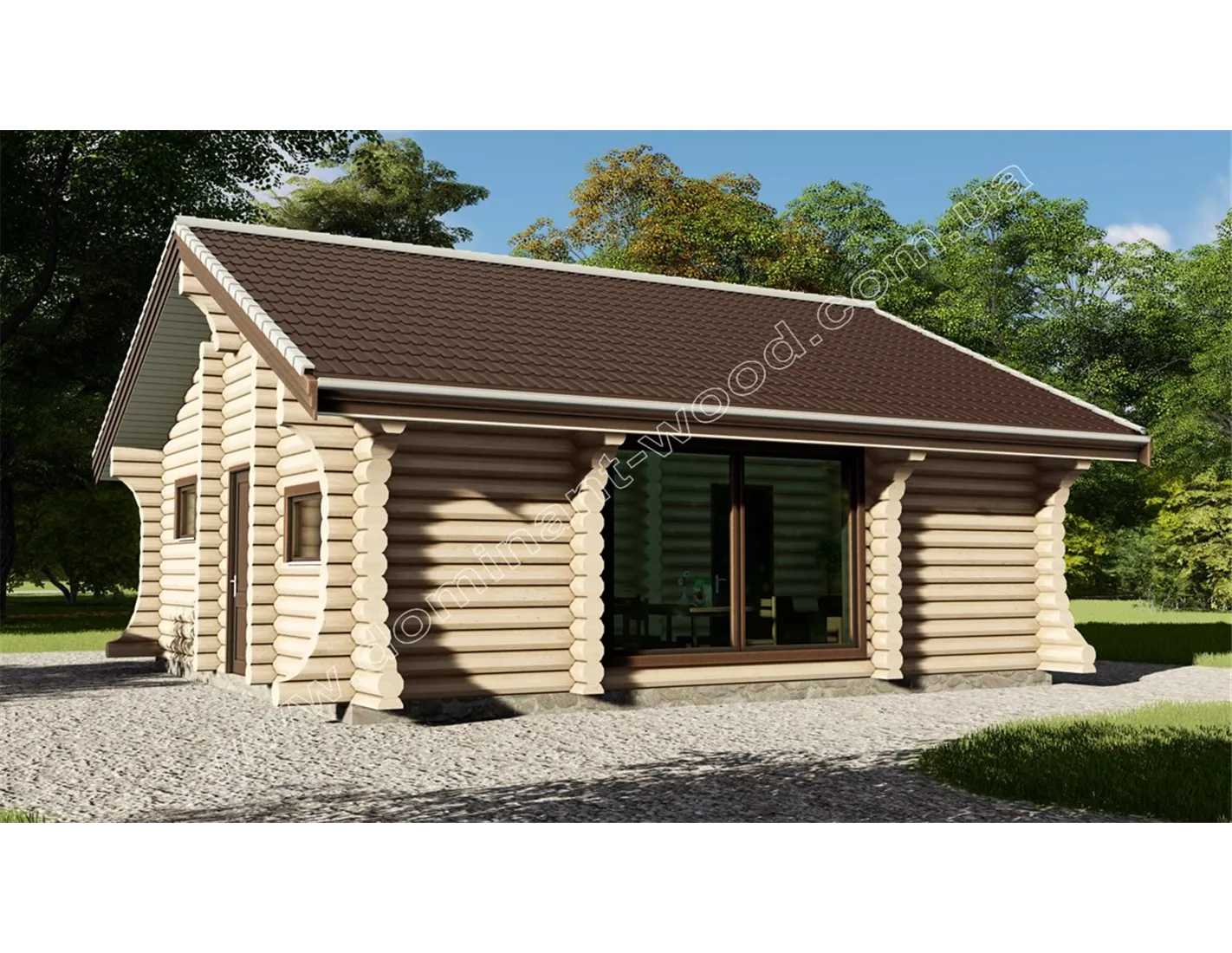Дуже колоритний будиночок зі зрубу «Часей» виглядає немов ошатна, дерев’яна скринька. Фігурні вигини зроблених з колод торців на фасадах будівлі в тандемі з великим вікном від підлоги до стелі надають будиночку чарівної вишуканості. Такий ефектний дизайн вигідно відрізняє проект «Часей» від інших будівель. Це неймовірно казкове місце подарує захоплююче дозвілля на природі та стане просто знахідкою для тих, хто мріє жити на дачі. Дерев’яний будиночок виглядає дуже компактно, але має гарну місткість. Площа будівлі складає 80,8 м2, параметри будівлі 8,1 м на 7,5 м. Усередині котеджу розташовуються дві спальні розмірами 9,9 м2 та 11,4 м2, кухня-студія та санвузол. Так що не тільки ви можете самі тут проживати в літню пору або використовувати котедж зі зрубу як гостьовий будинок, можна ще розглянути застосування проекту «Часей» у комерційному плані.