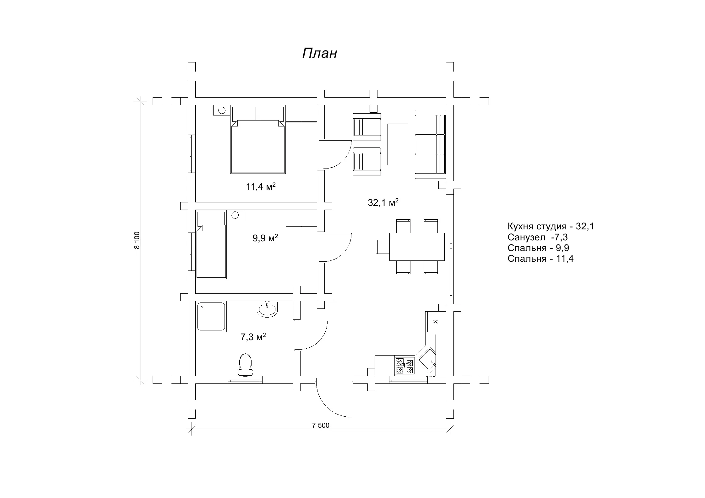 Двокімнатний будиночок із зрубу «Часей», площа 80,8 м2