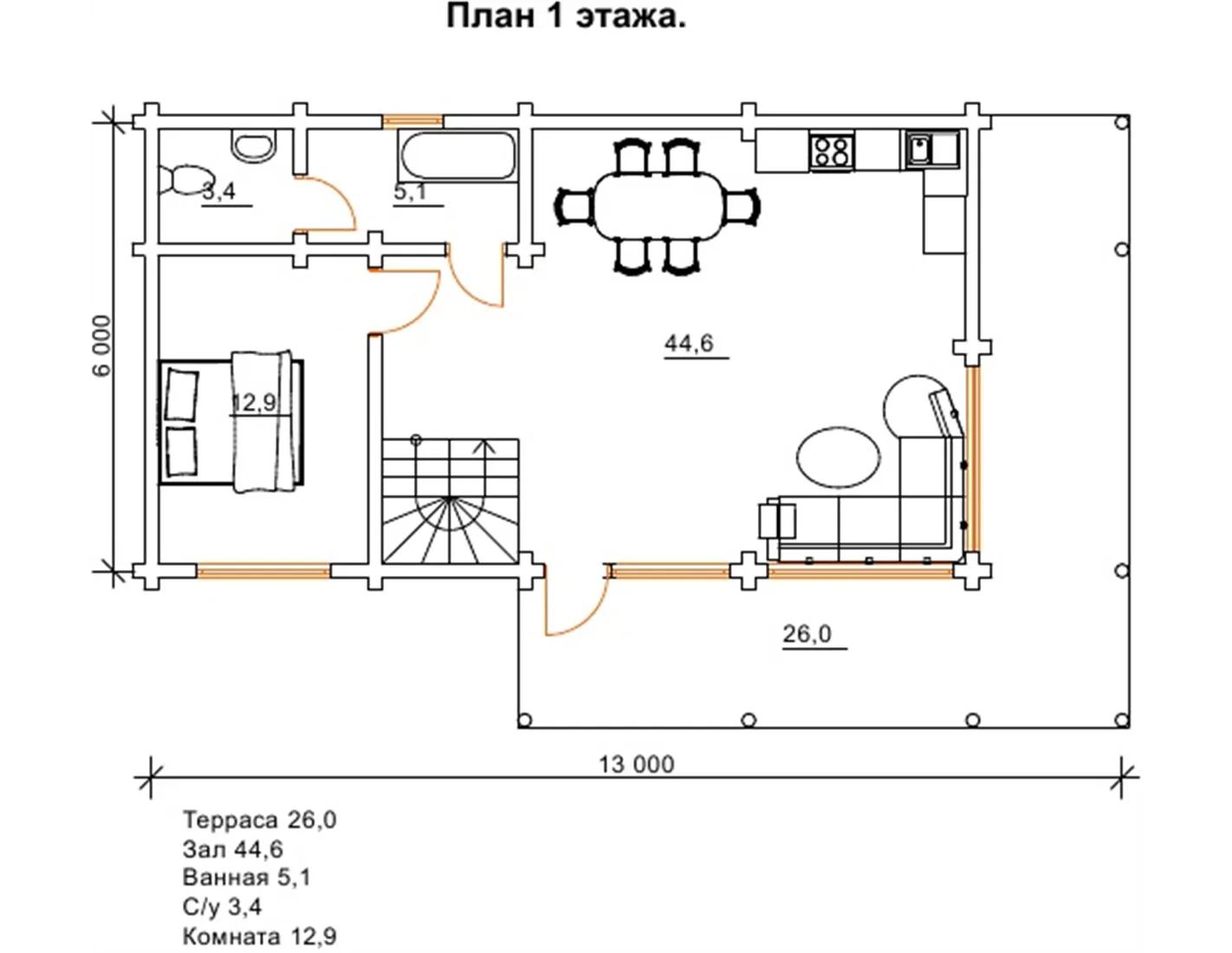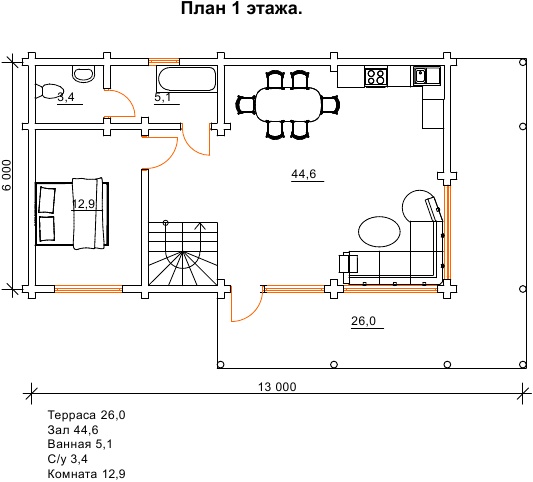 Котедж «Альтаїр» - проект заміського будинку з великими вікнами і просторою терасою. Котедж включає просторий зал з кухонною зоною, санвузол, ванну і кімнату. На другому поверсі розташовані санвузол і дві спальні. Індивідуальність і бездоганний смак господарів і творців цього будинку, підкреслюють вікна на всю стіну, які виходять із залу на терасу. Це дає безліч варіантів декору і тераси, і вітальні. Якщо ви плануєте використовувати будинок як будинок відпочинку для вашої родини і друзів, то на терасі відмінно розташується настільний теніс або більярд. Якщо ж ви плануєте більш спокійний відпочинок, то тут можна розташувати гамак і м’які меблі. Так як спорудження володіє трьома спальними кімнатами, то може вмістити велику кількість людей. Або ви можете переорієнтувати приміщення під ваші потреби і бажання, наприклад, спортзал або офісне приміщення. А для максимально раціонального дизайну приміщень пропонуємо вам ознайомитися з нашою публікацією: «Планування будинку: як розумно спланувати приміщення і жити з комфортом» dominant-wood.com.ua/uk/blog/statti/planuvannya-budinkiv. Зручне планування котеджу сприяє комфортному проведенню часу і відпочинку, а також проживанню в будь-який час року.