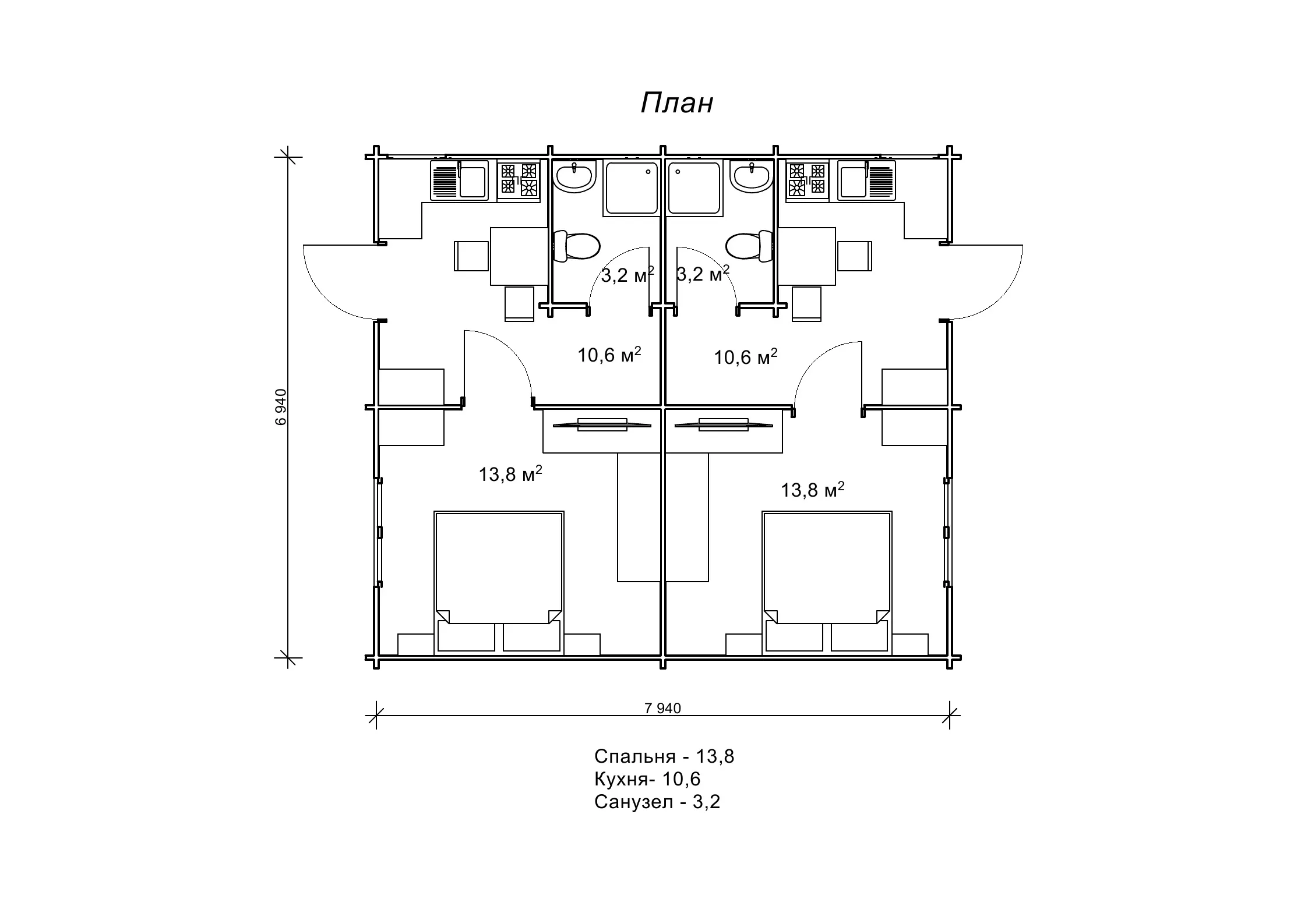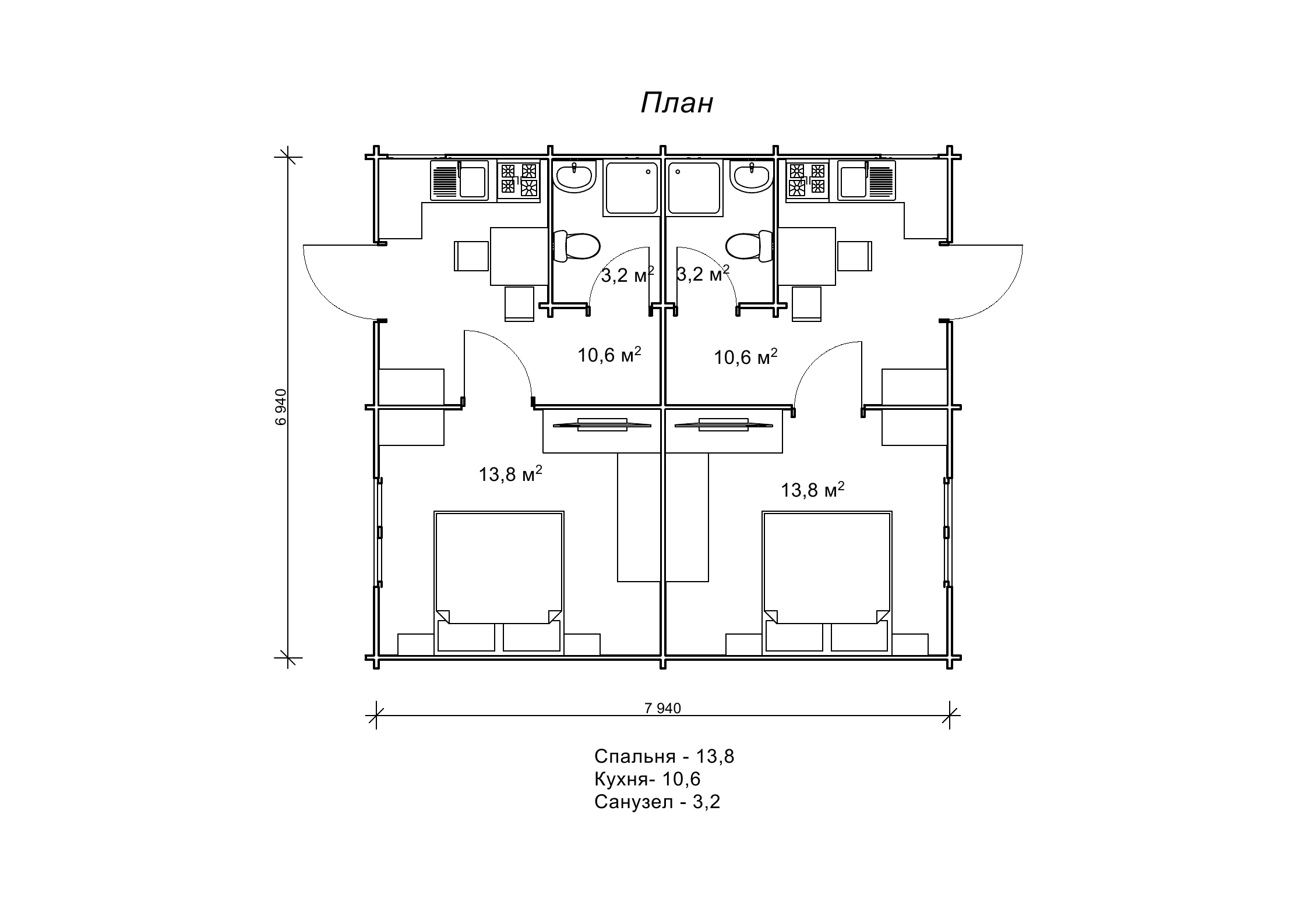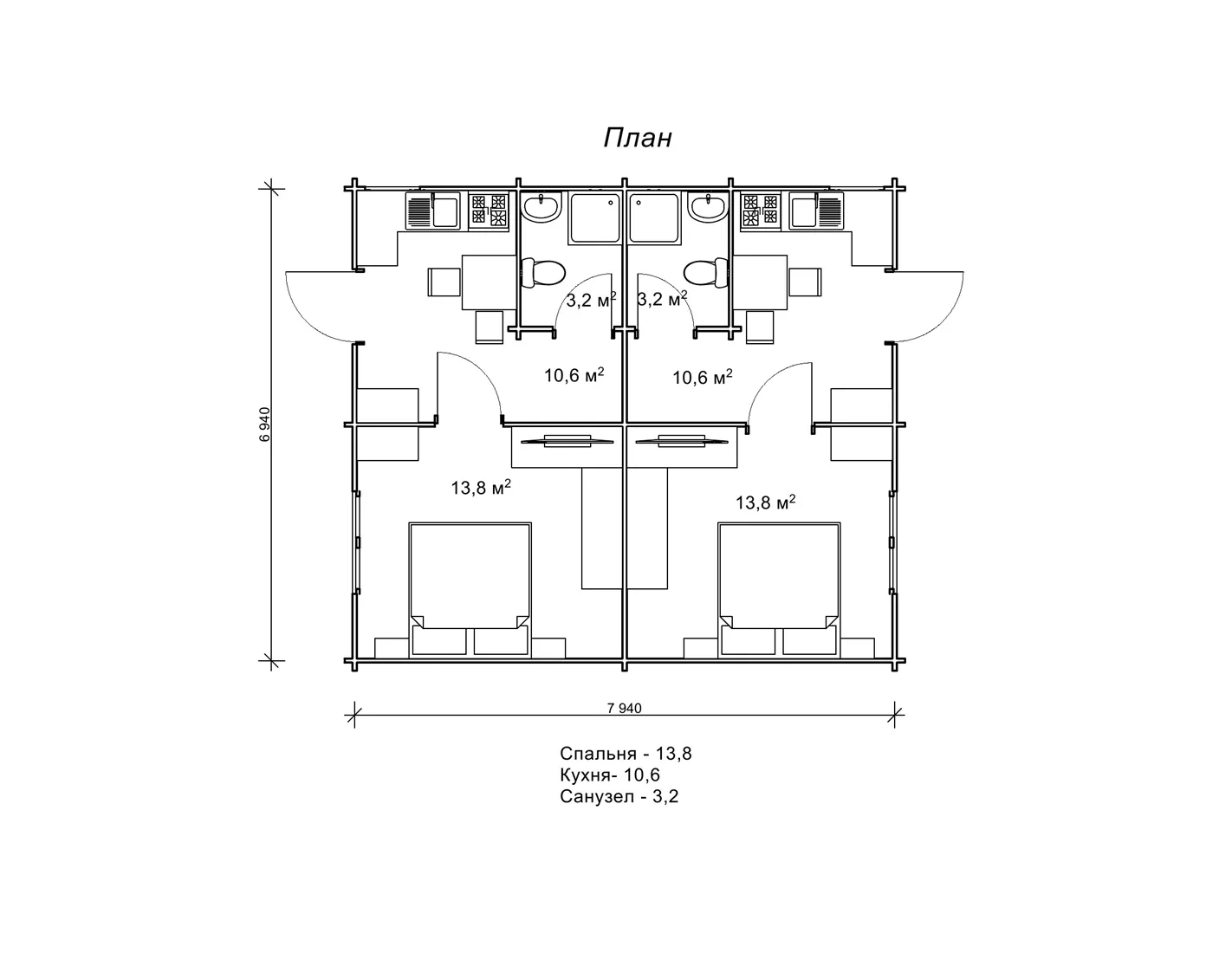 Будова сплановано в габаритах 6,9 на 7,9 м. Площа готового проекту курортного котеджу «Южана» становить 55,1 м2, він розрахований на два номери з санвузлами і окремим входом. У цьому гостьовому будиночку номера для гостей можна порівняти з повноцінними однокімнатними квартирами. Адже в кожному номері є спальня, кухня і санвузол. Уявіть тільки, як затишно буде тут відпочивати, маючи під боком все необхідне. Планування двох квартир котеджу «Южана» дзеркально відображається в номерах, вони повністю ідентичні. Гостьовий котедж з бруса прекрасно доповнить будь-який комплекс відпочинку, а його функціональність, проста симетрія архітектурних ліній і економічність споруди припаде до вподоби власникам готельного бізнесу.