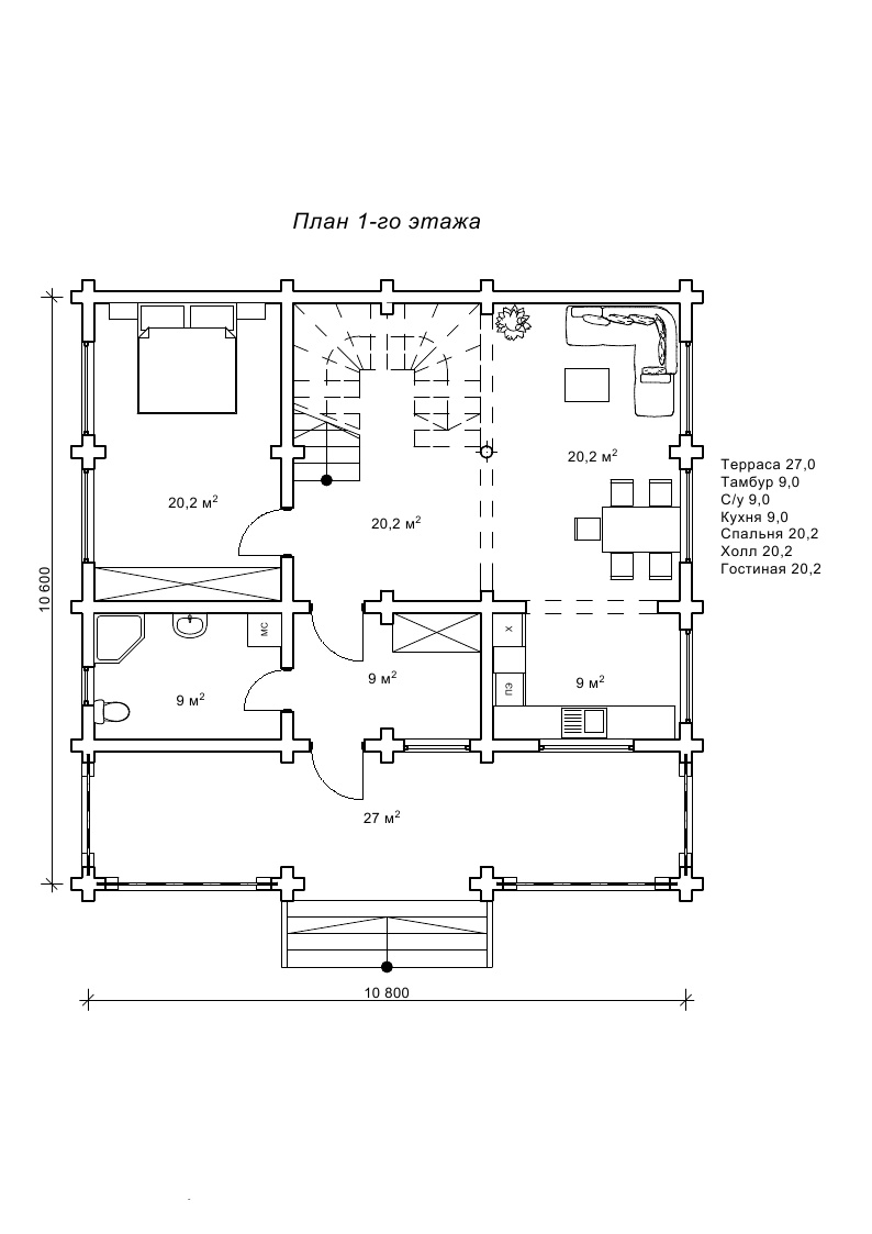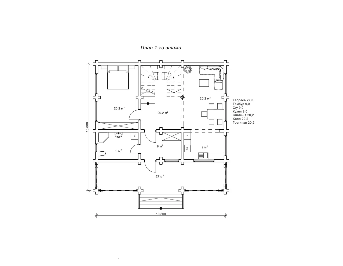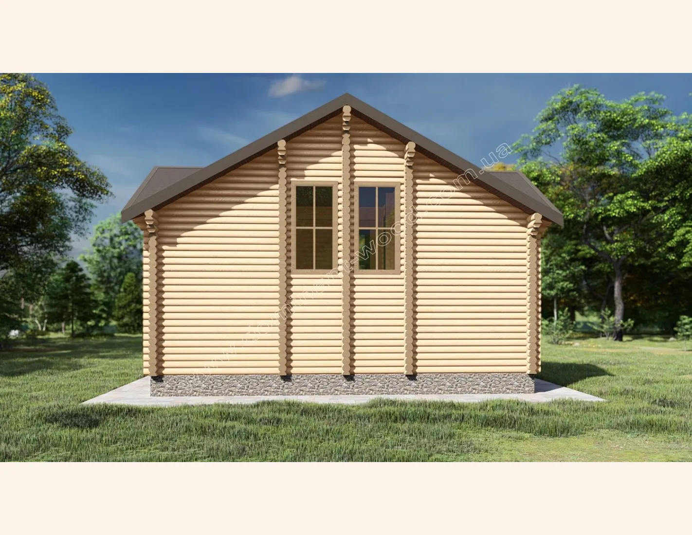 Проект Жартіна виконаний в оциліндрованому брусі на два поверхи, які включають просторі, світлі приміщення спалень, вітальні, кухні, тераси. Увійшовши до будинку, з тамбура відразу потрапляєш в студійний простір, який утворюється холом, вітальнею і кухнею. Таке планування особливо відкриває широту простору і можливості для реалізації цікавого дизайнерського оформлення інтер’єру. Дуже зручним рішенням планування виступає наявність спальні на першому поверсі. Такий варіант підходить для сімей, де підростають маленькі діти або є літні родичі, яким важко весь час підніматися і спускатися по сходах. Дуже зручною кімната буде для гостей, які приїдуть погостювати довше. Сучасний замовник, без сумніву, оцінить наявність в будинку балкончика і великої літньої тераси, де можна проводити багато часу в теплі, літні місяці.