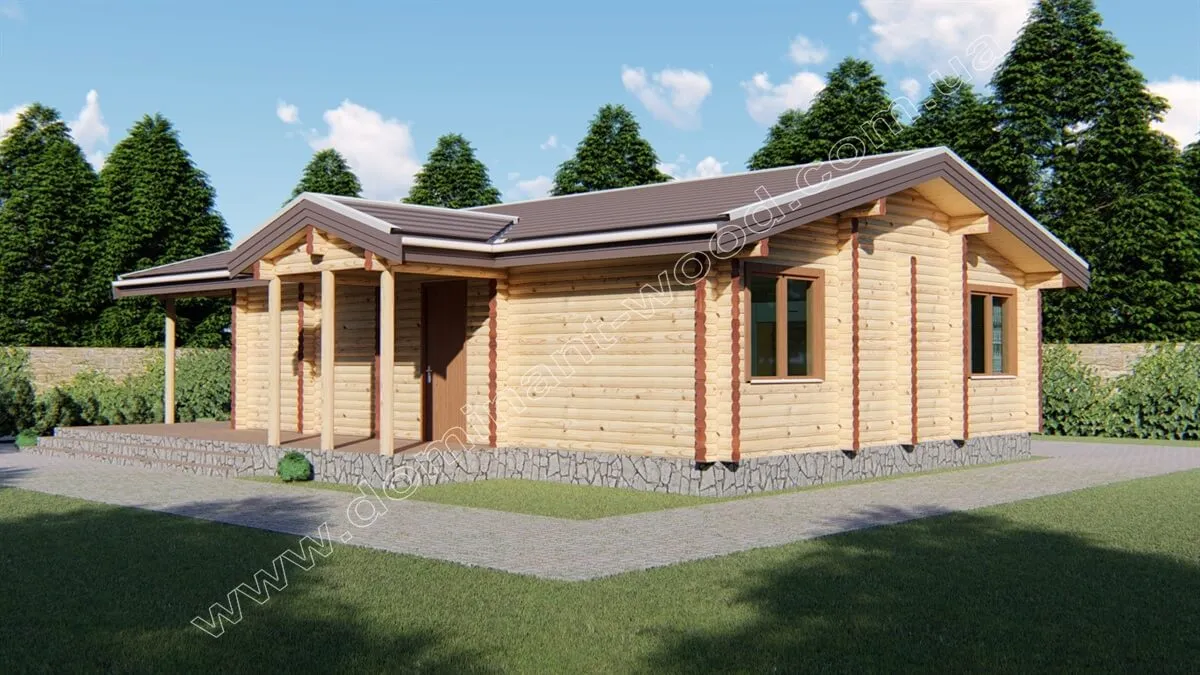 Котедж «Кармел» - класична модель дерев'яного, одноповерхового зрубу. Це миловидний, дерев'яний будиночок з масивним навісом над просторою терасою і бічним входом під козирком на ґанку. «Кармел» обов'язково сподобається господареві дачної ділянки, який хоче побудувати собі добротний будиночок, щоб використовувати його цілий рік і залишатися в котеджі зі зрубу скільки знадобиться. Для того щоб отримати тепле житло, можна вибрати для побудови проекту «Кармел» товщину колод від 200 мм. Якщо ж ви бажаєте придбати річний котедж для відпустки, то вам цілком вистачить товщини стін 160-180 мм.