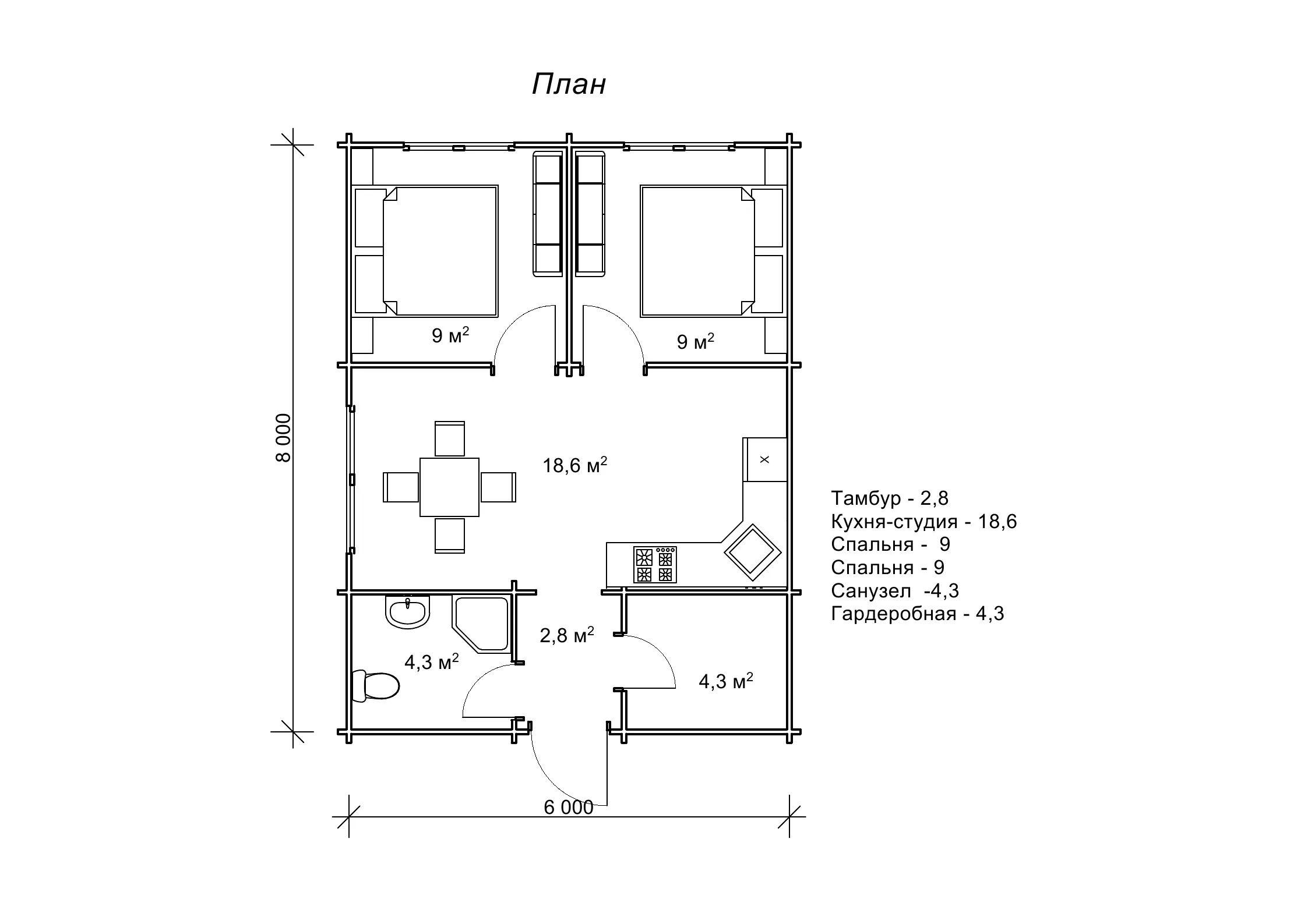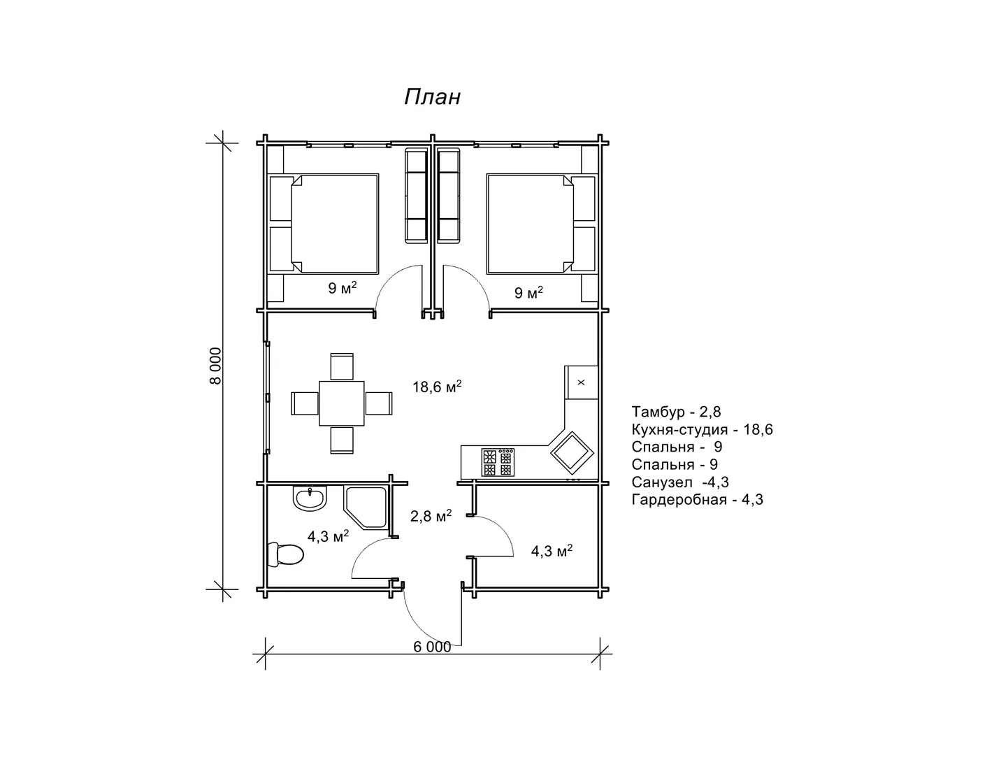 Будинок з бруса 6х8 м з двома спальнями - «Карлі»