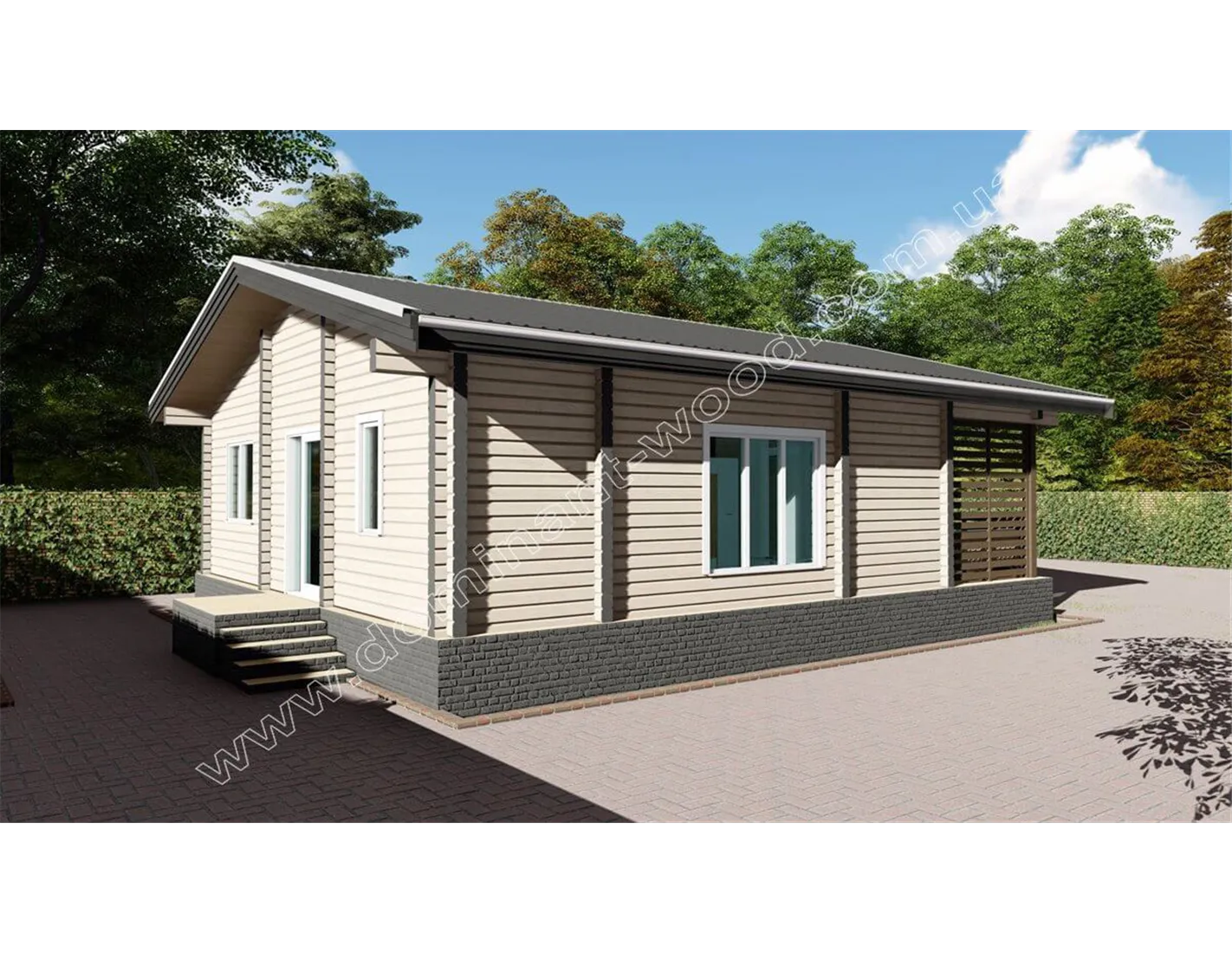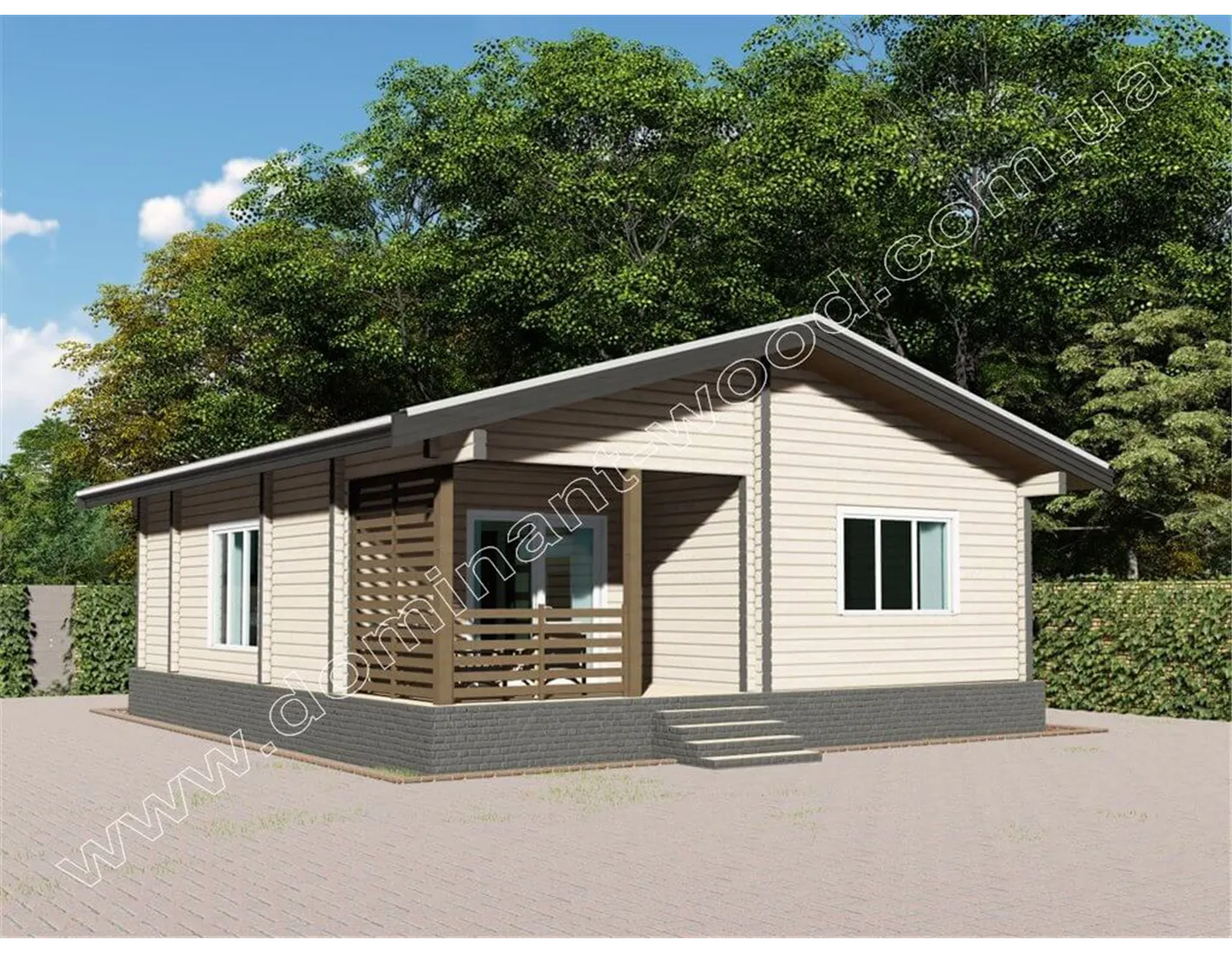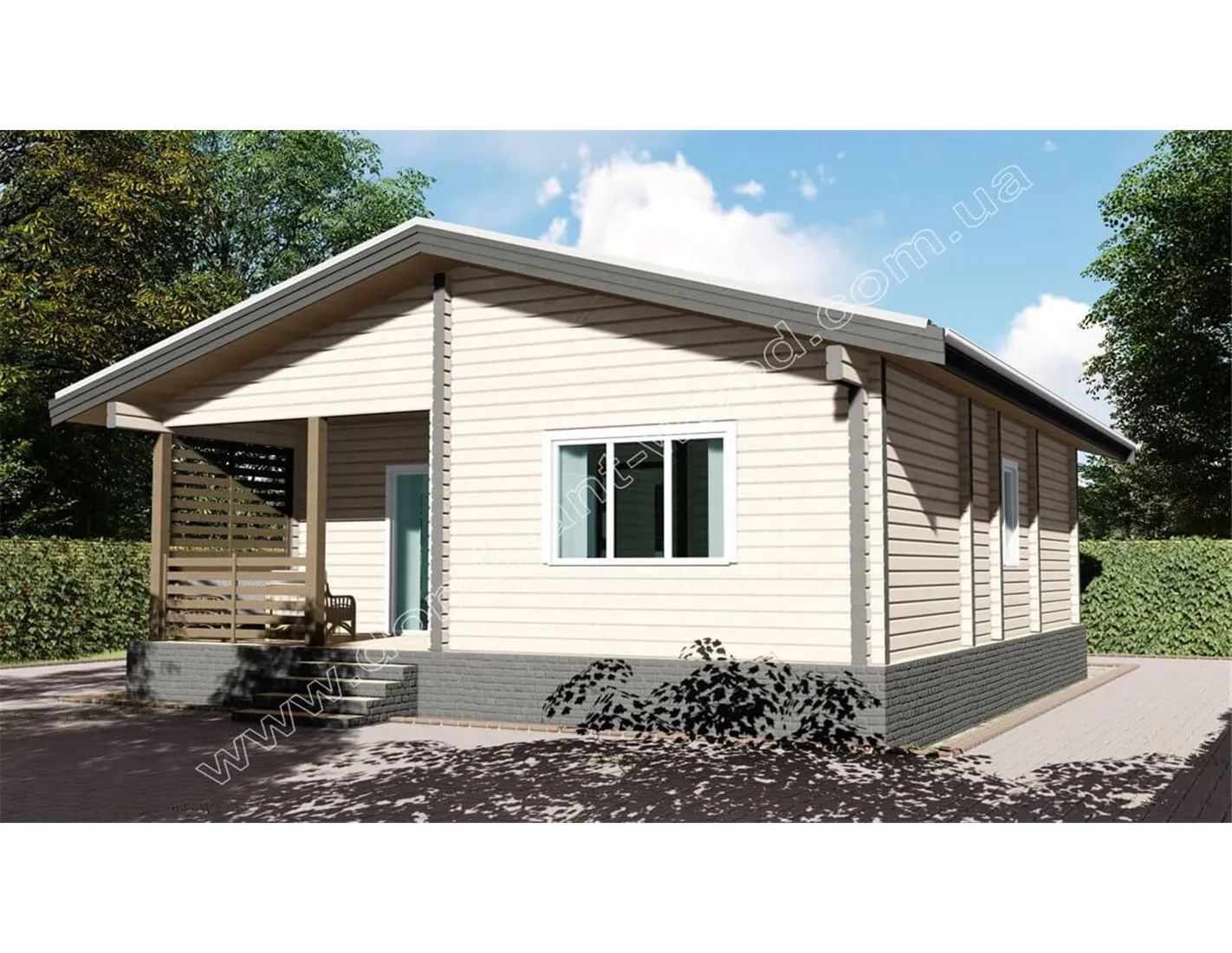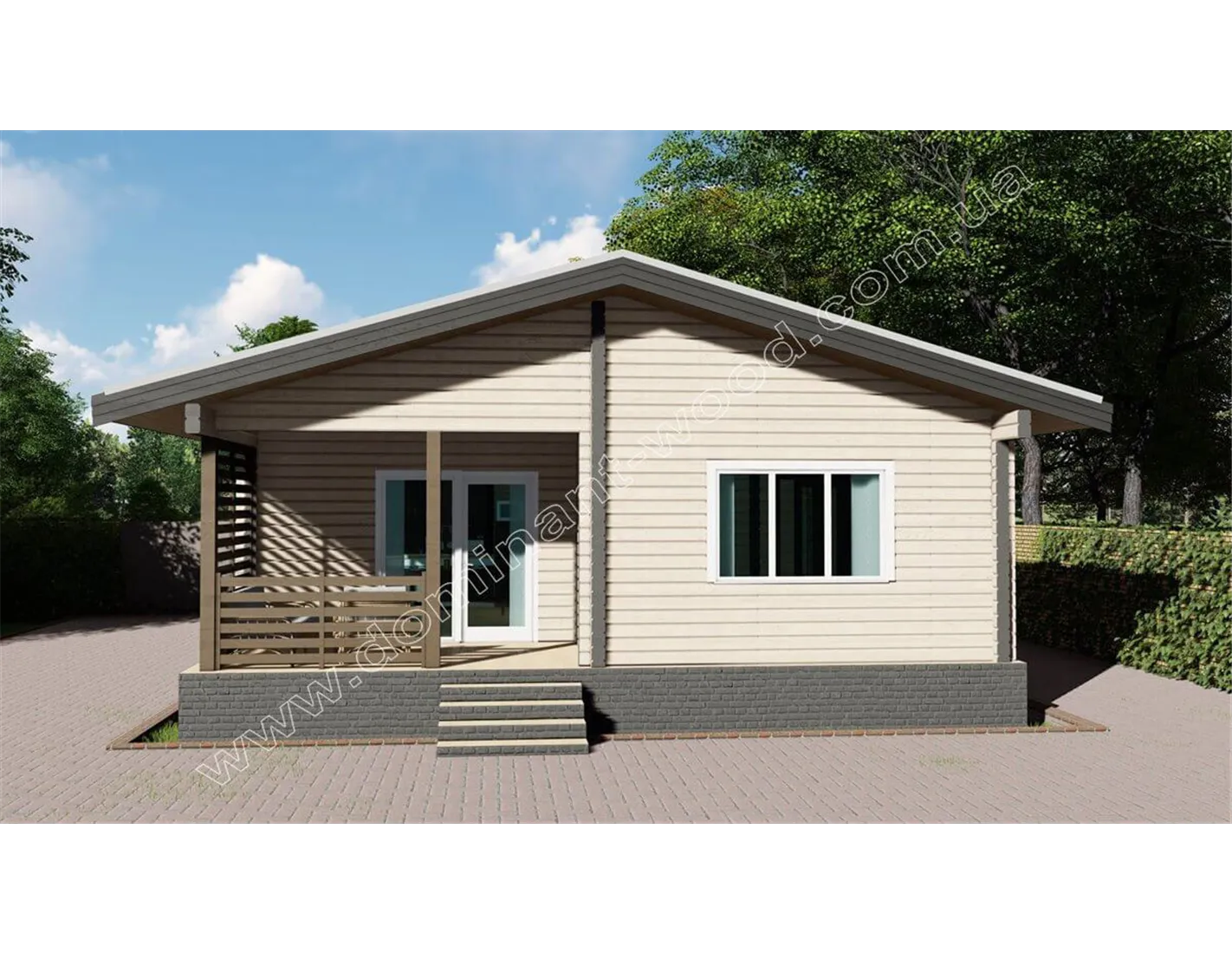 Лаконічний і акуратний дизайн дерев’яного будиночка «Навад» сподобається прихильникам натуральної краси та простого зовнішнього вигляду. Мінімум деталей декору, максимум функціональності і простих, прямолінійних форм в поєднанні з великими, квадратними вікнами роблять котедж «Навад» своєрідним і привабливим. Єдина яскрава риса дерев’яного котеджу - це, мабуть, затишна і невелика тераса під одним зі схилів даху. Добротні стіни з просушеного і відшліфованого масиву дерева надають споруді монолітності і презентабельності. Гарна функціональність закладена в планування внутрішніх приміщень проекту «Навад».