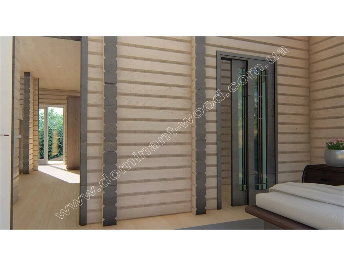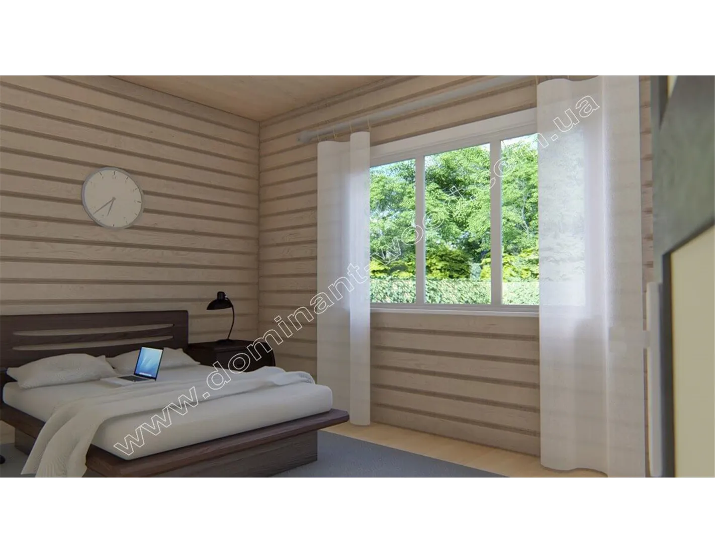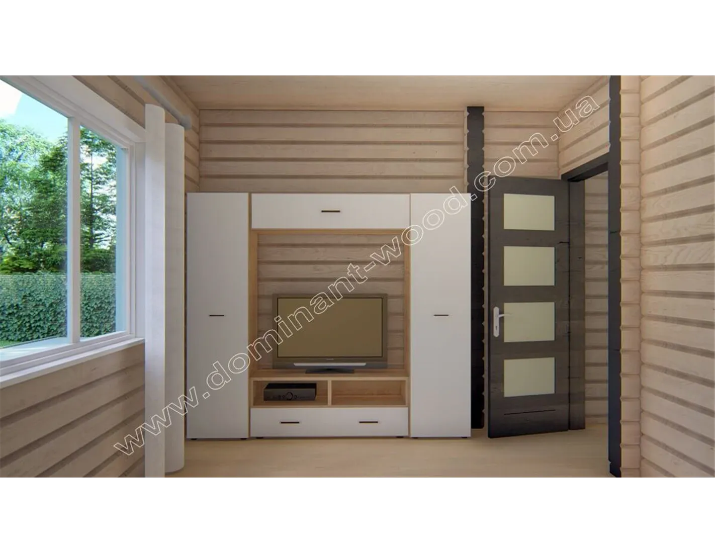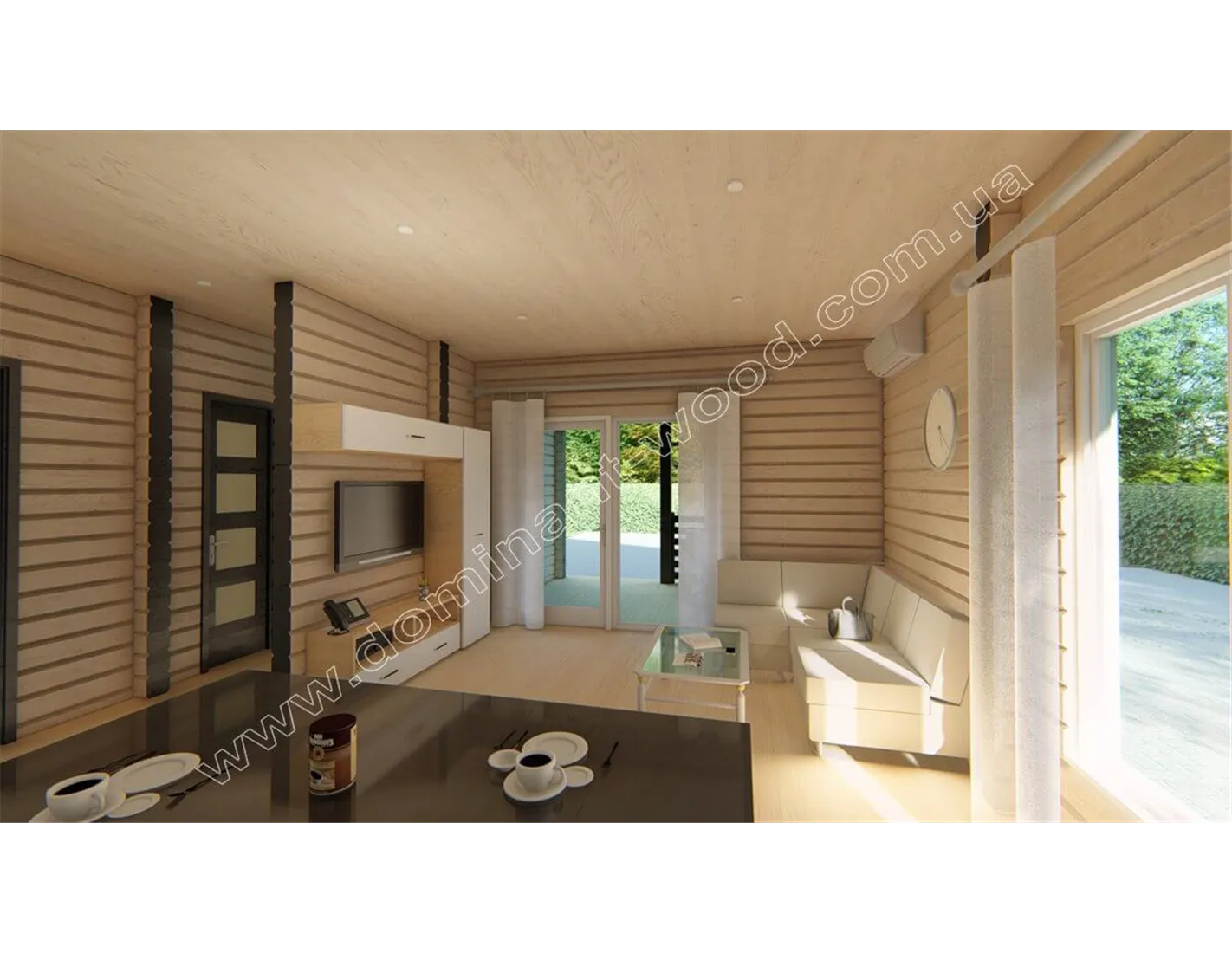 Лаконічний і акуратний дизайн дерев’яного будиночка «Навад» сподобається прихильникам натуральної краси та простого зовнішнього вигляду. Мінімум деталей декору, максимум функціональності і простих, прямолінійних форм в поєднанні з великими, квадратними вікнами роблять котедж «Навад» своєрідним і привабливим. Єдина яскрава риса дерев’яного котеджу - це, мабуть, затишна і невелика тераса під одним зі схилів даху. Добротні стіни з просушеного і відшліфованого масиву дерева надають споруді монолітності і презентабельності. Гарна функціональність закладена в планування внутрішніх приміщень проекту «Навад».