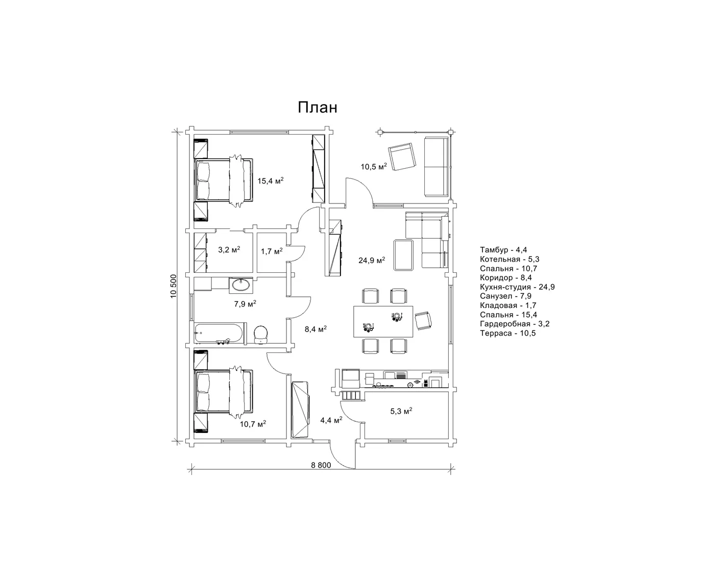 Планування двокімнатного котеджу 10,5х8,8 м «Навад», площа 92,4 м2