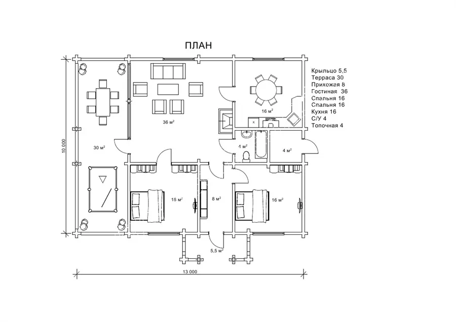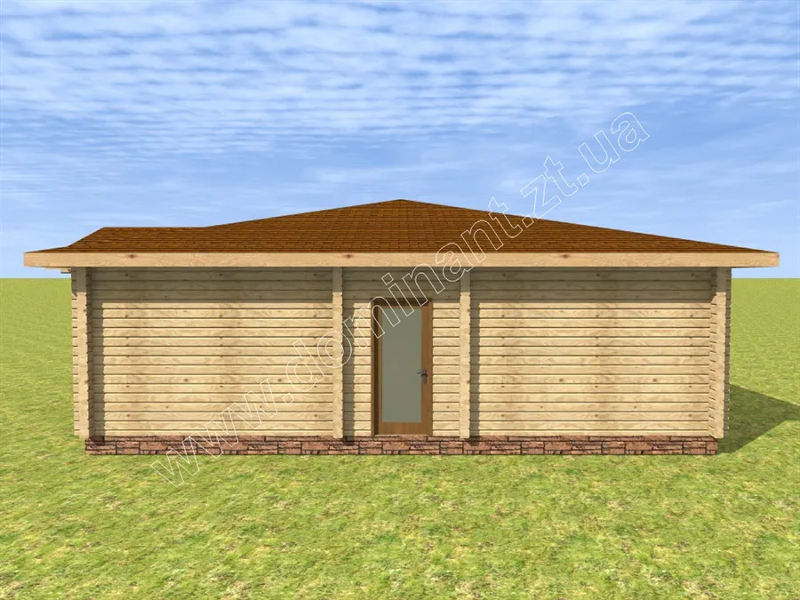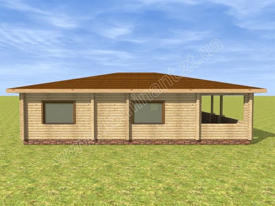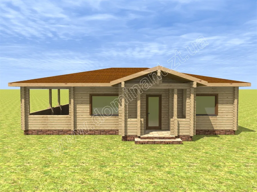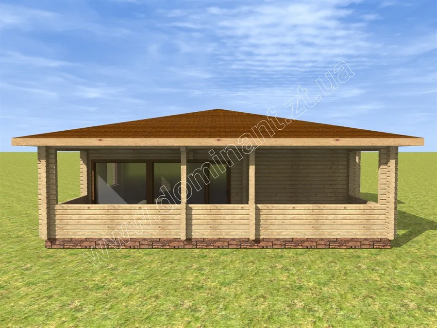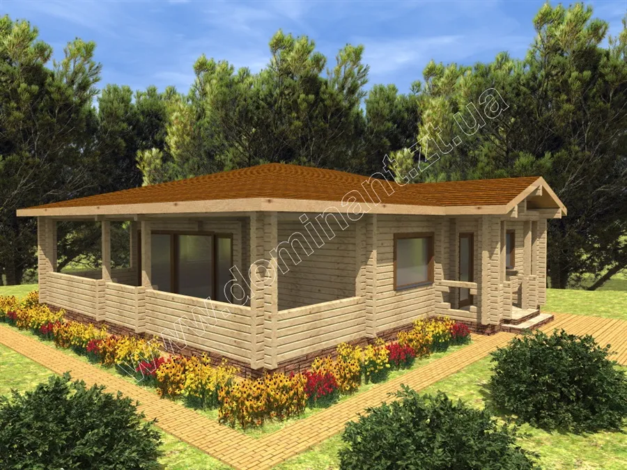 Проект дерев’яного будинку Сеньйор, без сумніву, заслуговує на вашу увагу, тому що є чудовим рішенням для дачного котеджу. Планування даного проекту включає затишний ганок, передпокій, вітальню, кухню, дві спальні, санвузол і топкову. На окрему увагу заслуговує велика тераса, де є хороша можливість помістити більярдний стіл і столову зону. У проекті чудово продумані всі умови для комфортного сезонного проживання і цікавого дозвілля. З першого погляду на цей будинок, можна в нього закохатися. Любителям великих просторів сподобається величезна тераса, шанувальників бунгало приверне характерна архітектура будівлі, цінителів світла причарує велика кількість вікон і їхній розмір.