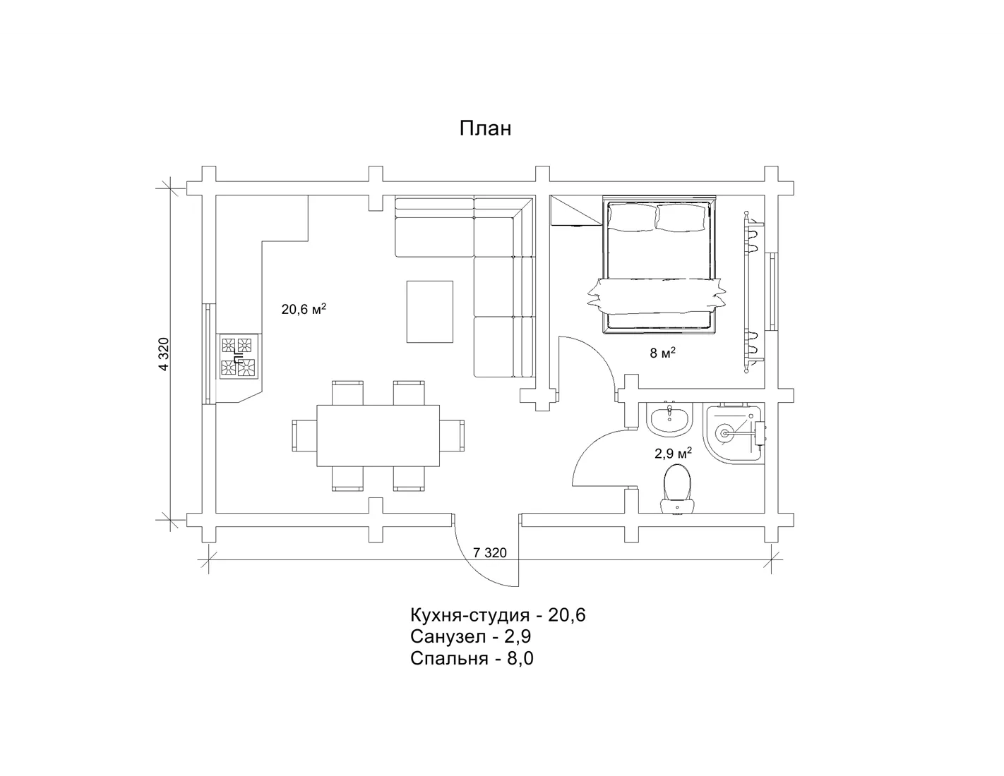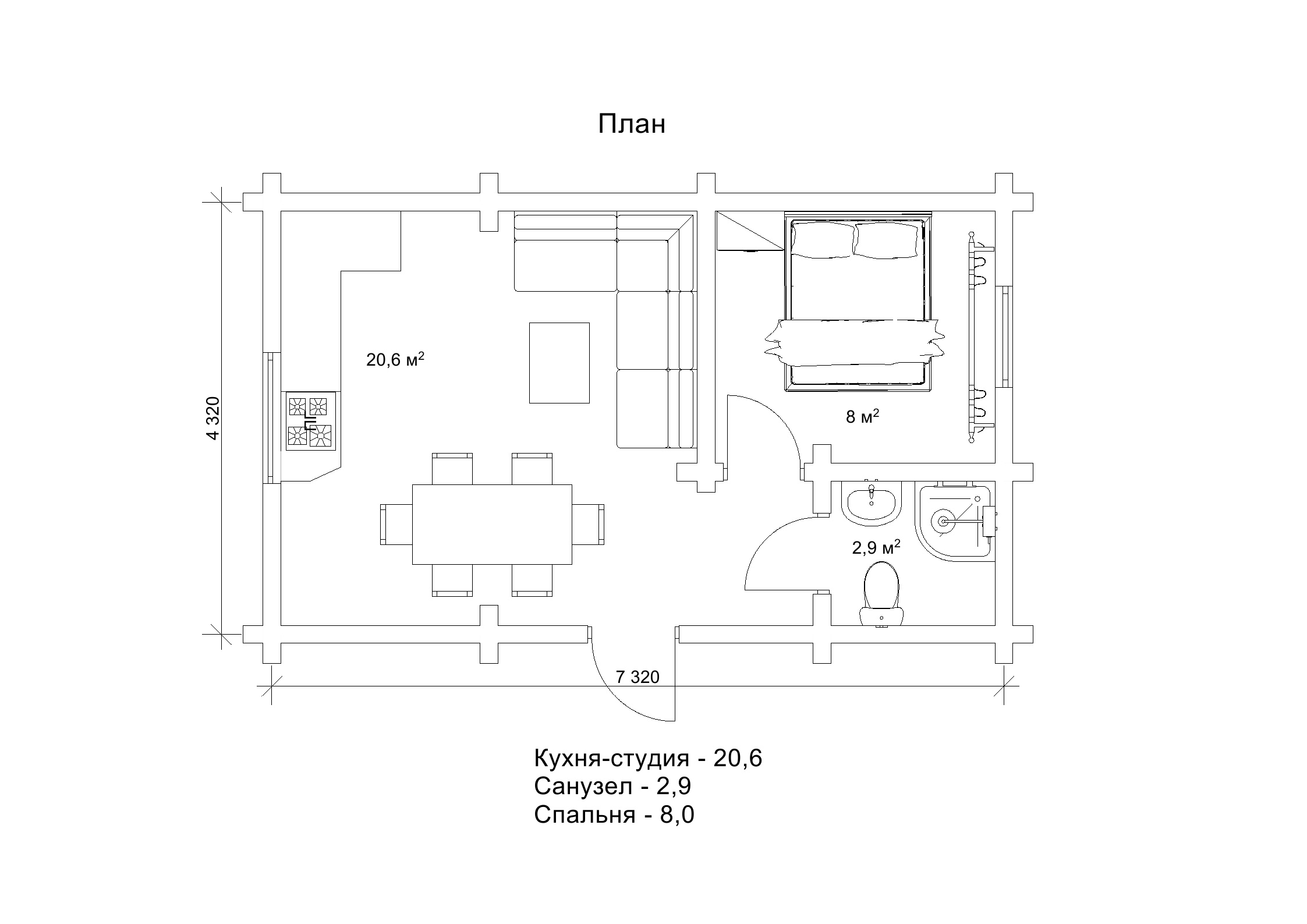 Дуже простий зовнішній вигляд без вишукувань обумовлює простоту і внутрішнього наповнення гостьового котеджу «Рейнар». Параметри забудови проекту - 4,3 на 7,3 м, загальна площа дерев’яного котеджу становить 31,6 м2. Це дуже компактні розміри, на яких нам вдалося створити дивовижний комфорт. Судіть самі, площа житлової кімнати з двоспальним ліжком становить 8 м2, розмір кухні-студії - 20,6 м2. Крім того котедж «Рейнар» оснащений санвузлом площею 2,9 м2, де поміщається душова кабінка. Це комфортні умови для тимчасового дозвілля сімейної пари в готельному комплексі. Крім того, такий гостьовий зруб цілком може використовуватися в якості дуже затишного дачного будиночка.