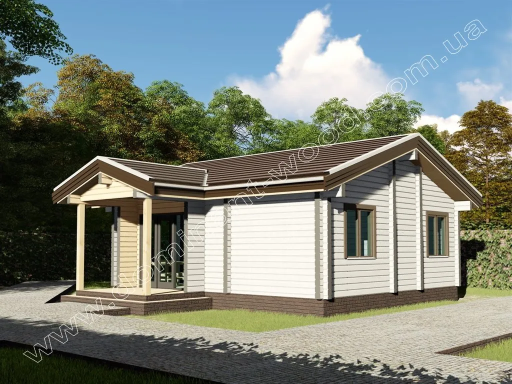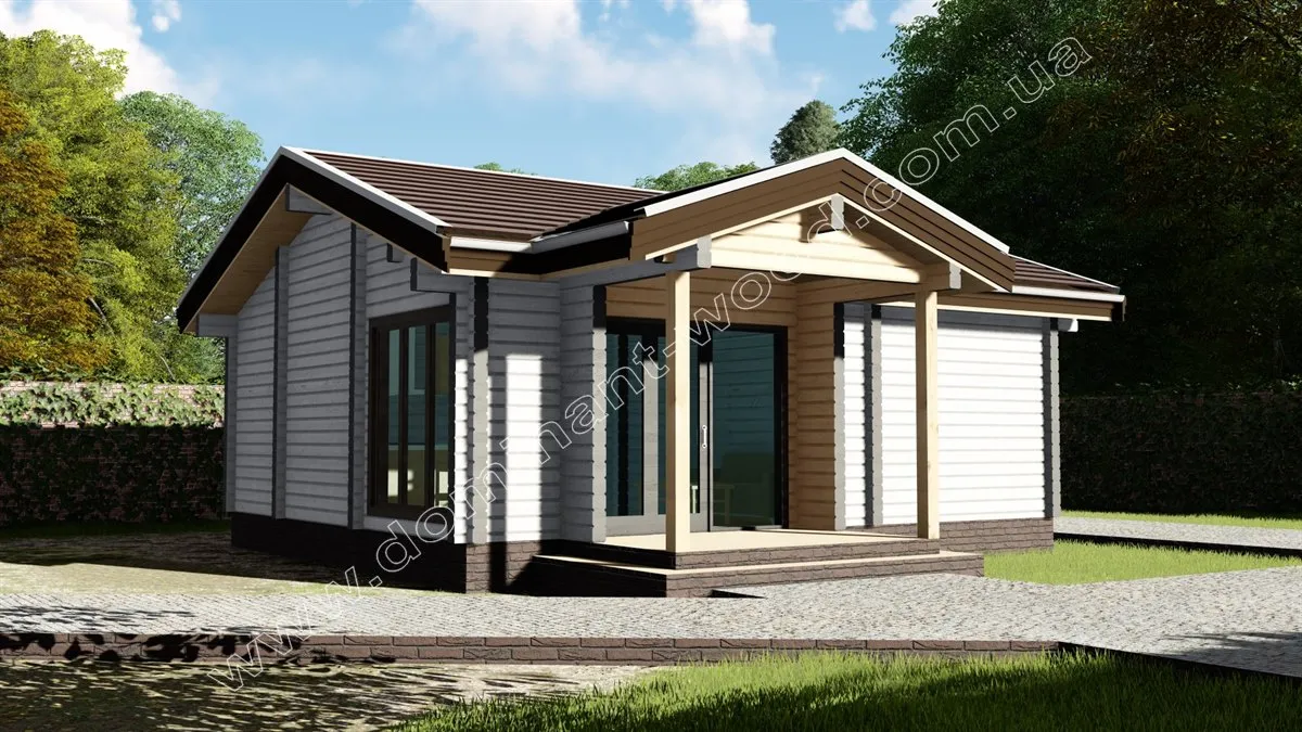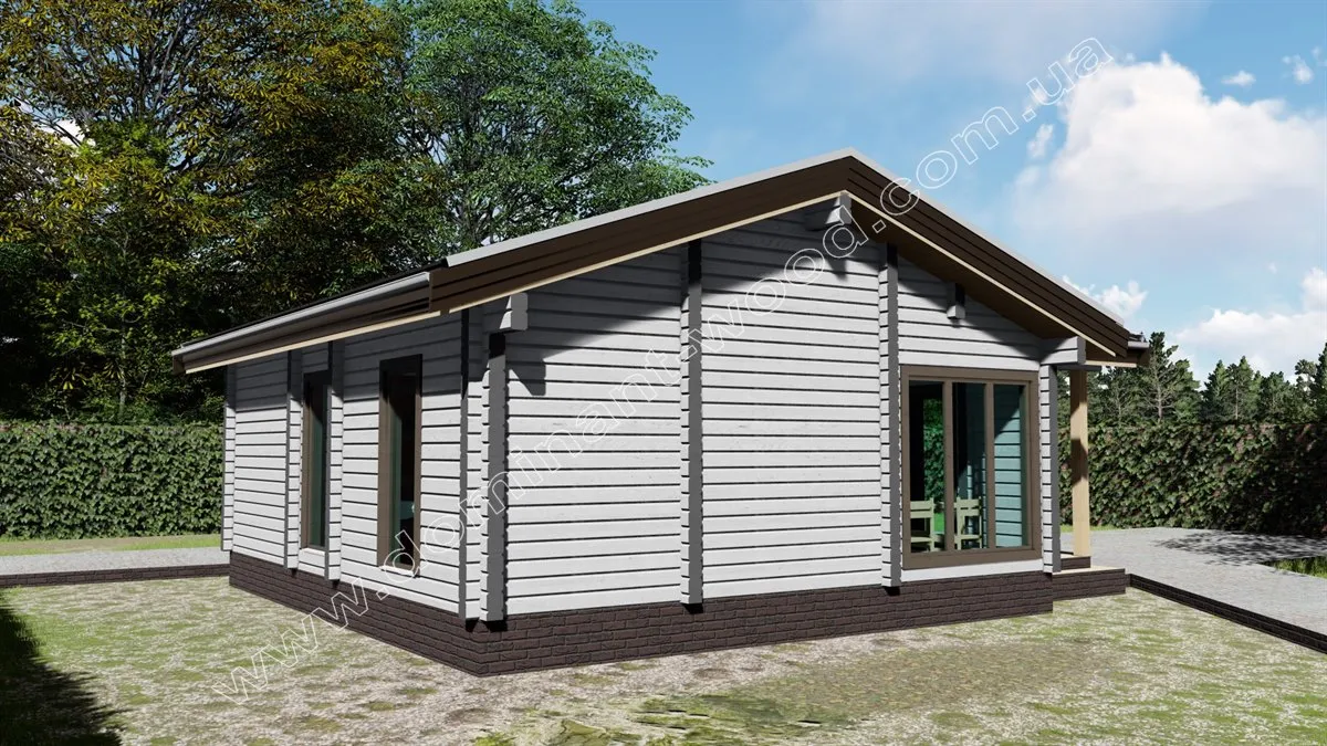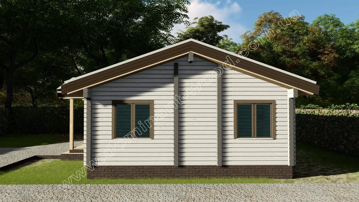Дерев’яний будинок «Ягмір» виконаний в класичному стилі одноповерхового котеджу, являє собою практичний і економічний вибір житла. Лаконічна архітектура проекту не містить громіздких елементів декору. Родзинкою будиночка назвемо ґанок під навісом в обрамленні великих вікон від підлоги до стелі. Головна характеристика проекту «Ягмір» - мінімалізм. Цей проект найбільше підійде тим, хто хоче заощадити місце на ділянці і отримати більше прибудинкової території, але в той же час отримати повноцінний, житловий будинок.
