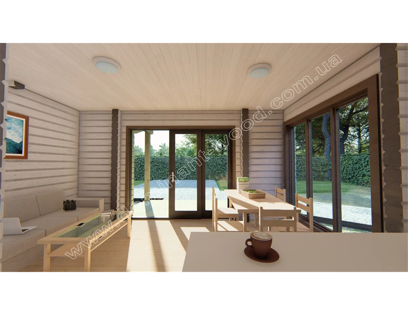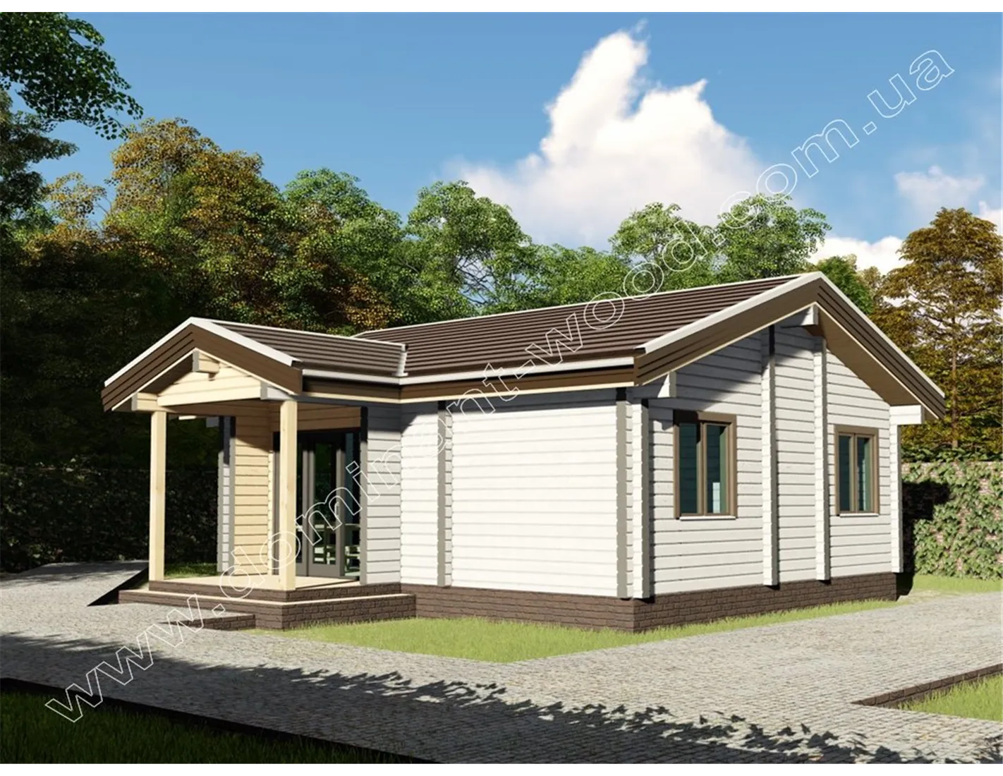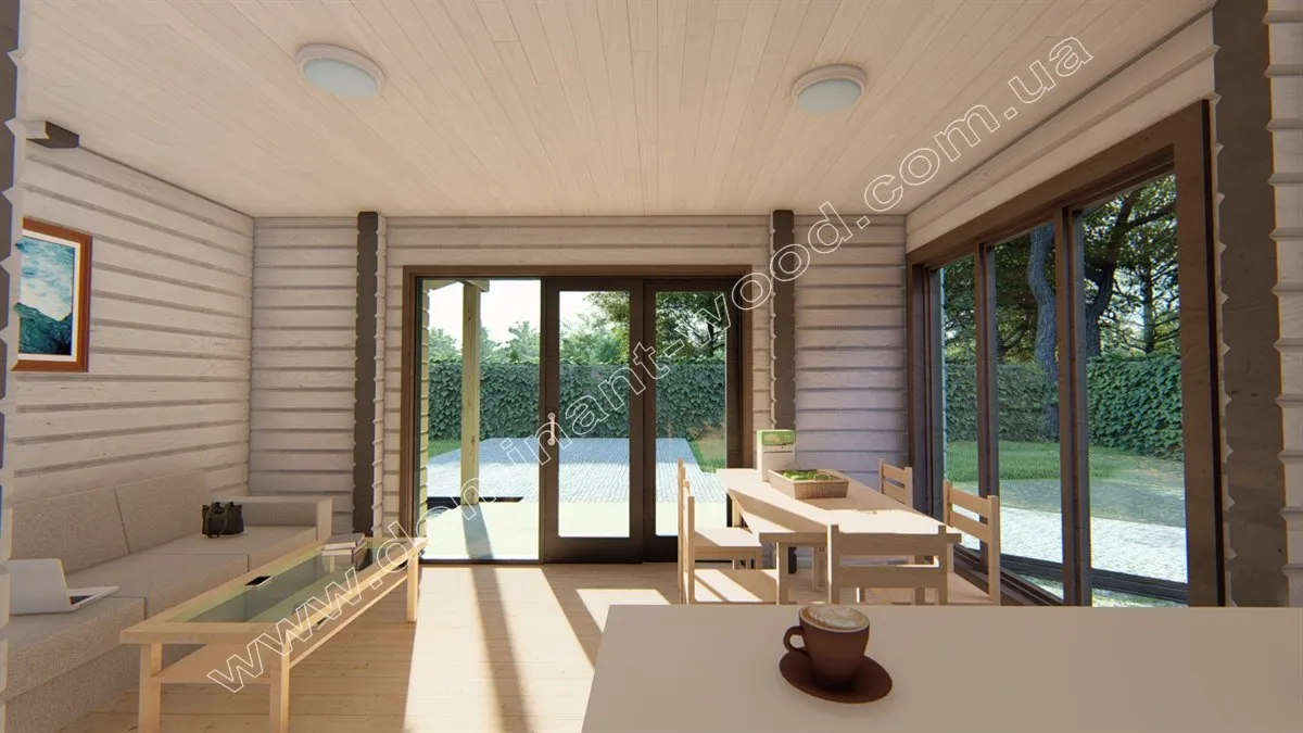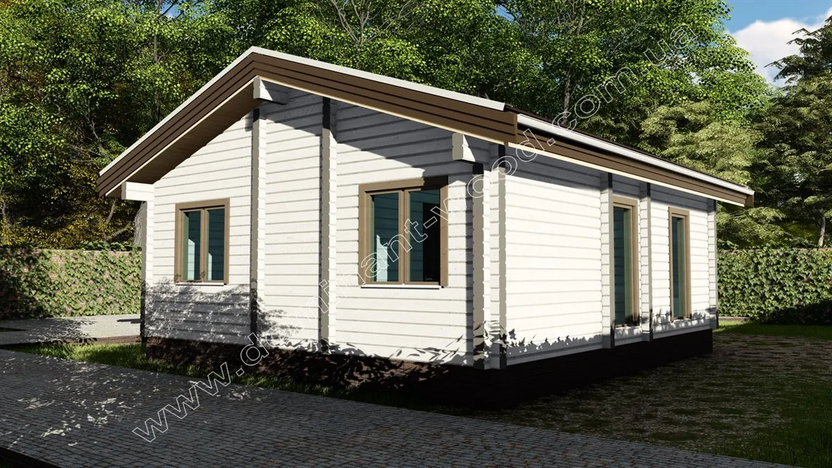 Дерев’яний будинок «Ягмір» виконаний в класичному стилі одноповерхового котеджу, являє собою практичний і економічний вибір житла. Лаконічна архітектура проекту не містить громіздких елементів декору. Родзинкою будиночка назвемо ґанок під навісом в обрамленні великих вікон від підлоги до стелі. Головна характеристика проекту «Ягмір» - мінімалізм. Цей проект найбільше підійде тим, хто хоче заощадити місце на ділянці і отримати більше прибудинкової території, але в той же час отримати повноцінний, житловий будинок.