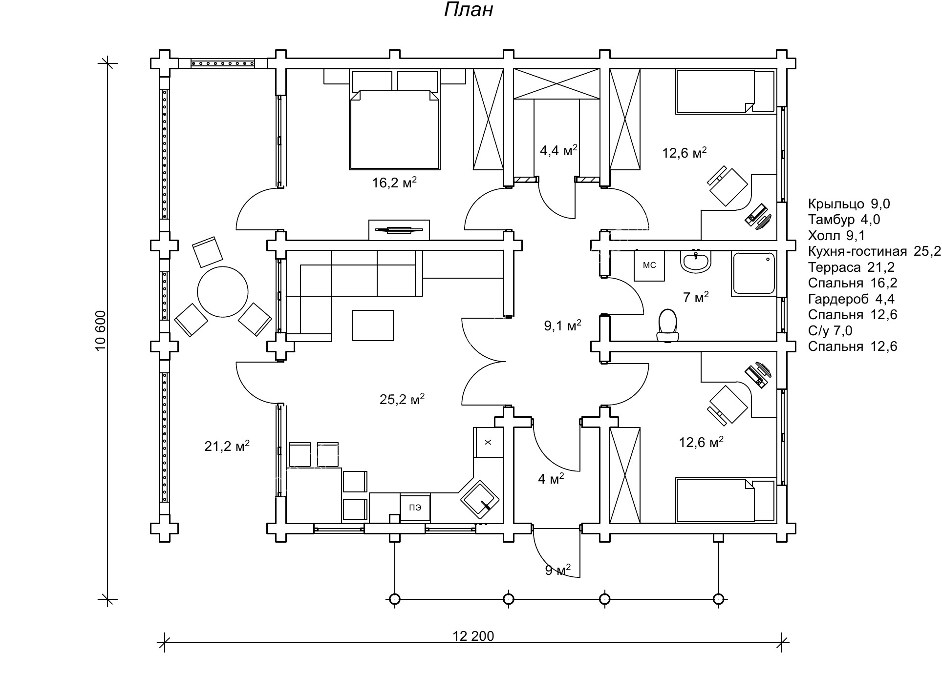 Габаритні розміри котеджу складають 10,6 м на 12,2 м. Як свідчить багаторічний практичний досвід дерев’яного будівництва, такі розміри споруди дозволяють оптимально спланувати внутрішнє наповнення будинку для максимального комфорту всіх домочадців. План котеджу містить ганок, тамбур, хол, гардероб, санвузол, три спальні, вітальню, поєднану з кухнею, і літню терасу. Характерною особливістю проекту є повністю окреме розміщення всіх спалень в будинку по різних сторонах. Як видно, на плані немає суміжних житлових кімнат. Таким чином, ніхто нікому не заважає, і є прекрасна можливість повністю усамітнитися і відпочити у власній кімнаті.
