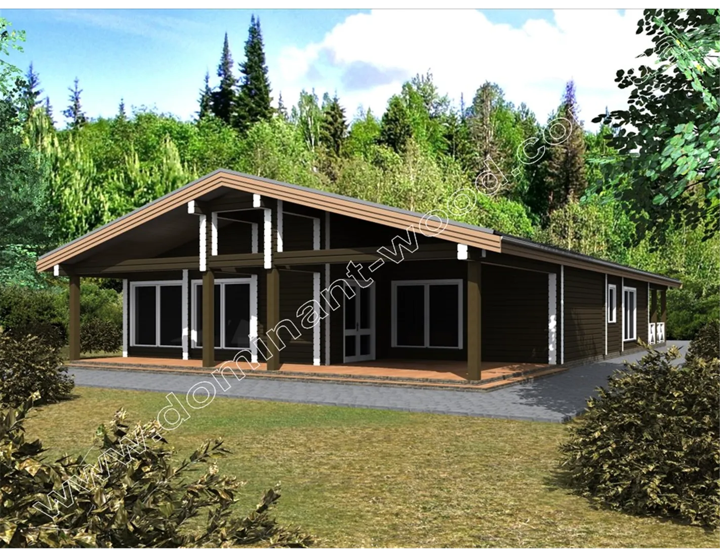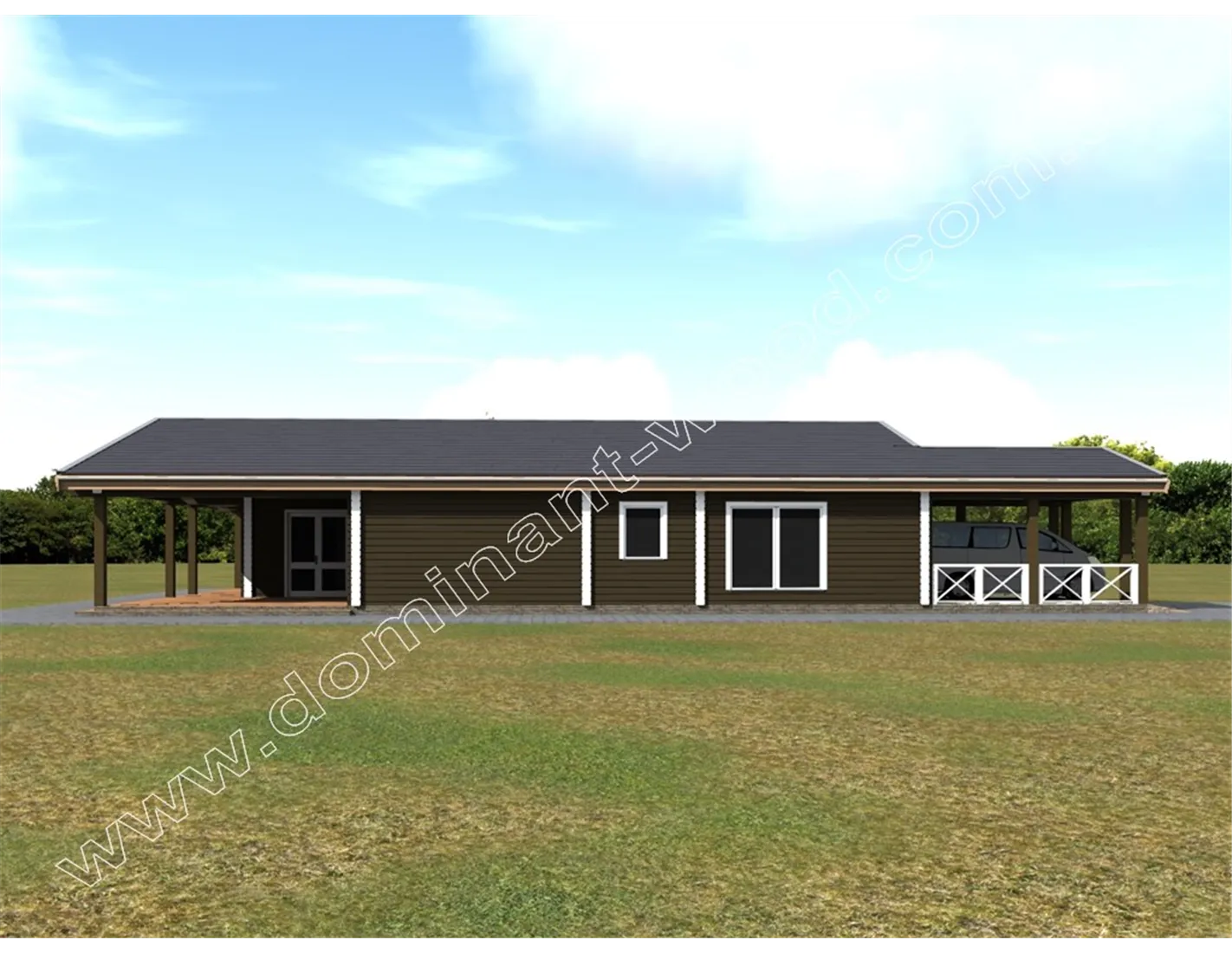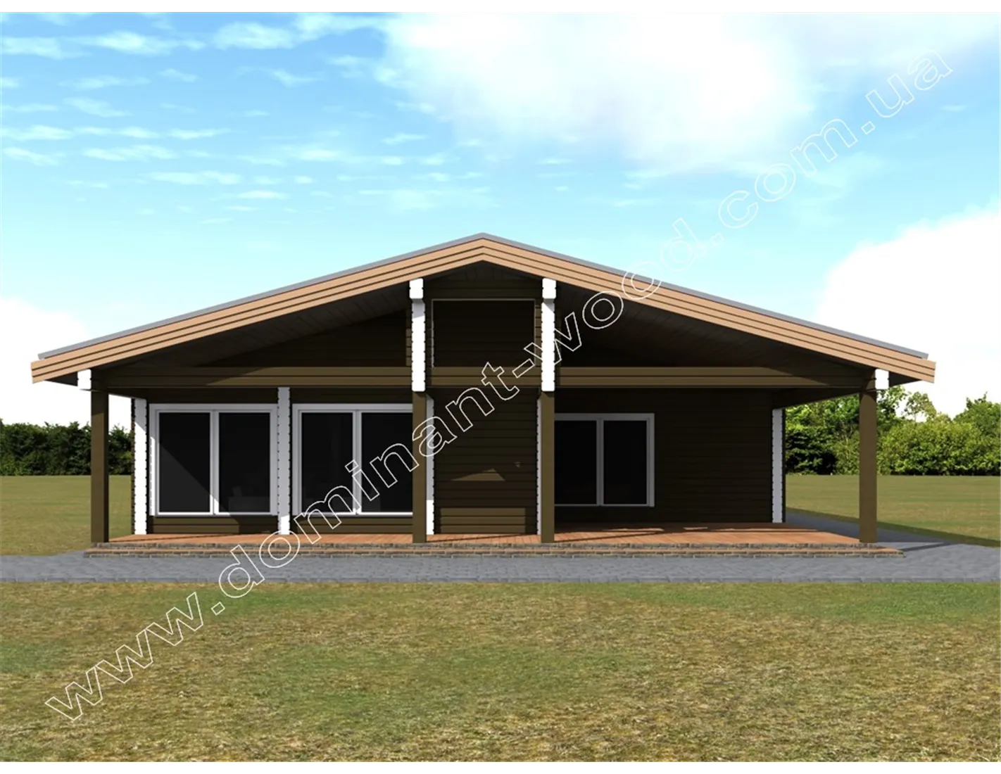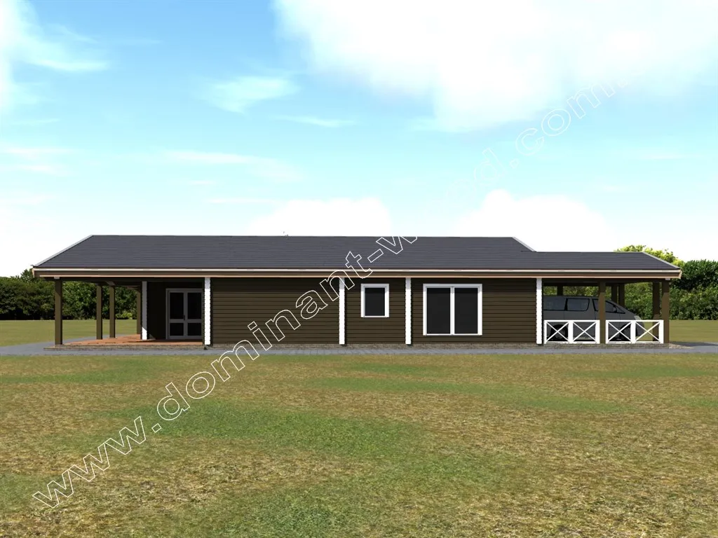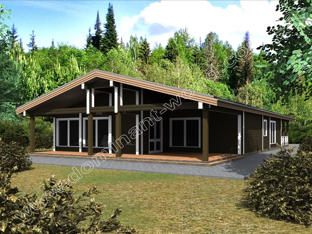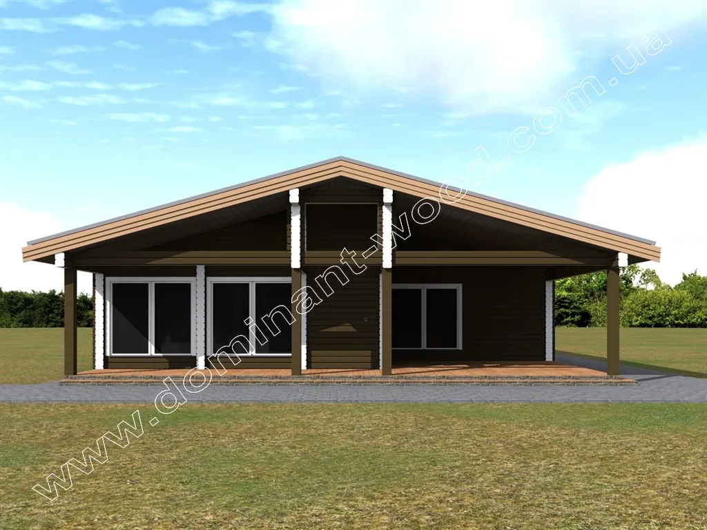 Під масивним дахом одноповерхового дерев’яного будинку «Естром» є не тільки житлові кімнати, але і величезна тераса, а також навіс для автомобіля. Проект «Естром» виконується з сухого соснового брусу. Тераса в обрамленні потужних дерев’яних колон викликає відчуття надійності і фундаментальності споруди. Громіздкість даху і навісів розбавлена легкістю, створюваної завдяки великим, панорамним вікнам. Істотна площа скління робить будинок витонченим і наповненим світлом. Якщо ви придивитеся до внутрішнього планування проекту, вона вам точно сподобається не менше, ніж ефектний екстер’єр дерев’яного зрубу.