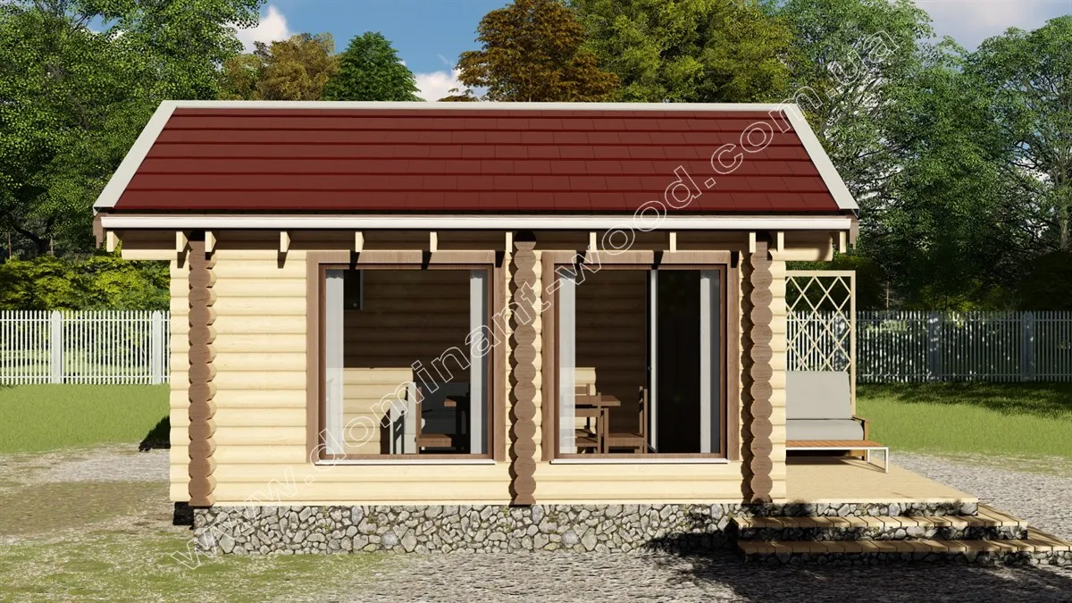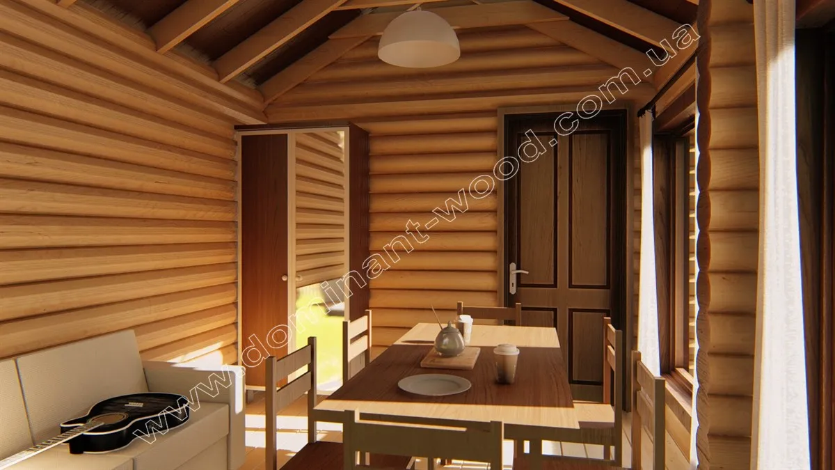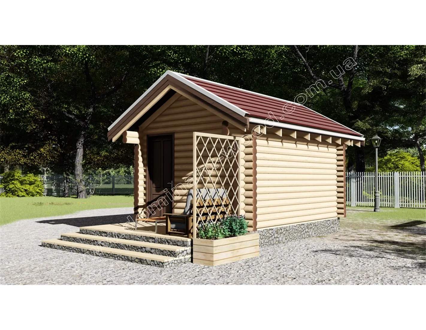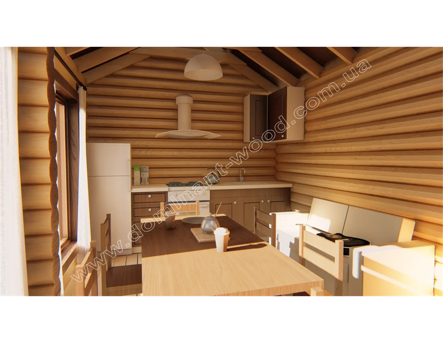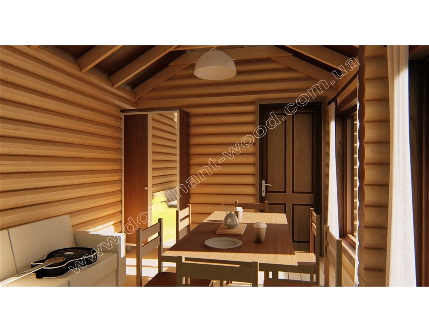 Зовнішній вигляд будиночка «Руна» відразу привертає увагу завдяки своїй чарівній мініатюрності. Немов іграшкова, зовнішня краса дерев’яного будиночка, відразу викликає бажання ознайомитися і з його внутрішнім плануванням. Проект «Руна» - це компактний, але функціональний будиночок, який може послужити в якості літньої кухні або альтанки. Одноповерхова споруда виконується в параметрах 3,2х6м, площа споруди складає 13,5 м2. Усередині літньої кухні передбачено одне приміщення, в якому спланована кухня, м’який диванчик і стіл зі стільцями. Два величезних вікна наповнюють котедж сонячним світлом і дають ефект присутності природи всередині будівлі. У той же час всі, хто знаходяться в будиночку, будуть надійно захищені від вітру, дощу або сильної спеки.