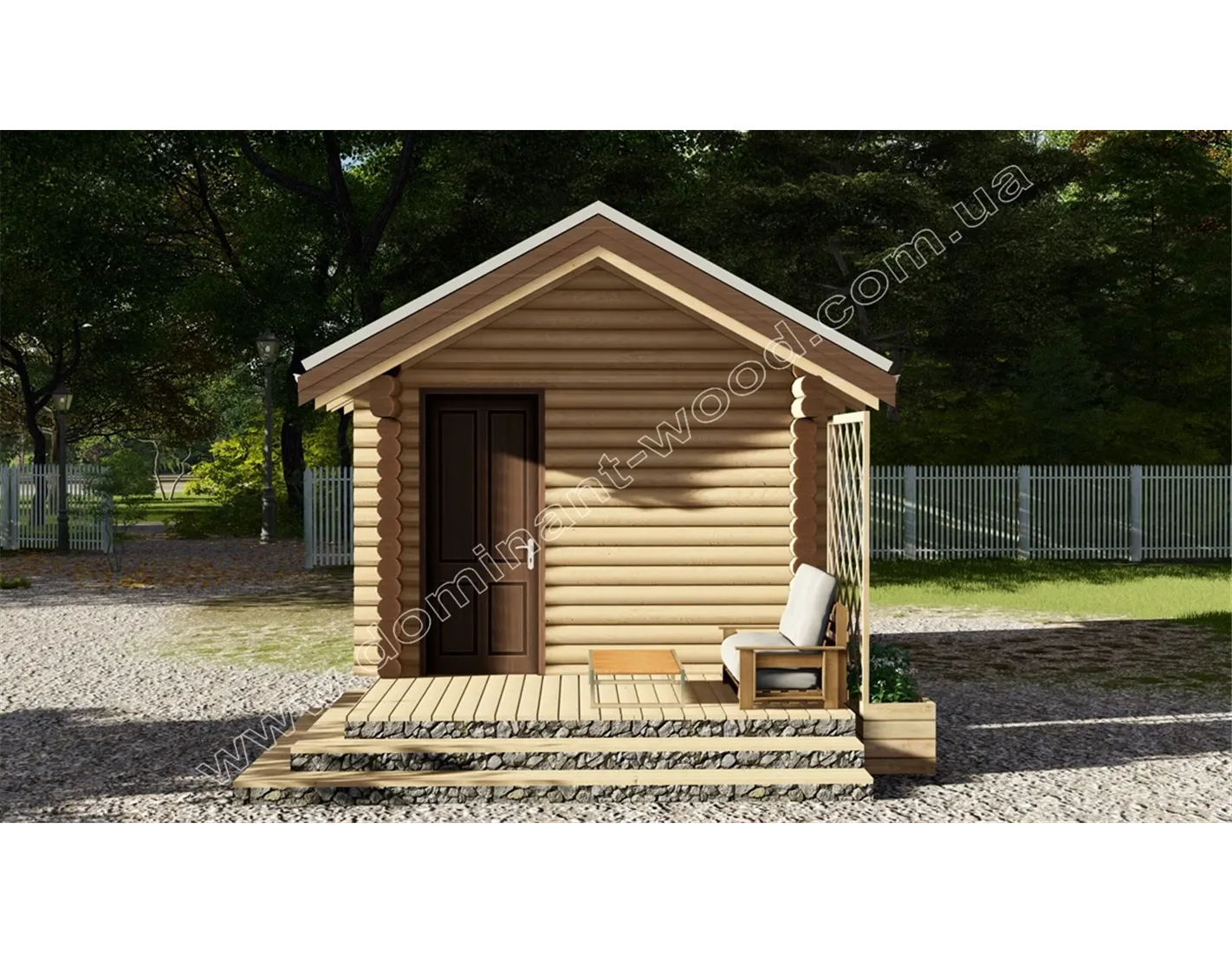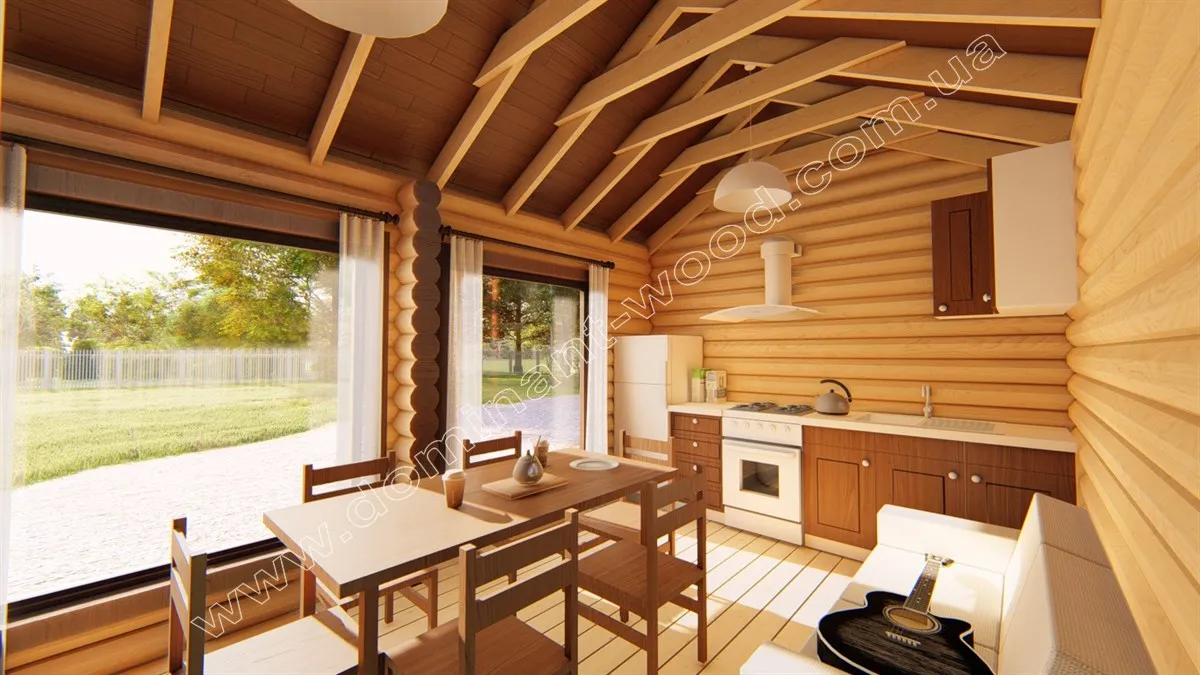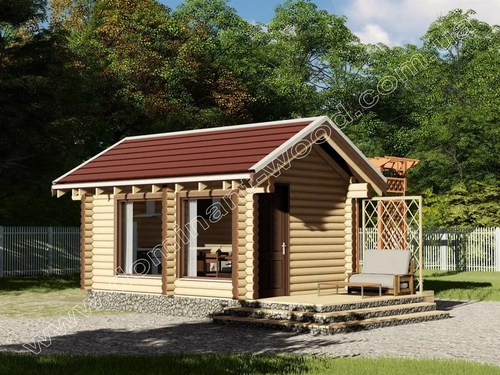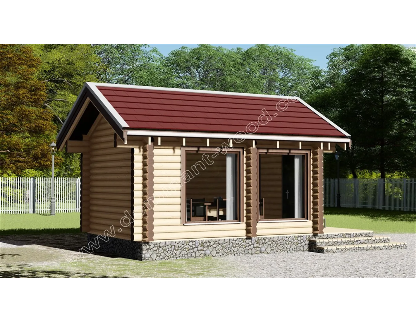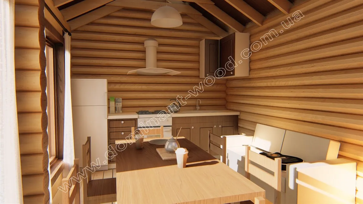 Зовнішній вигляд будиночка «Руна» відразу привертає увагу завдяки своїй чарівній мініатюрності. Немов іграшкова, зовнішня краса дерев’яного будиночка, відразу викликає бажання ознайомитися і з його внутрішнім плануванням. Проект «Руна» - це компактний, але функціональний будиночок, який може послужити в якості літньої кухні або альтанки. Одноповерхова споруда виконується в параметрах 3,2х6м, площа споруди складає 13,5 м2. Усередині літньої кухні передбачено одне приміщення, в якому спланована кухня, м’який диванчик і стіл зі стільцями. Два величезних вікна наповнюють котедж сонячним світлом і дають ефект присутності природи всередині будівлі. У той же час всі, хто знаходяться в будиночку, будуть надійно захищені від вітру, дощу або сильної спеки.